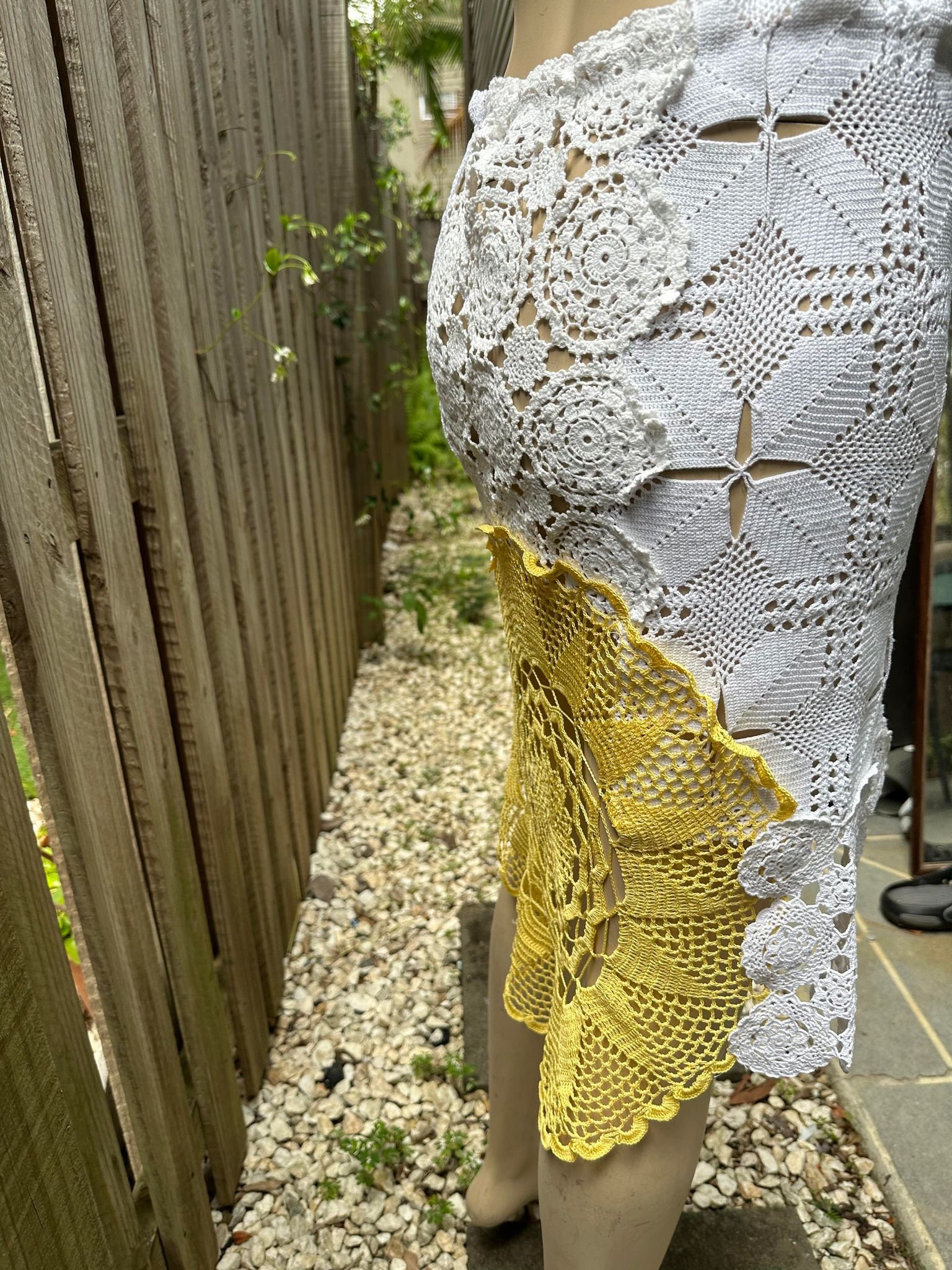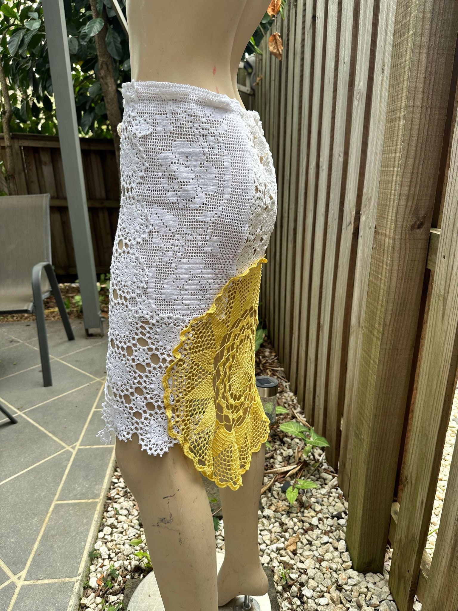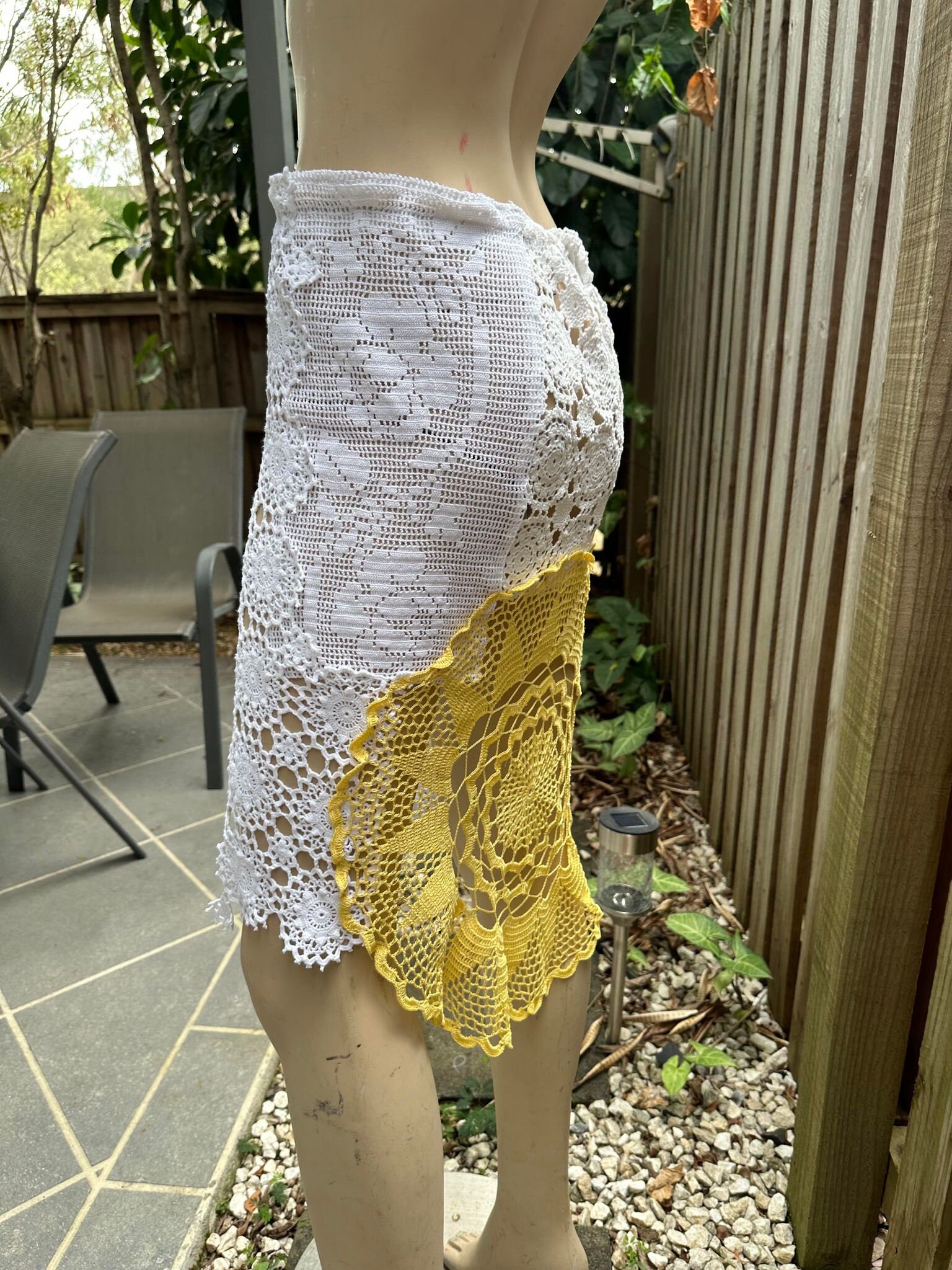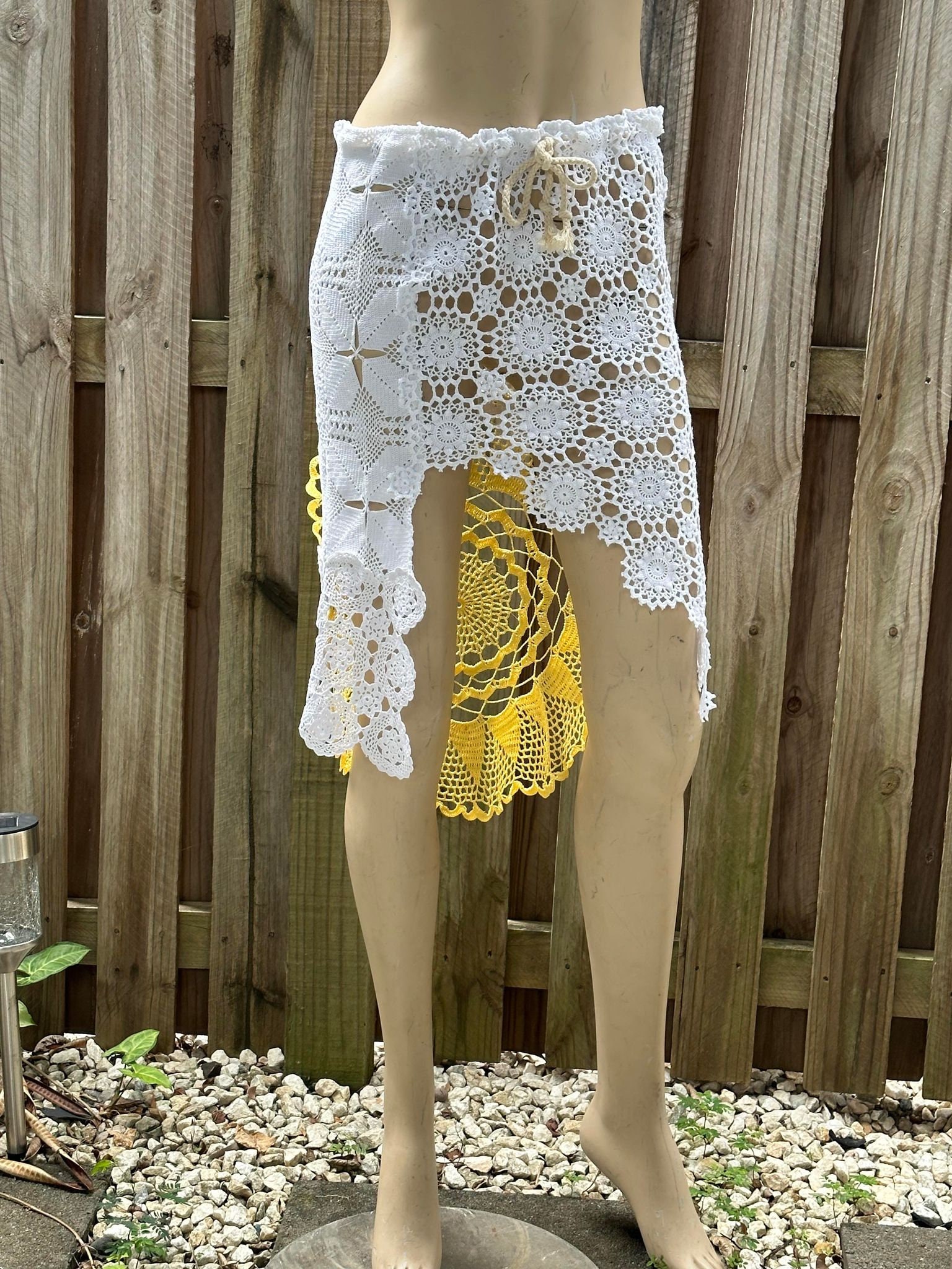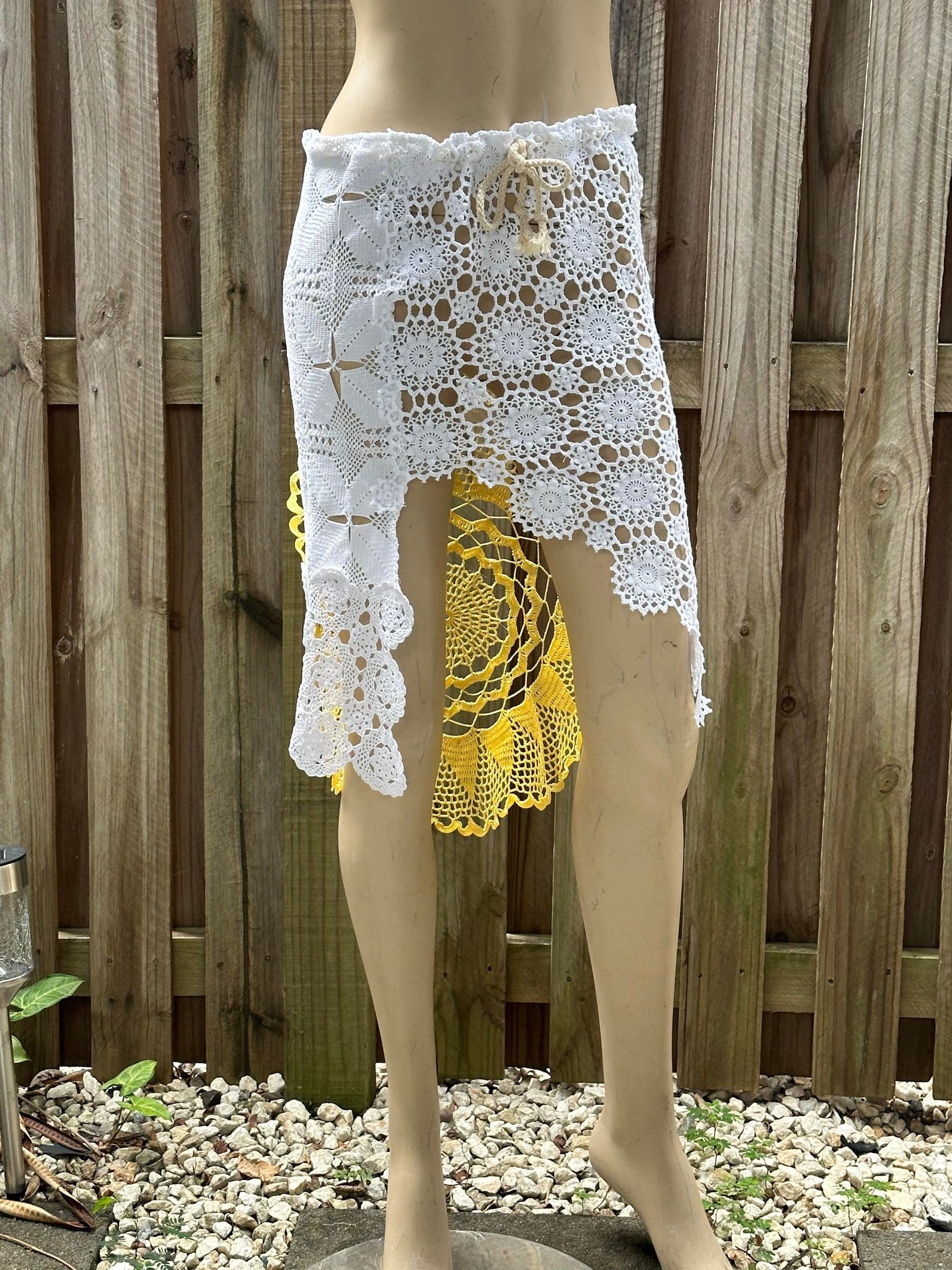 women skirt crochet lace skirt beach skirt crochet patch skirt yellow white skirt adjustable skirt front open skirt trendy skirt unique skirt size