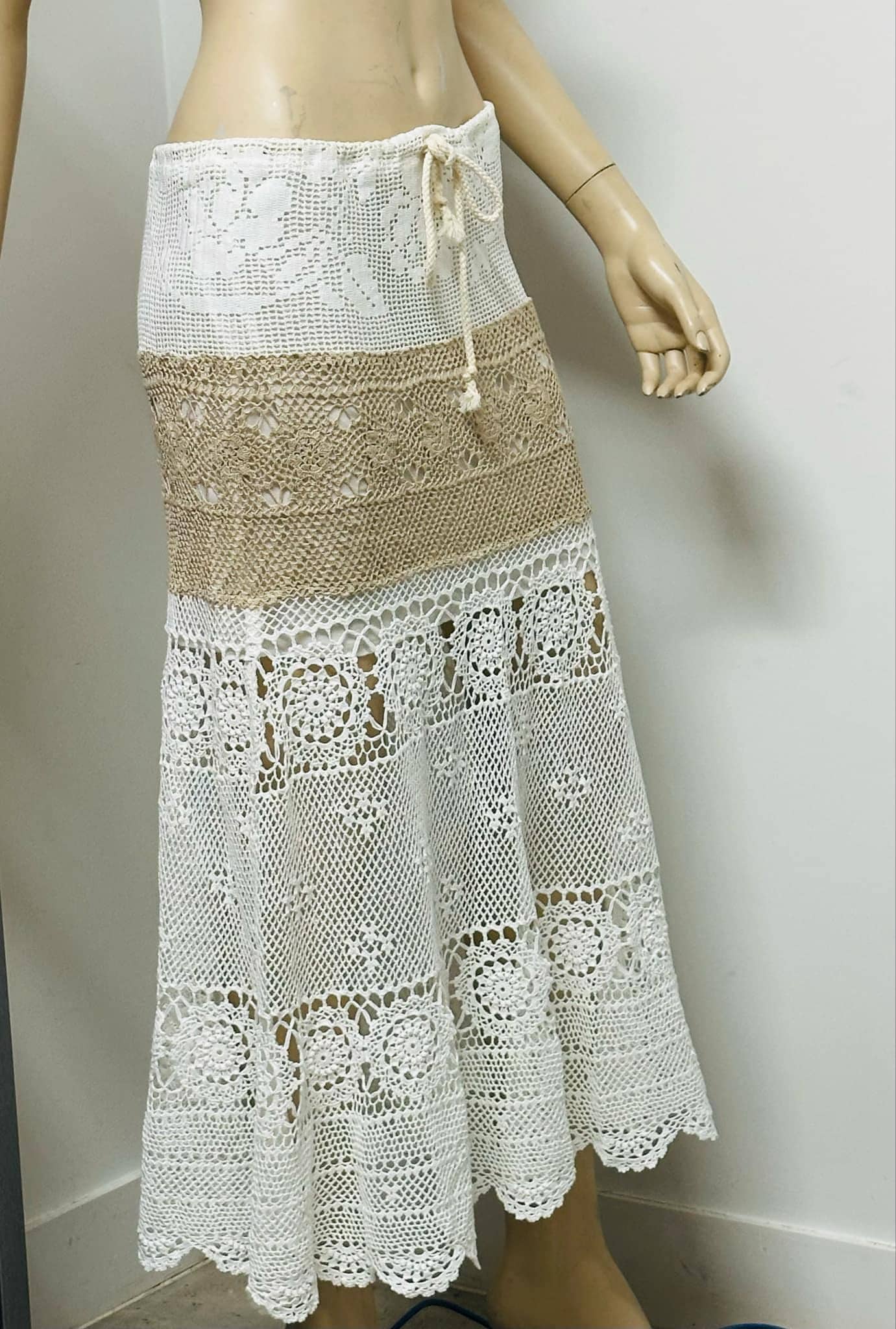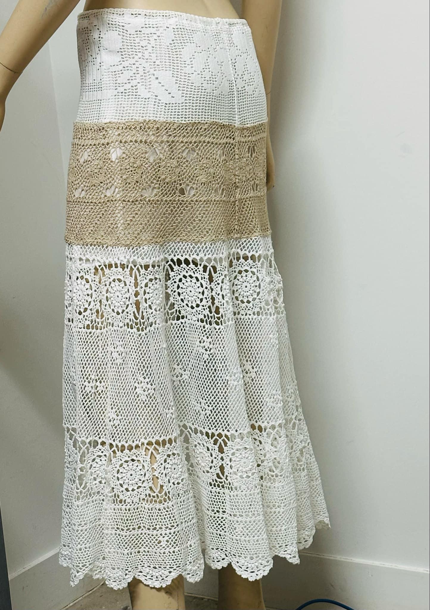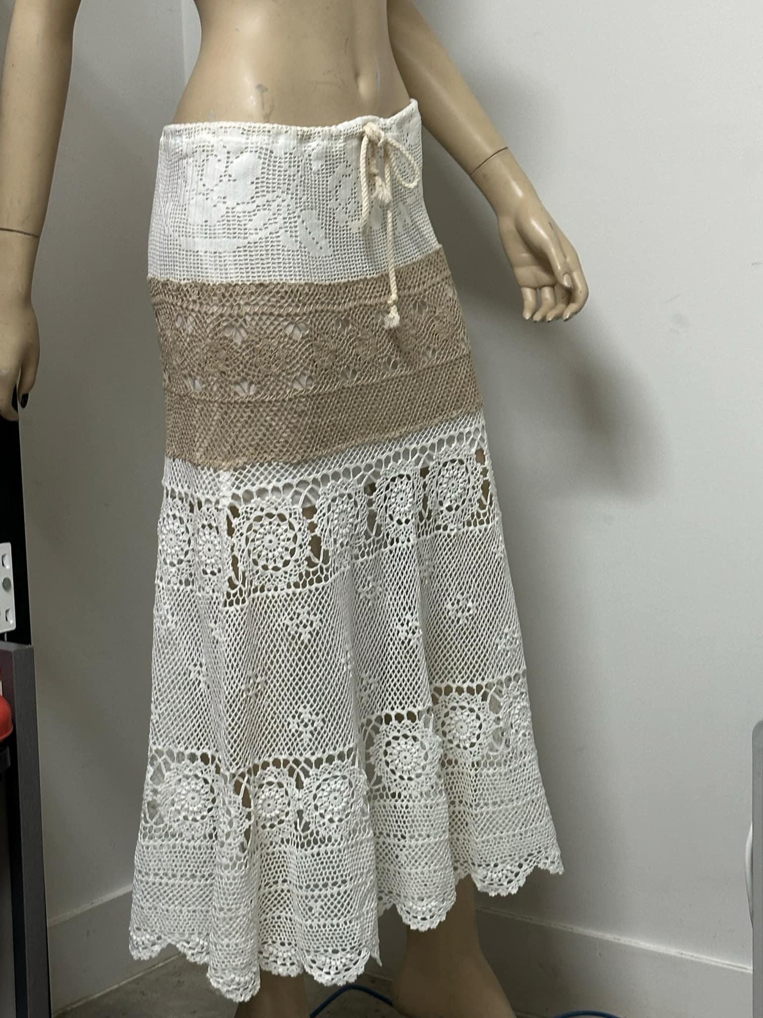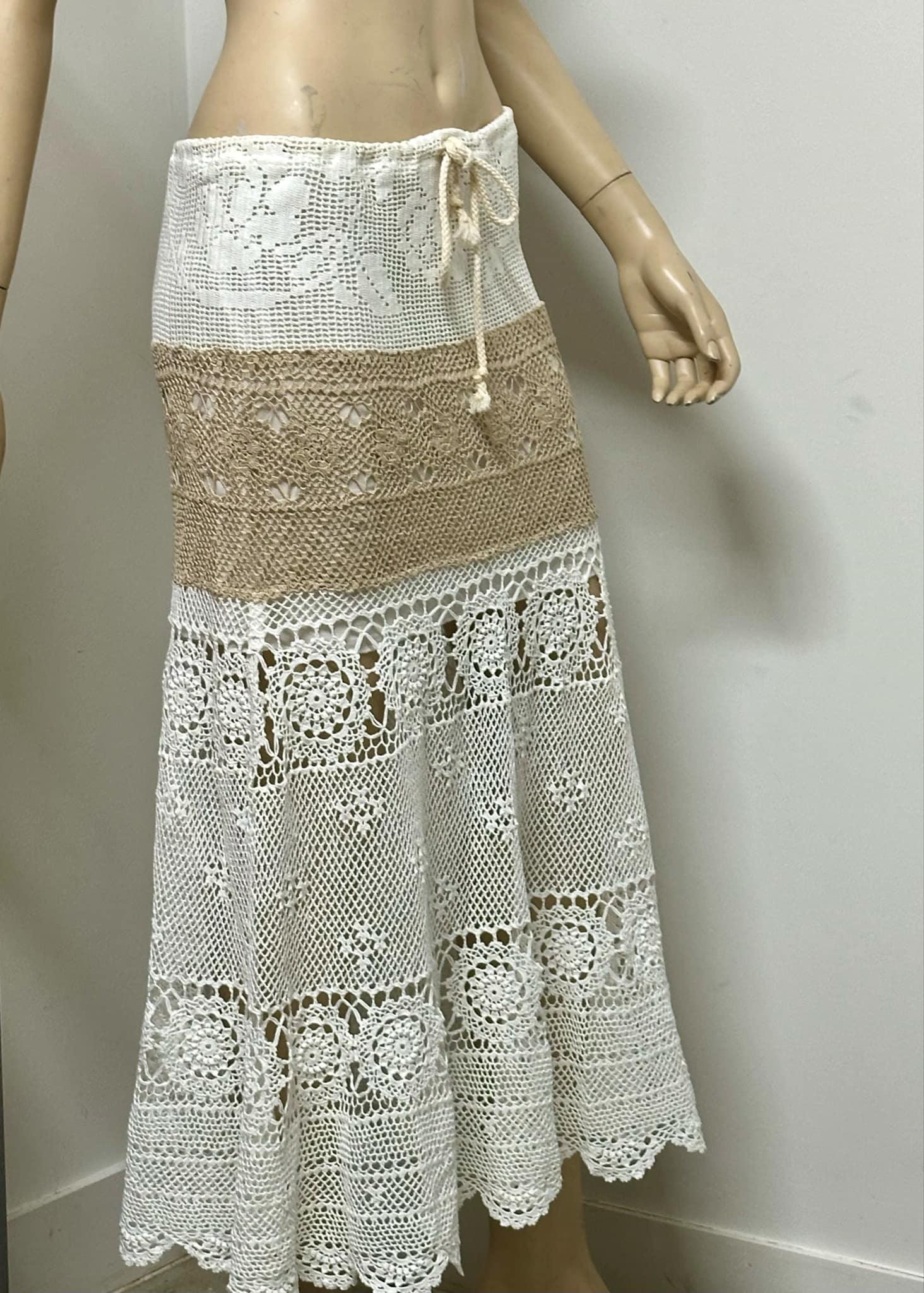 Embrace the allure of timeless elegance with our precisely crafted crochet ensemble. This exquisite two-piece set features a gracefully designed long skirt, perfect for a beach wedding or a holiday getaway. The intricately detailed lacework adds a touch of sophistication to the ensemble, making it a unique and cherished outfit. Ideal for gifting or celebrating special occasions! > Lined >Adjustable waist for a perfect fit, > Authentic belt in two charming colours—beige and white. >The off-shoulder top complements the ensemble, allowing for an adjustable fit around the shoulders. Experience the charm of this new vintage-inspired lace attire, tailored for those who appreciate the finer things in life.