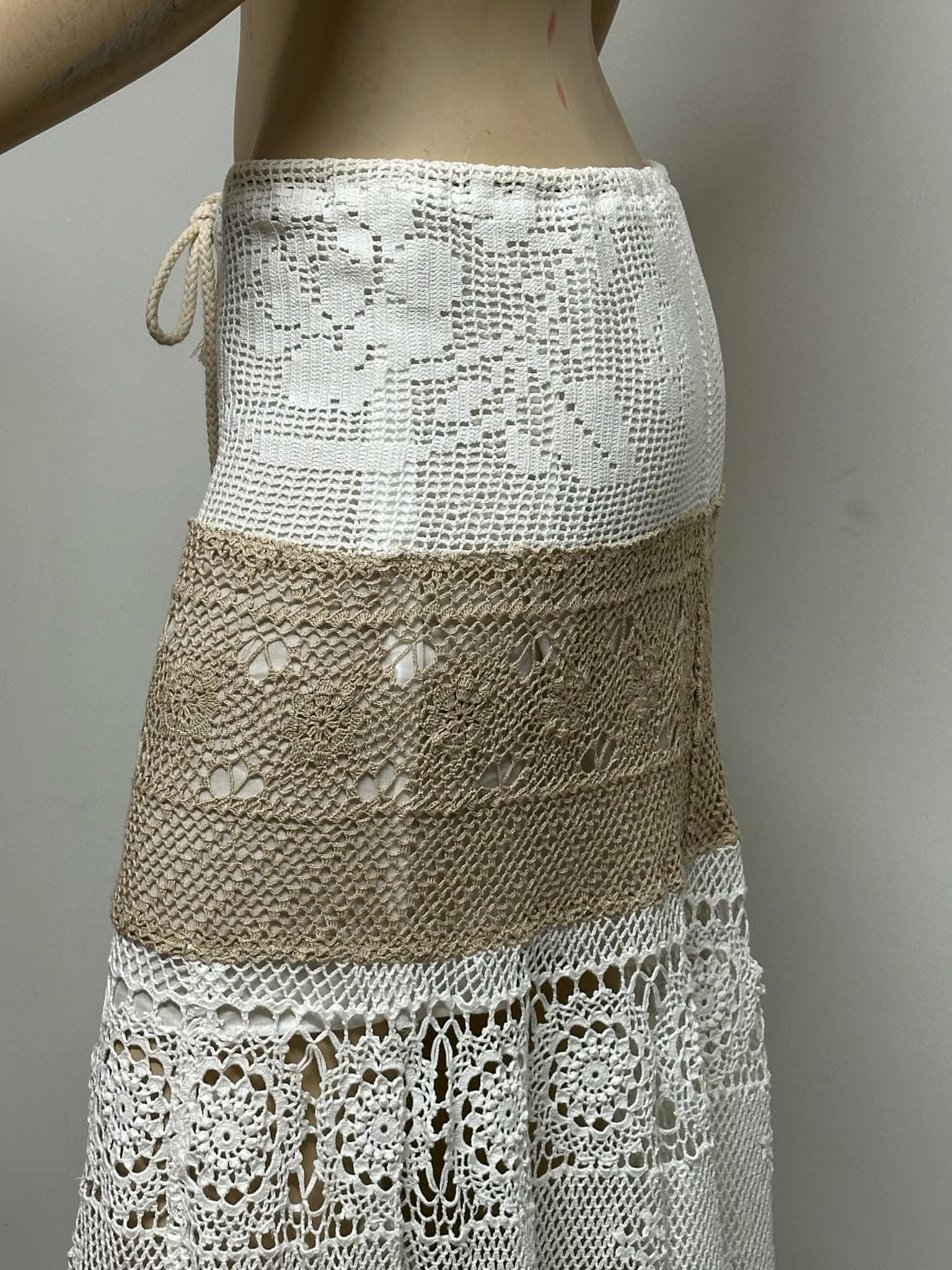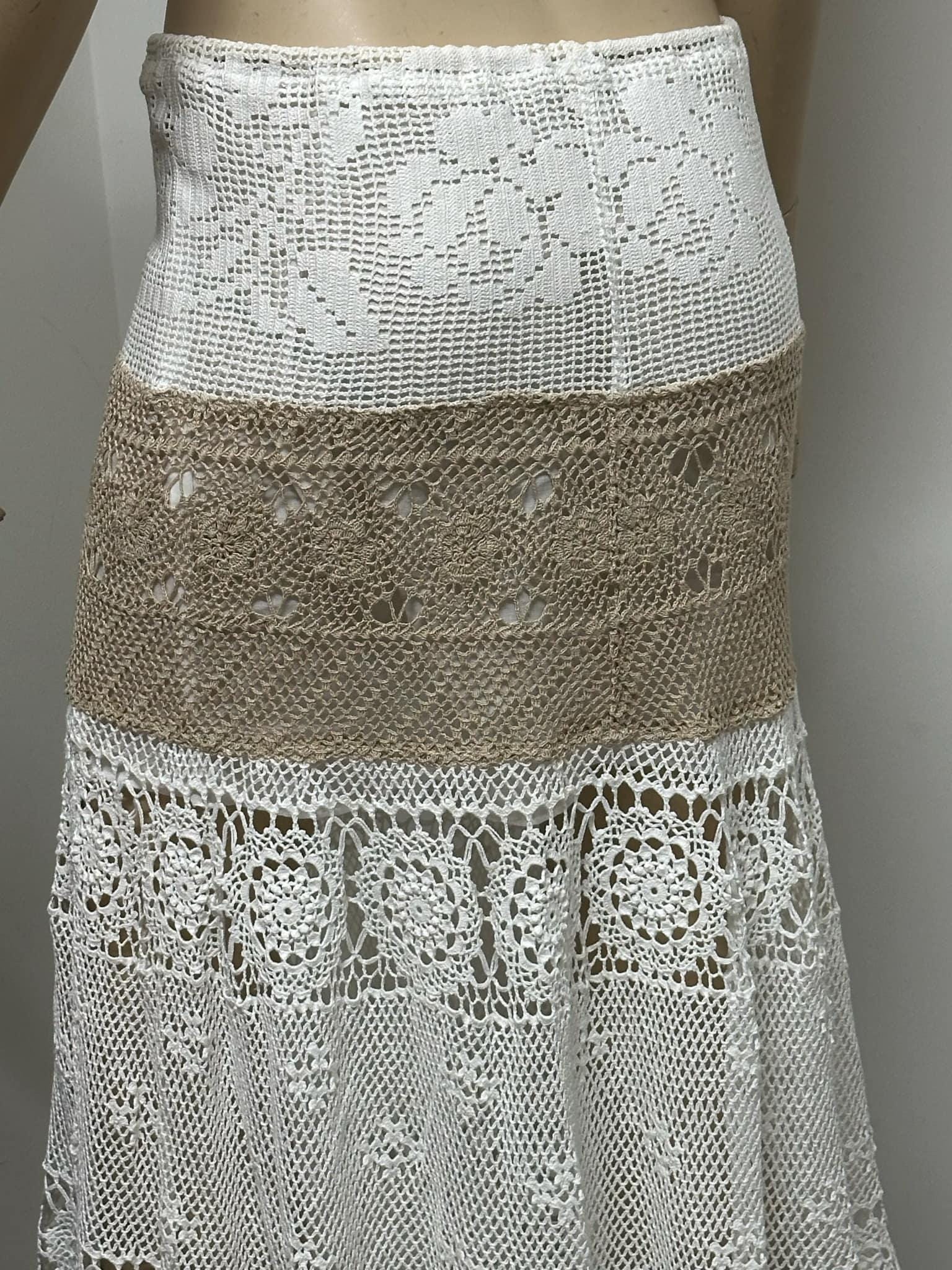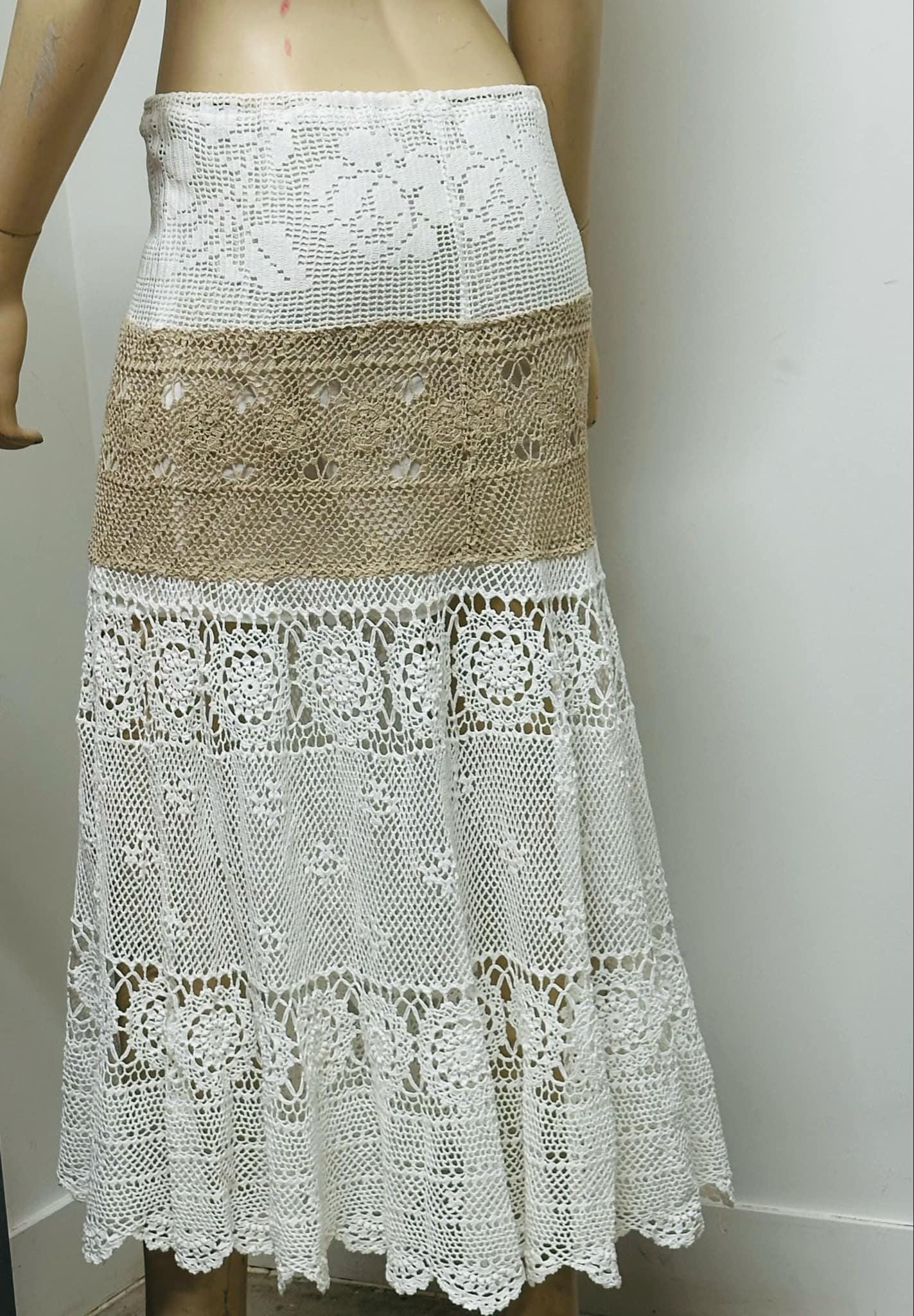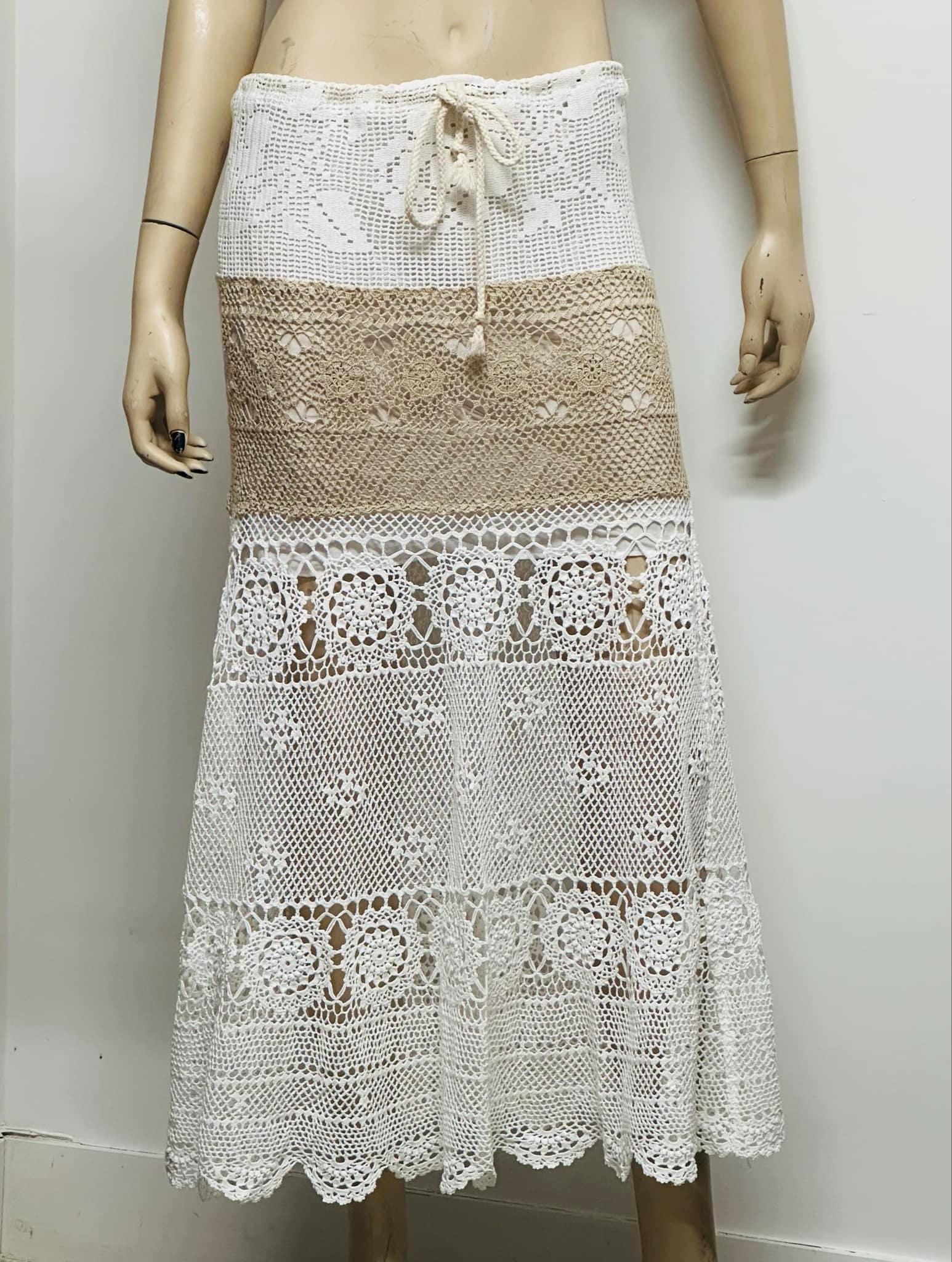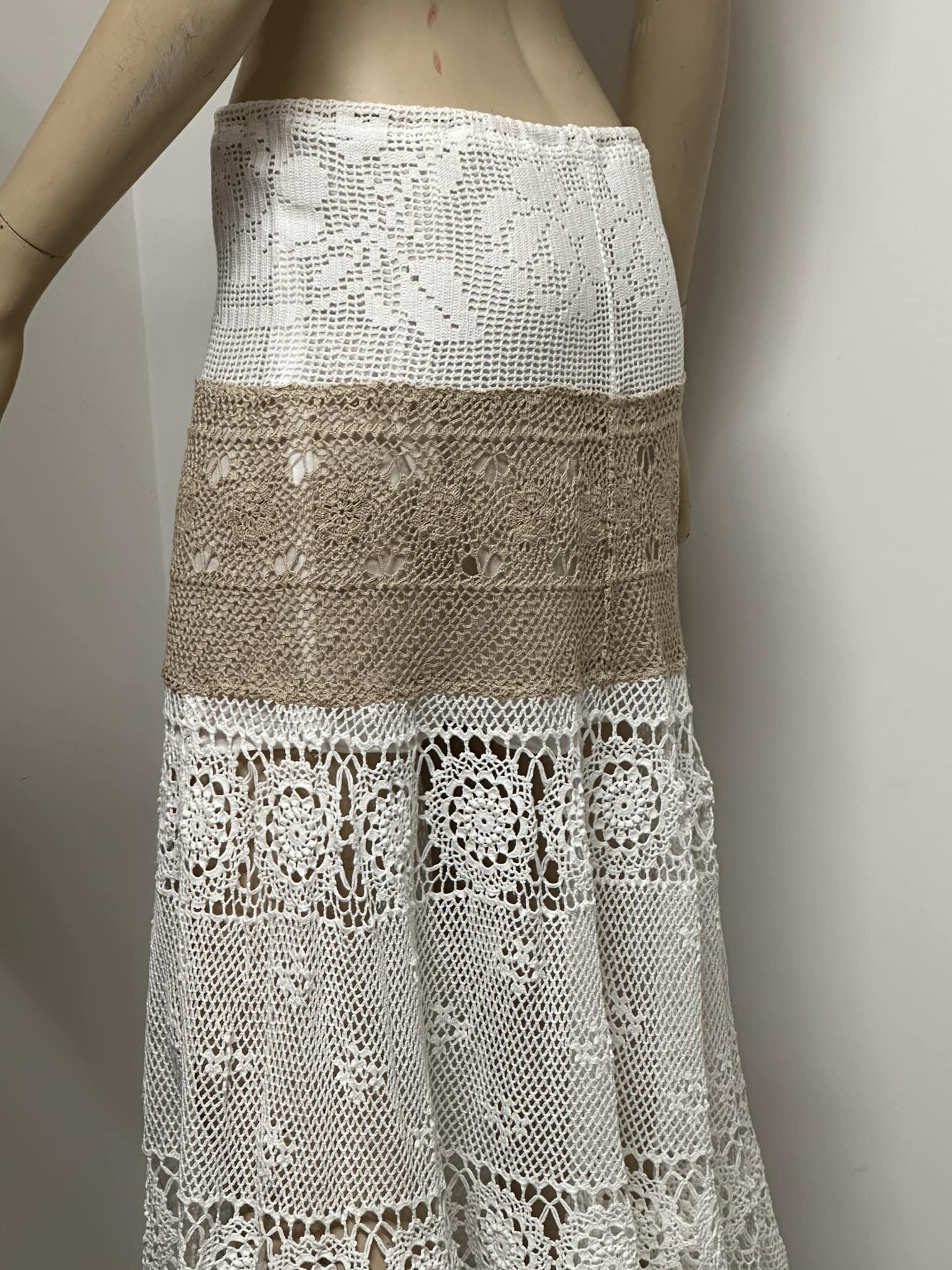 Embrace the allure of timeless elegance with our precisely crafted crochet ensemble. This exquisite two-piece set features a gracefully designed long skirt, perfect for a beach wedding or a holiday getaway. The intricately detailed lacework adds a touch of sophistication to the ensemble, making it a unique and cherished outfit. Ideal for gifting or celebrating special occasions! > Lined >Adjustable waist for a perfect fit, > Authentic belt in two charming colours—beige and white. >The off-shoulder top complements the ensemble, allowing for an adjustable fit around the shoulders. Experience the charm of this new vintage-inspired lace attire, tailored for those who appreciate the finer things in life.