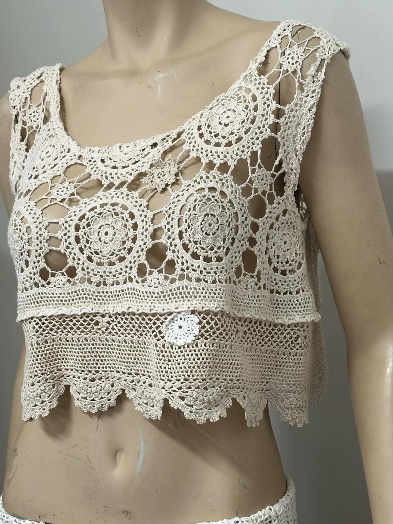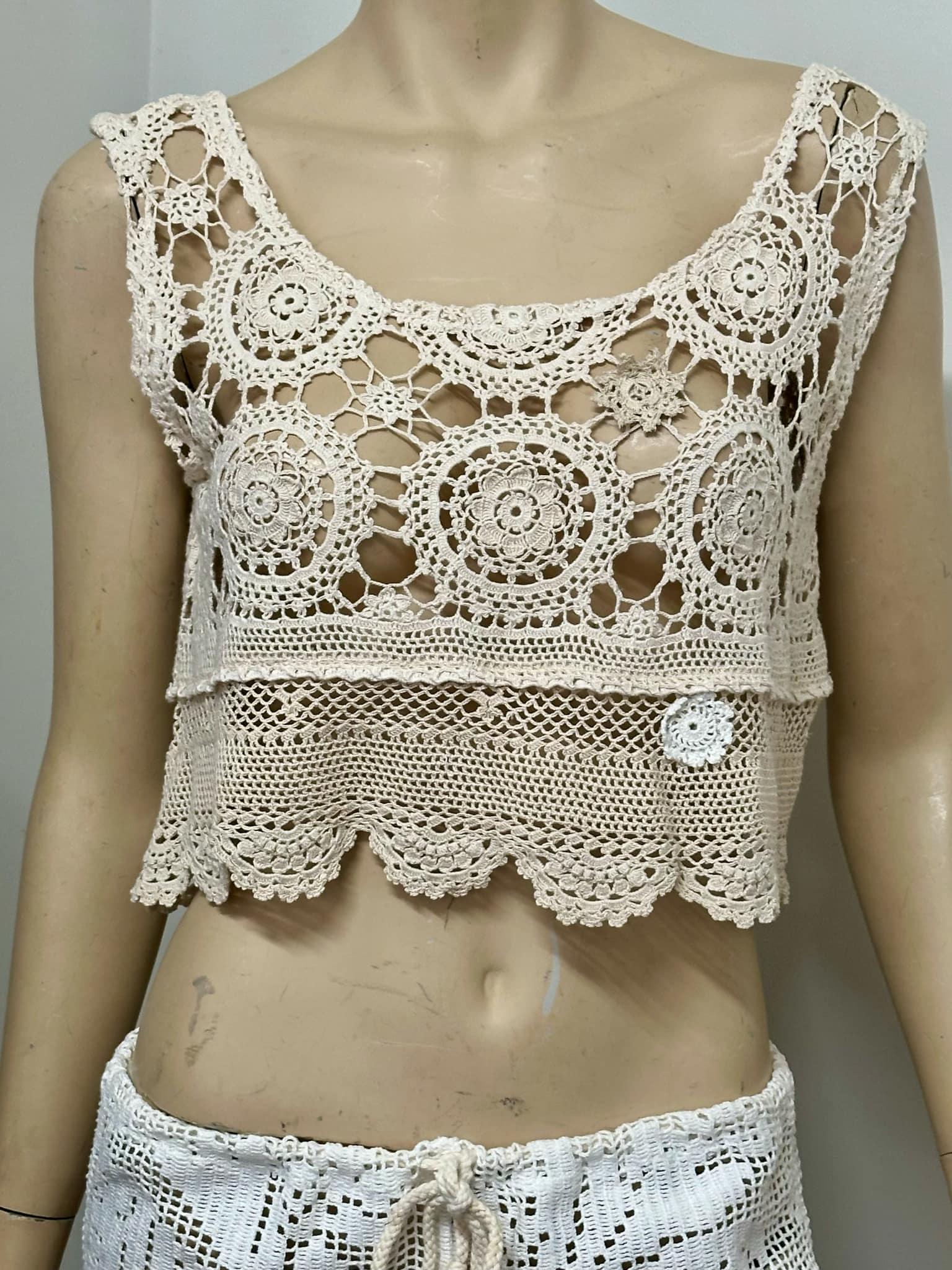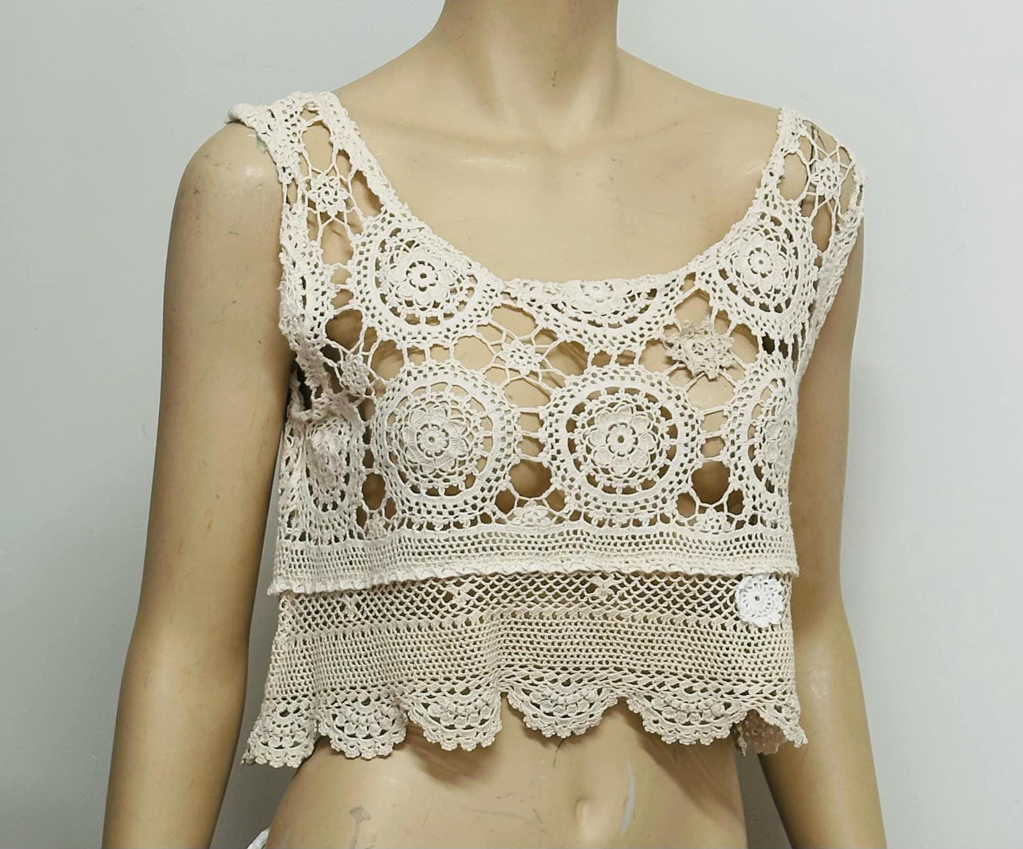 I design and sew these very beautiful and valuable laces myself. I recommend not to miss this top which fits the trend of the year and is the only piece of its kind. It could be a Great option for festivals, and also as a gift option as it is a very special piece and handmade. color beige cotton crochet lace cotton crop top the size on mannequin is XS-S(size 6-8) and there's crochet lace top summer women beach top wedding beach top holiday beautiful