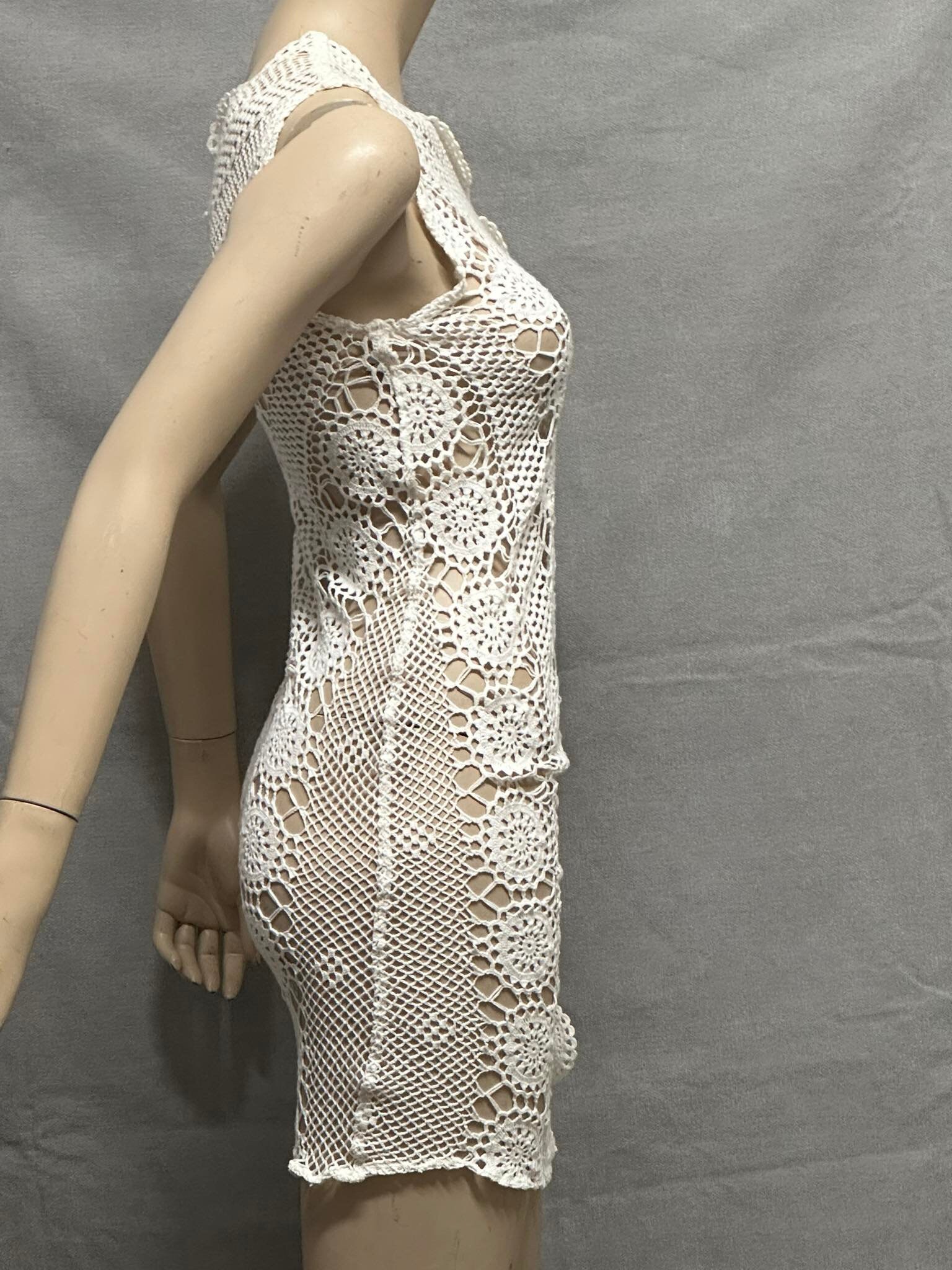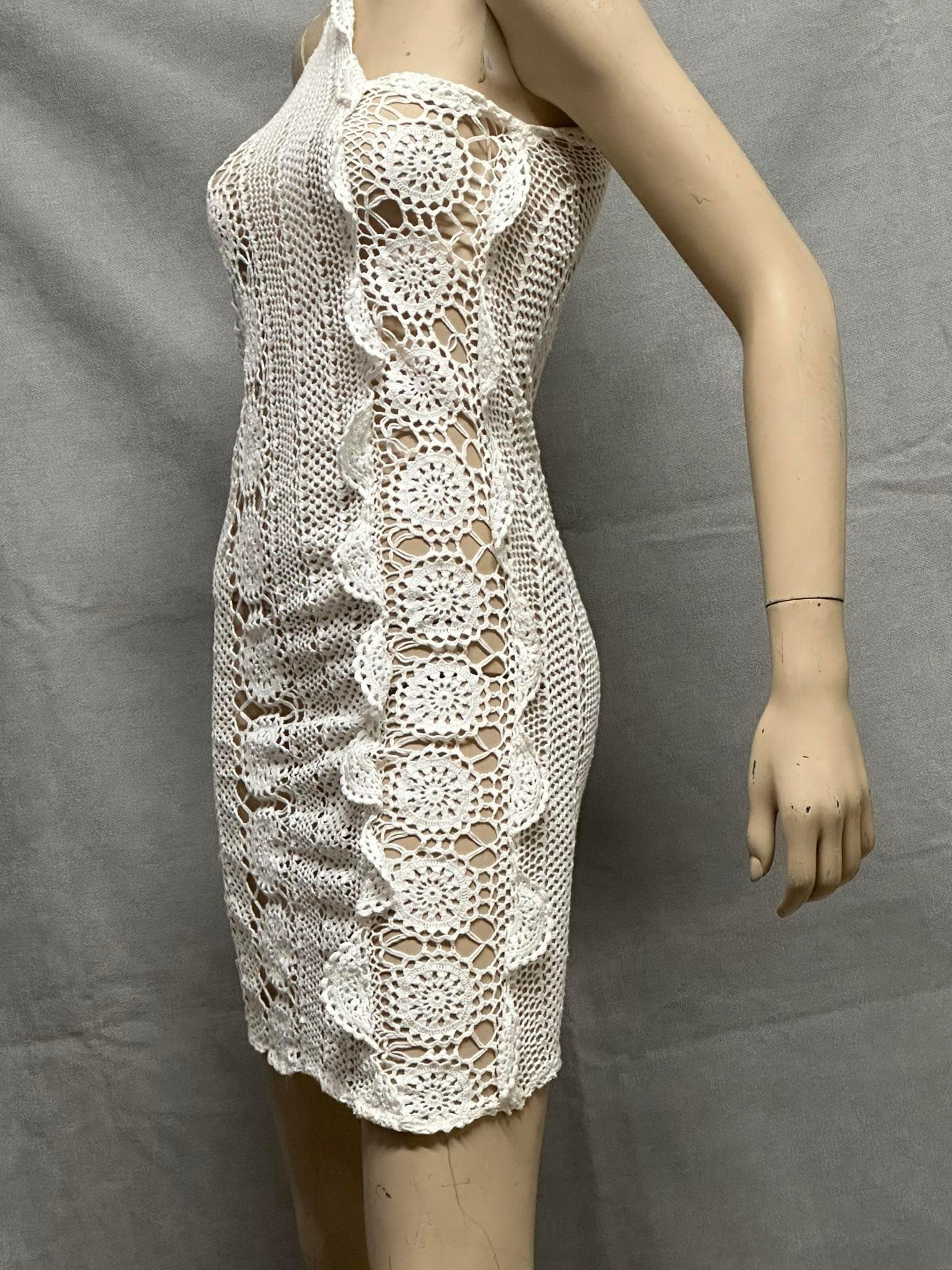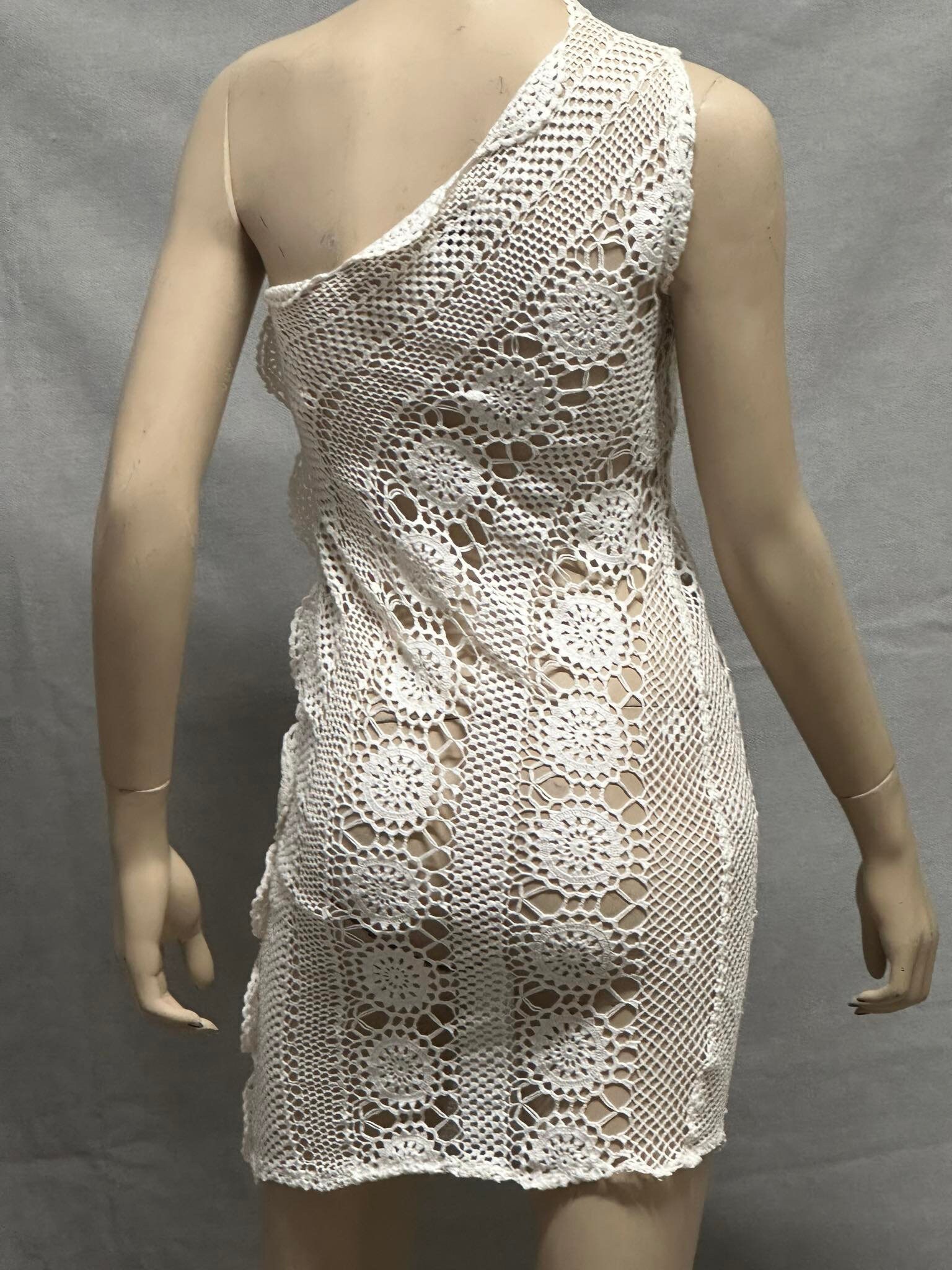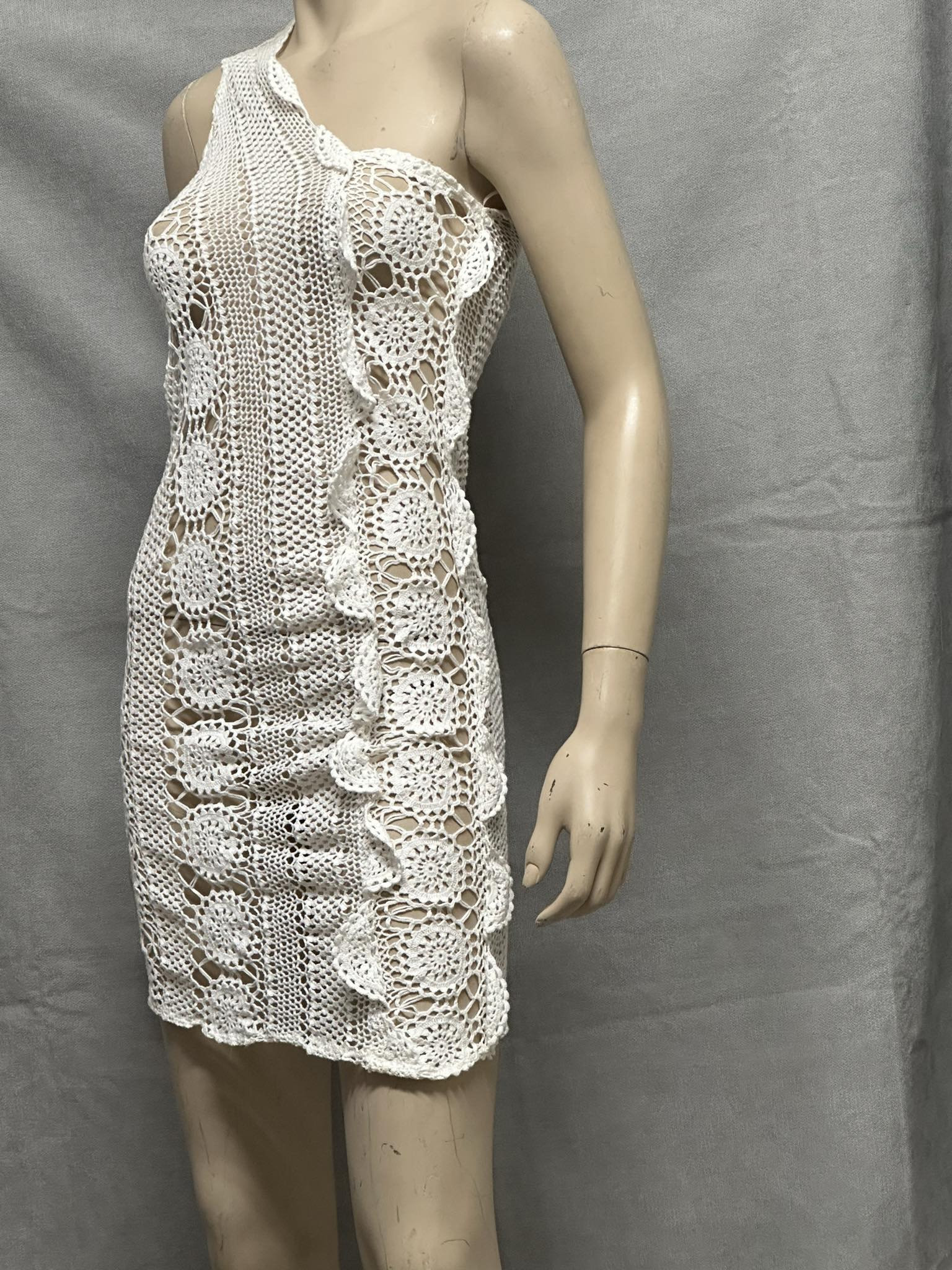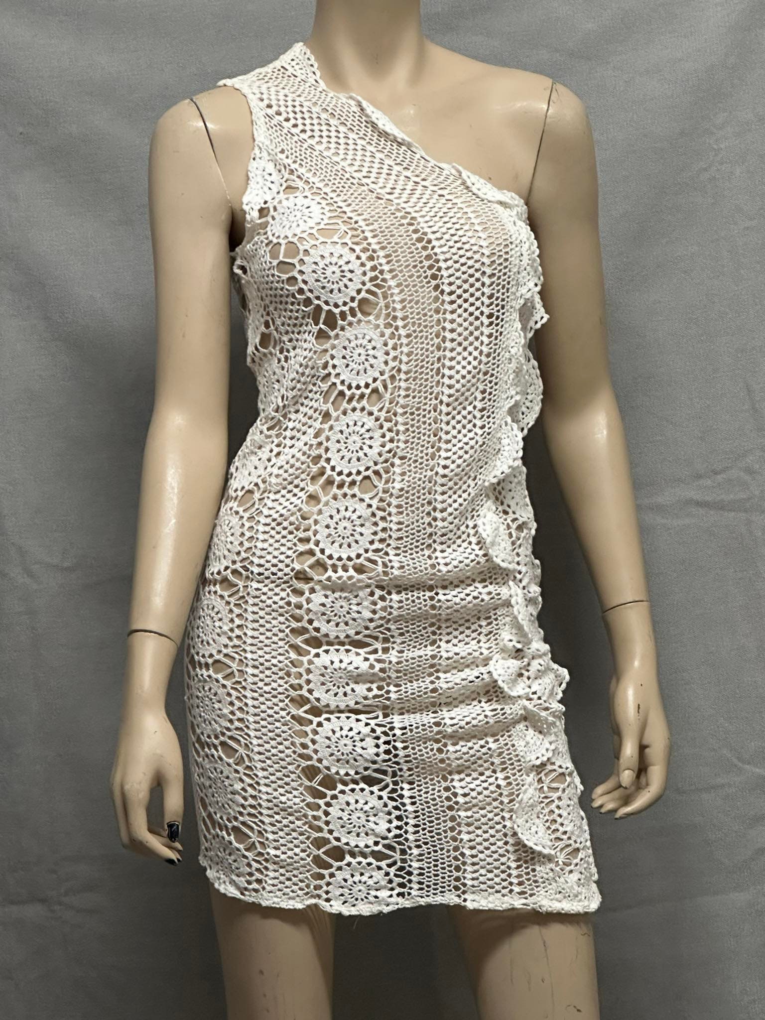 Favorite for Twenty Percent Off Step into sun-soaked style with this handmade one-shoulder crochet beach dress—the ultimate boho cover-up for pool parties, beach days, or festival adventures. Crafted from soft, breathable 100% cotton yarn in an openwork floral-circle motif, this mini dress slips on effortlessly and drapes beautifully over your swimsuit or a slip.