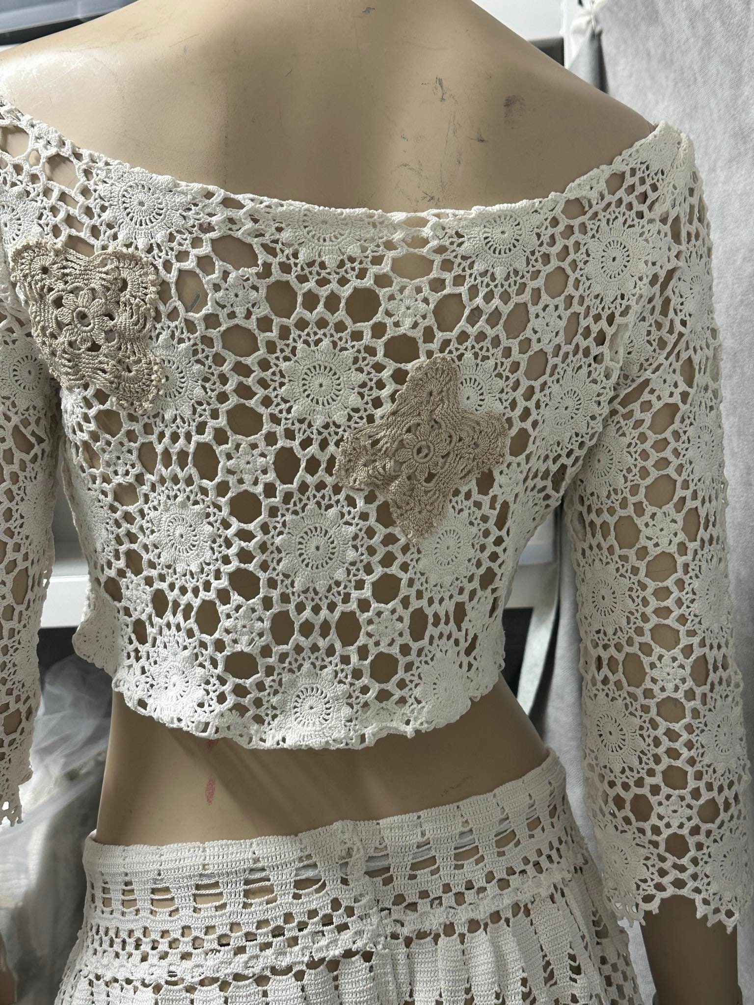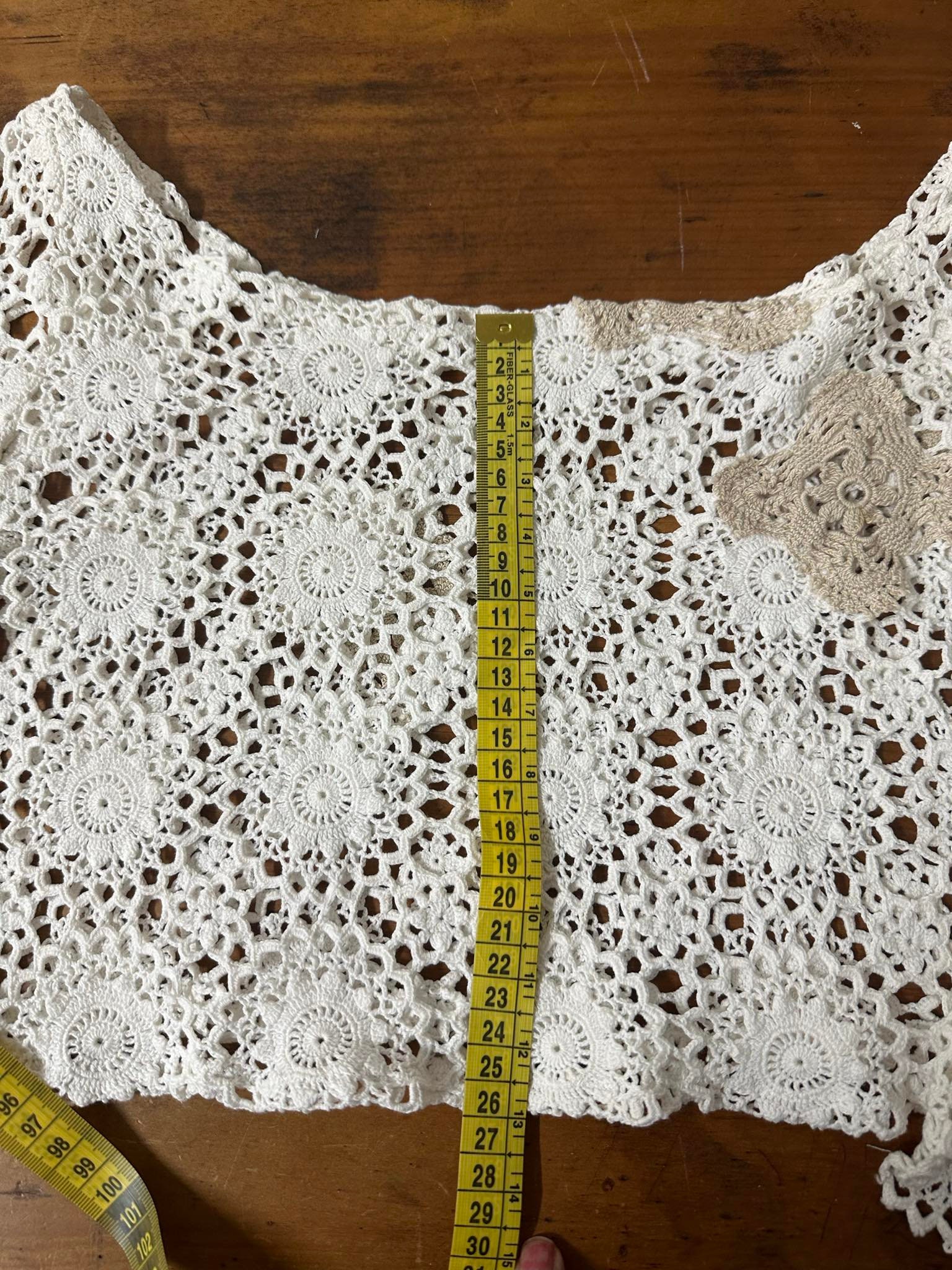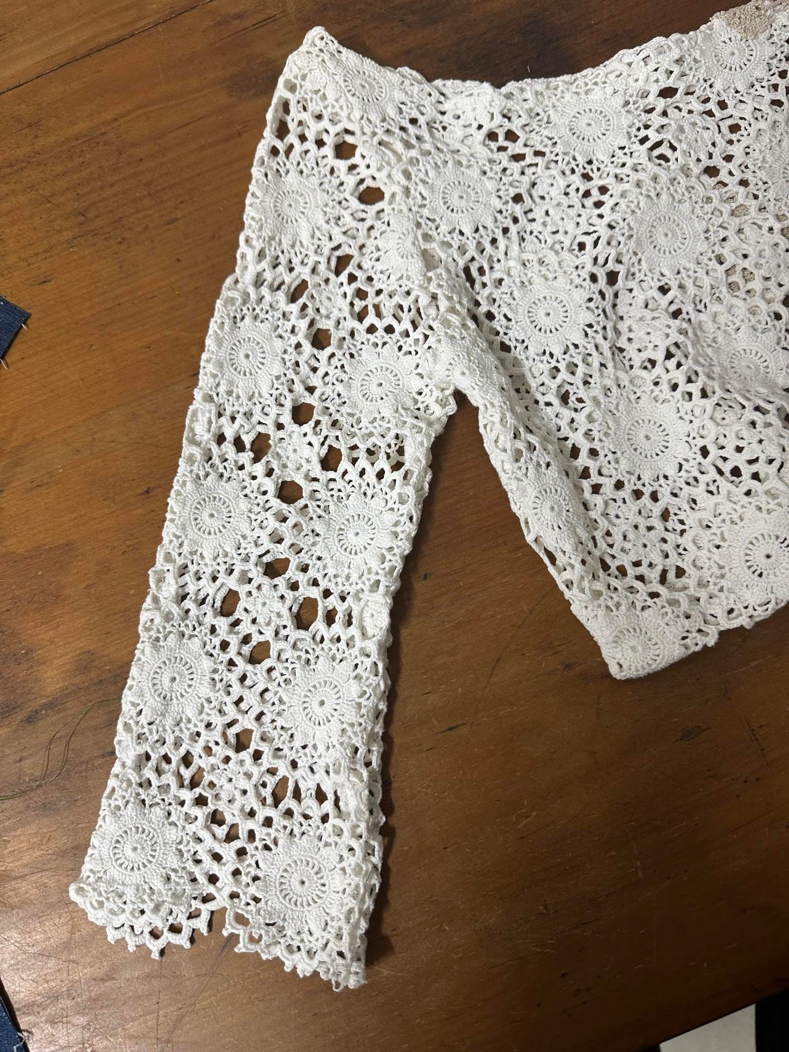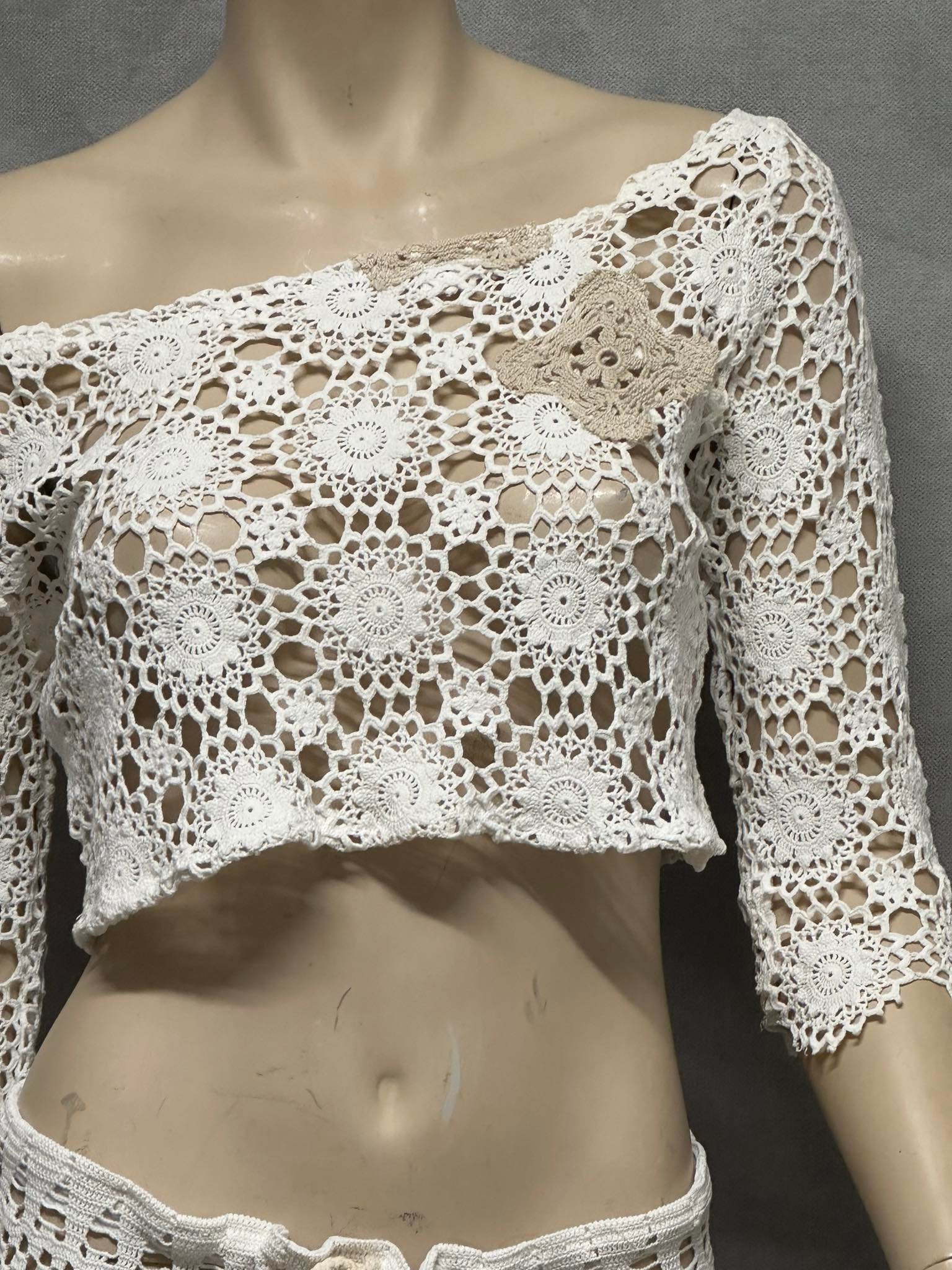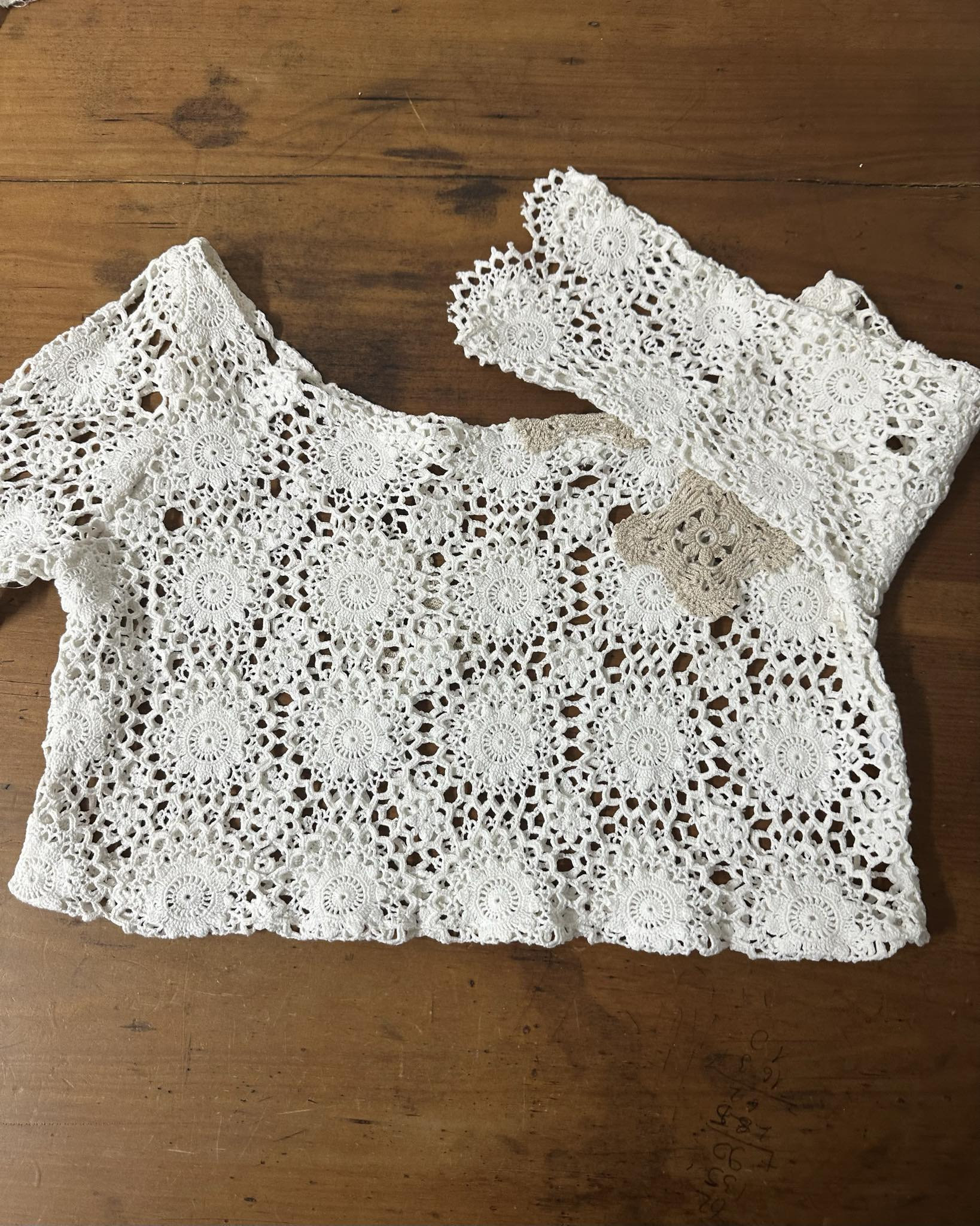 Favorite for Twenty Percent Off This unique handmade crochet crop top features an intricate floral lace design and off-the-shoulder style for an effortless boho vibe. The piece is see-through and lightweight, perfect for layering over swimwear or a bralette. It’s made from repurposed vintage crochet lace and showcases 3/4 length sleeves and a flattering cropped cut.