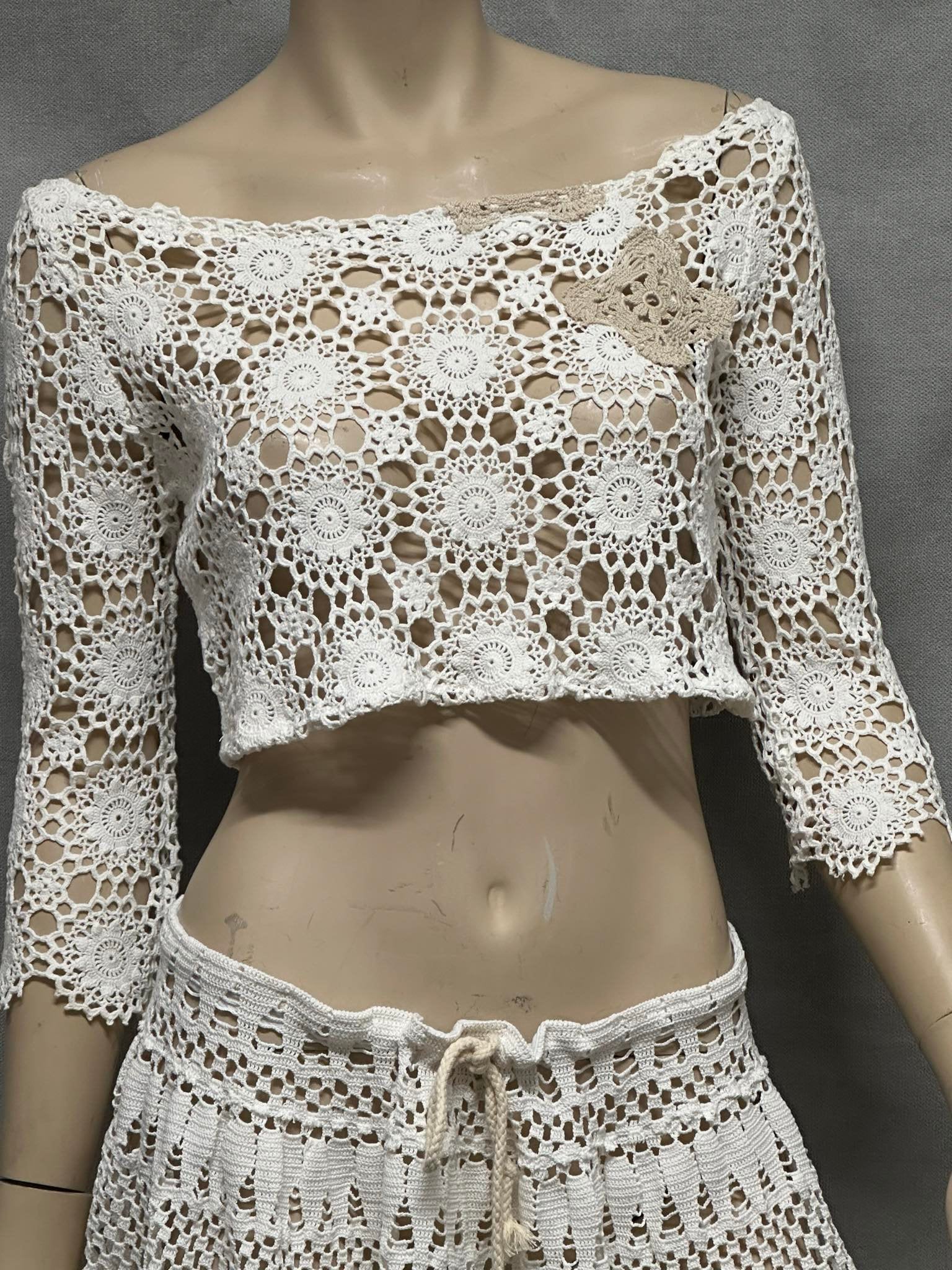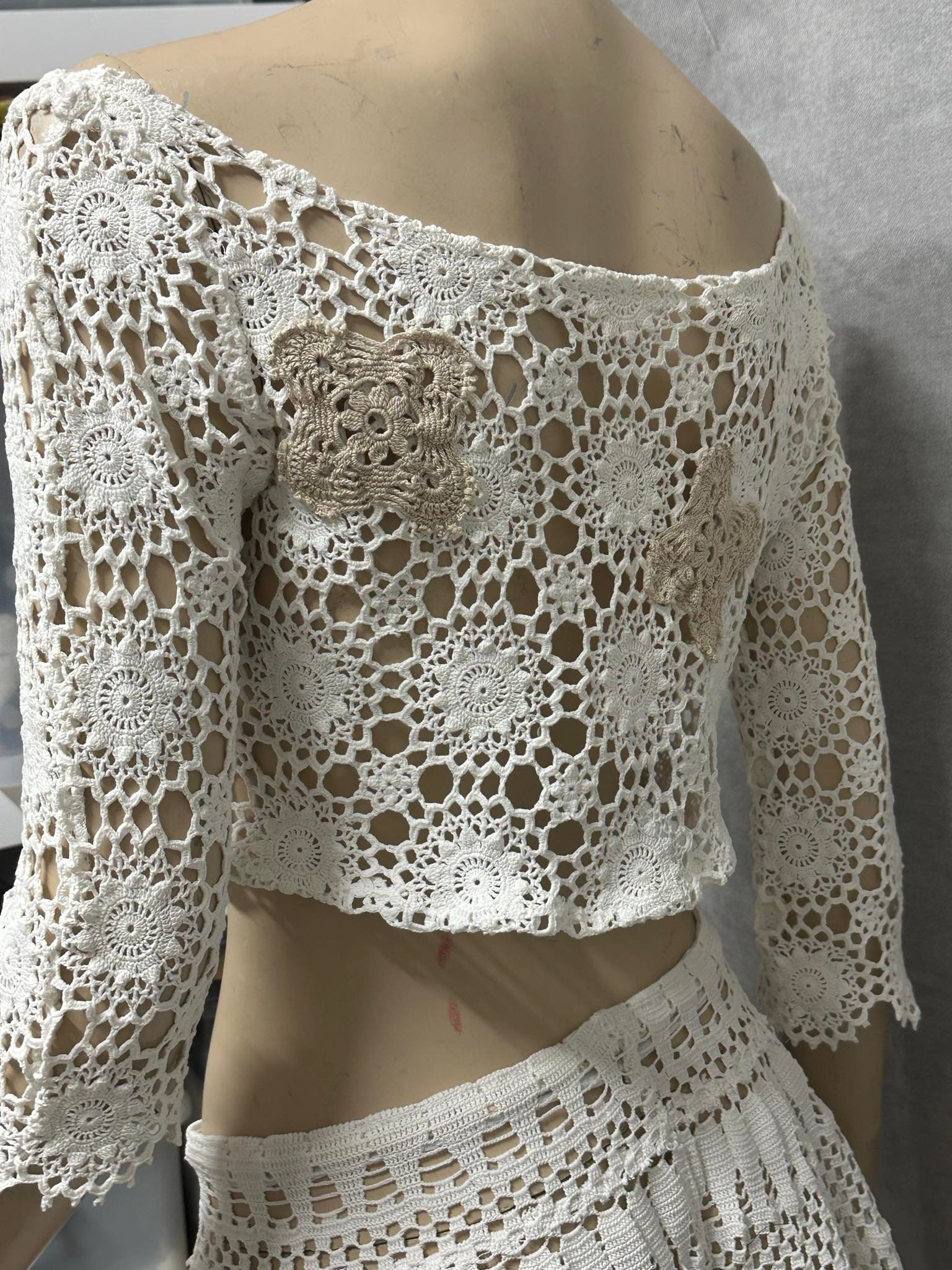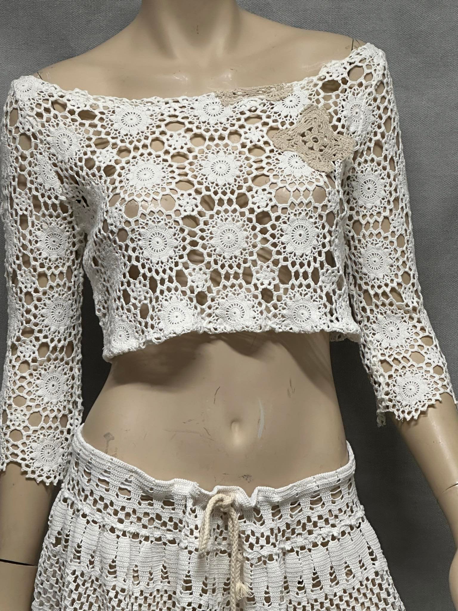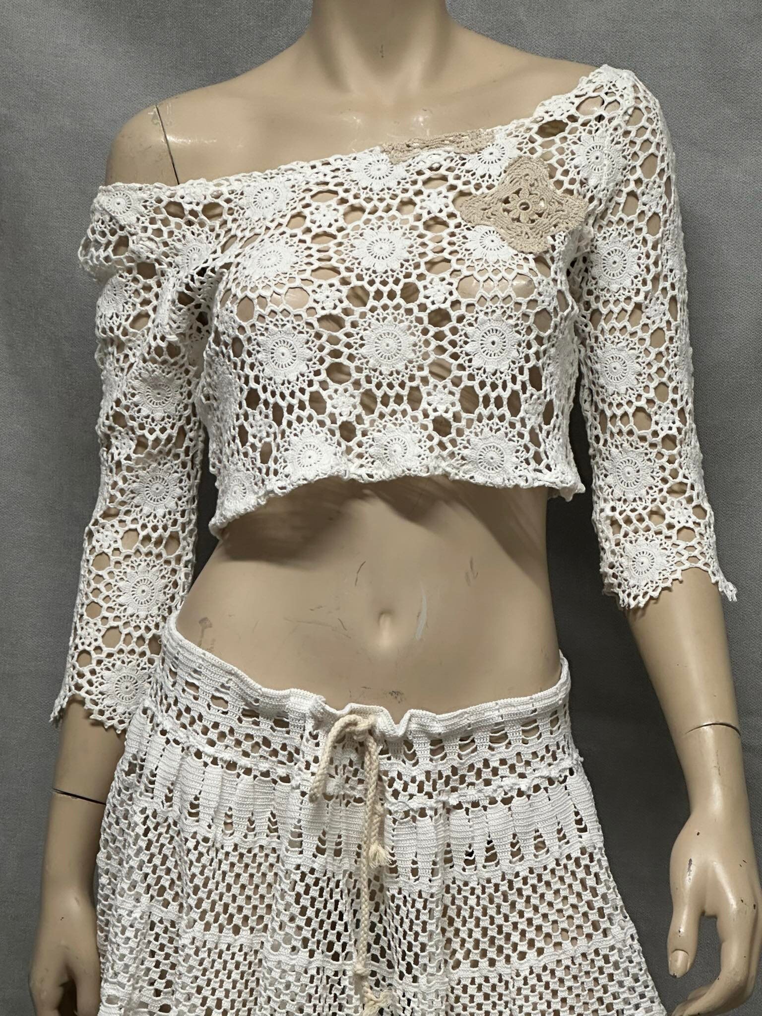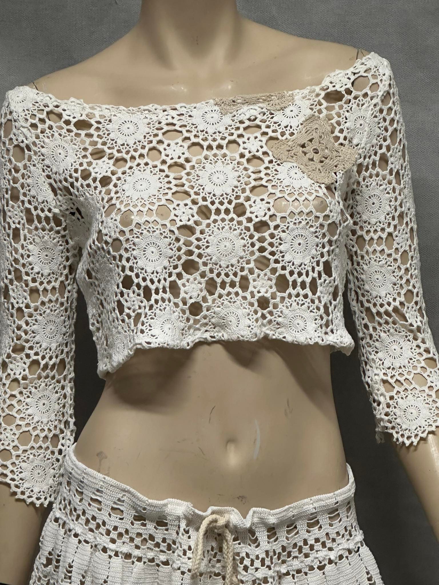 Favorite for Twenty Percent Off This unique handmade crochet crop top features an intricate floral lace design and off-the-shoulder style for an effortless boho vibe. The piece is see-through and lightweight, perfect for layering over swimwear or a bralette. It’s made from repurposed vintage crochet lace and showcases 3/4 length sleeves and a flattering cropped cut.