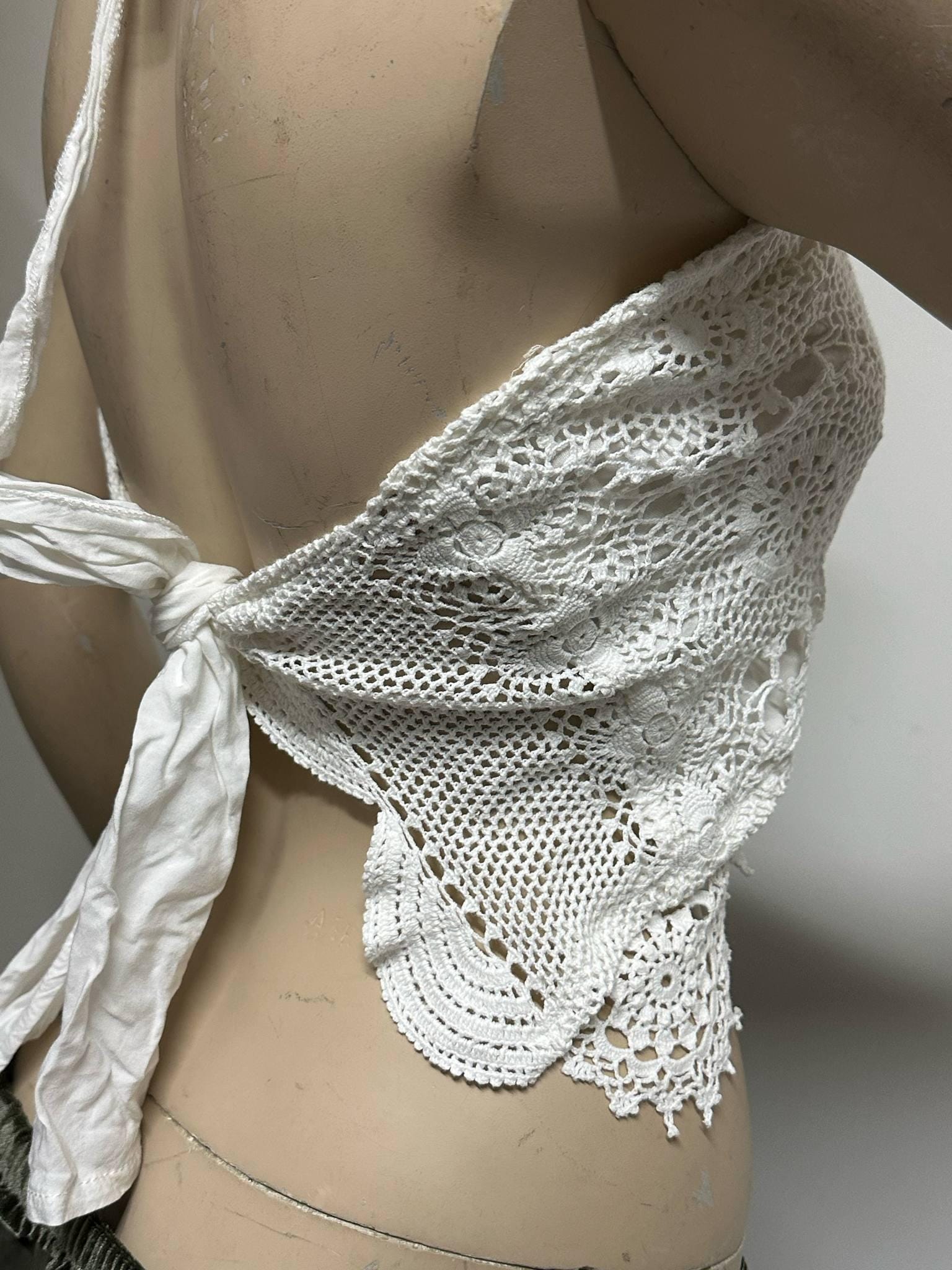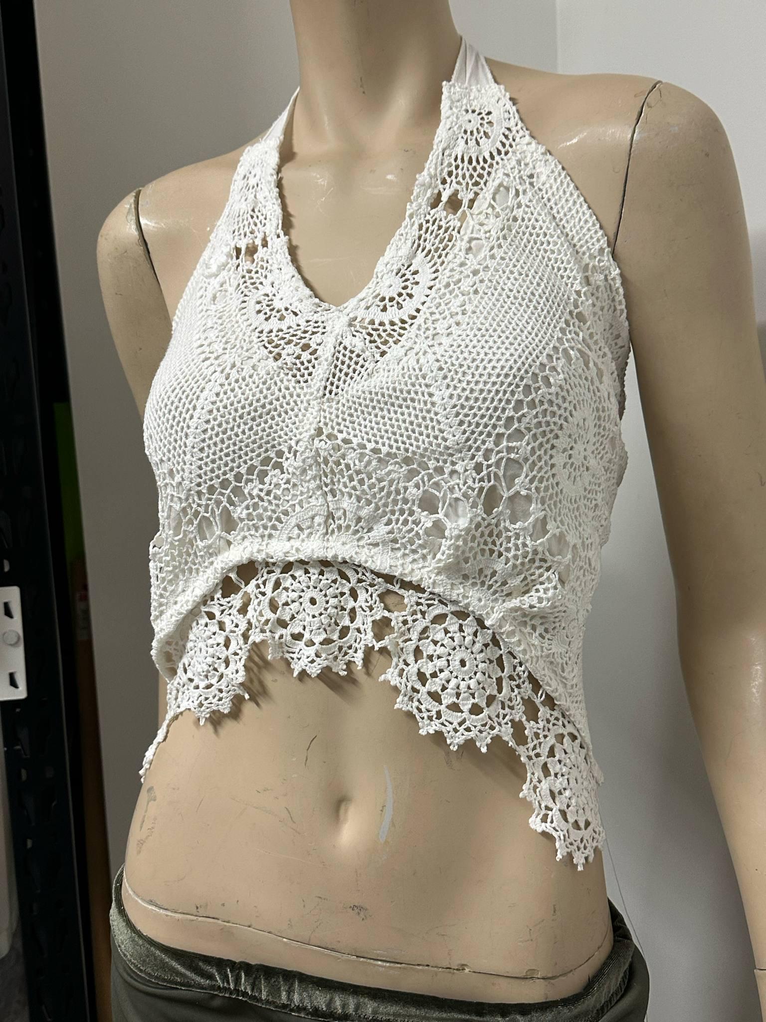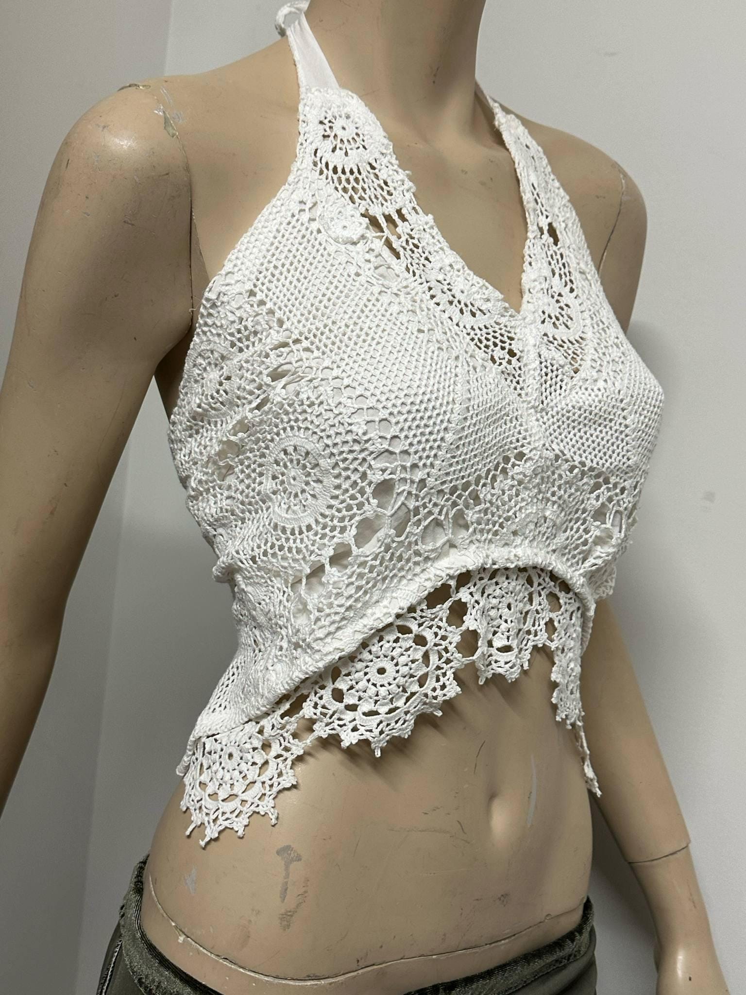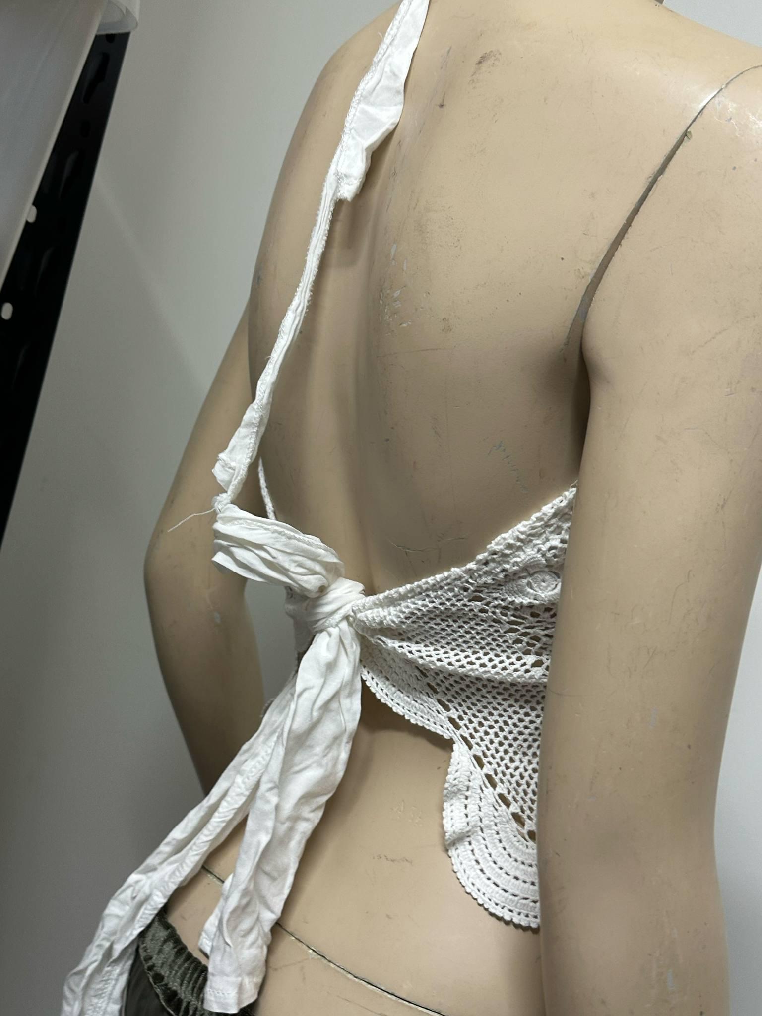 Carefully handcrafted from vintage white lace, lined halter top this halter crop top is a perfect piece to reflect your bohemian spirit! With its lightweight and breathable structure, it offers effortless elegance during summer days. The tie-back design allows it to fit different body types easily. Perfect for festival outfits, beach days, or casual wear. Each piece is produced with a sustainable fashion approach, using upcycled vintage lace. 🌿
