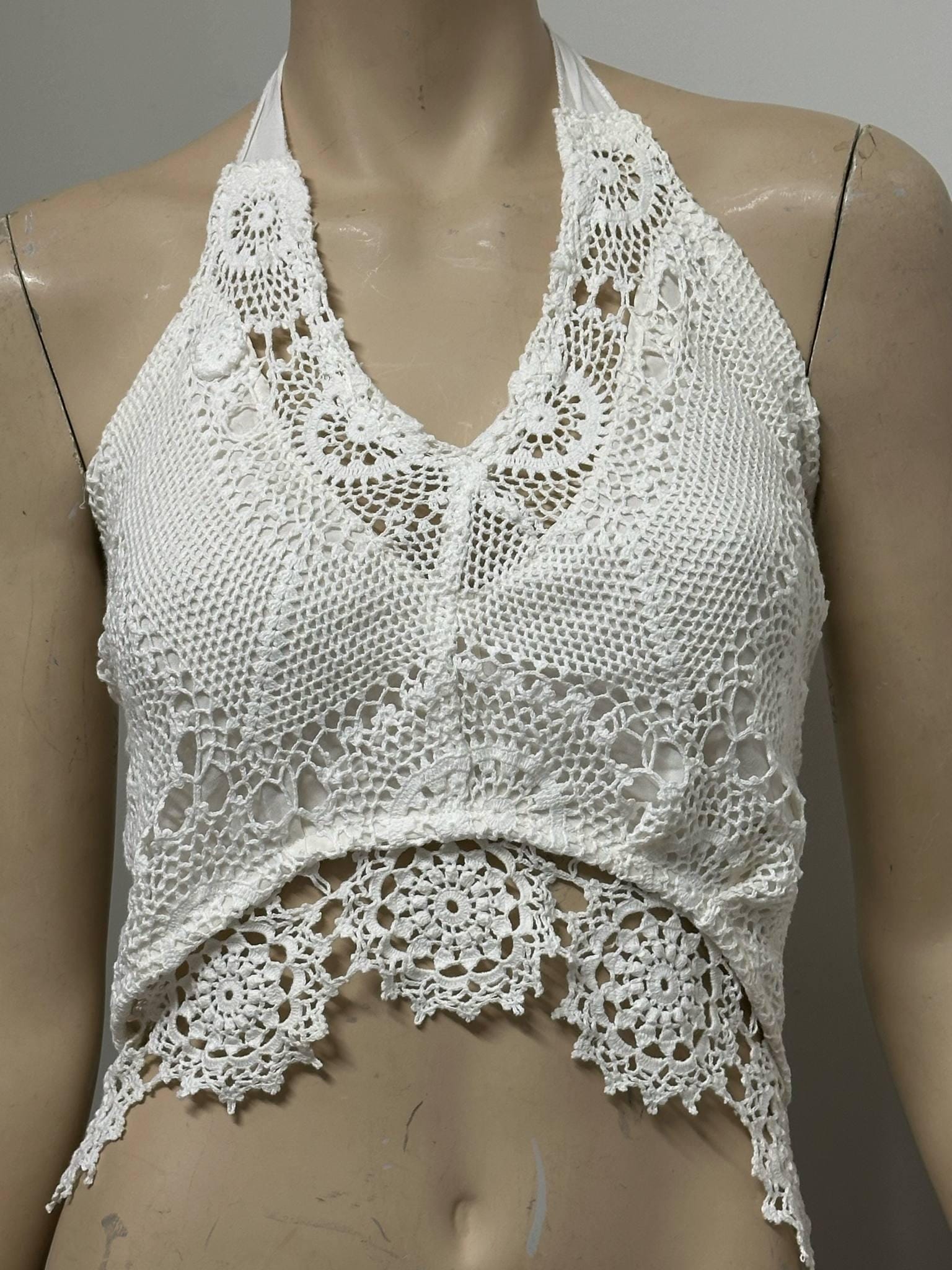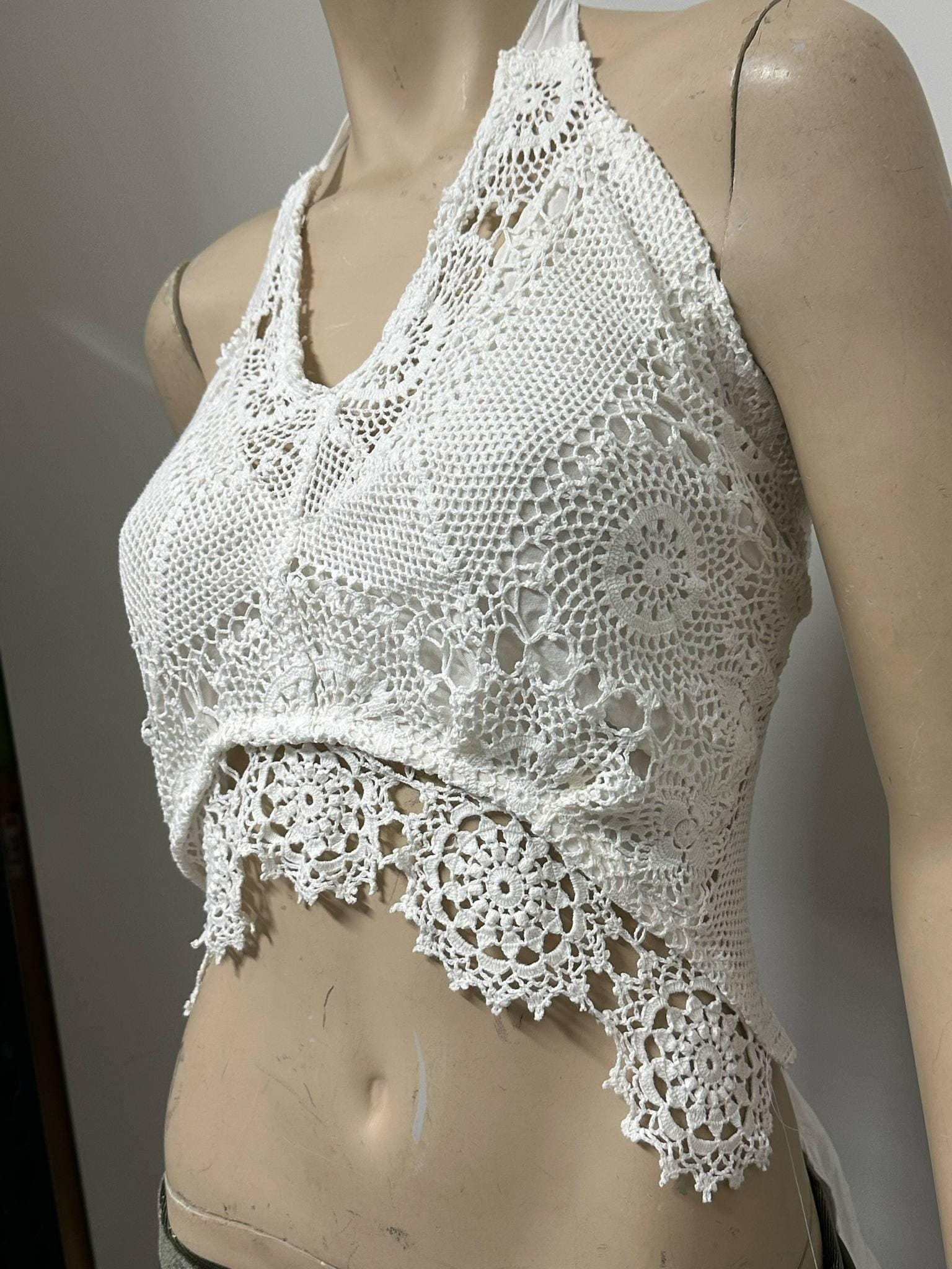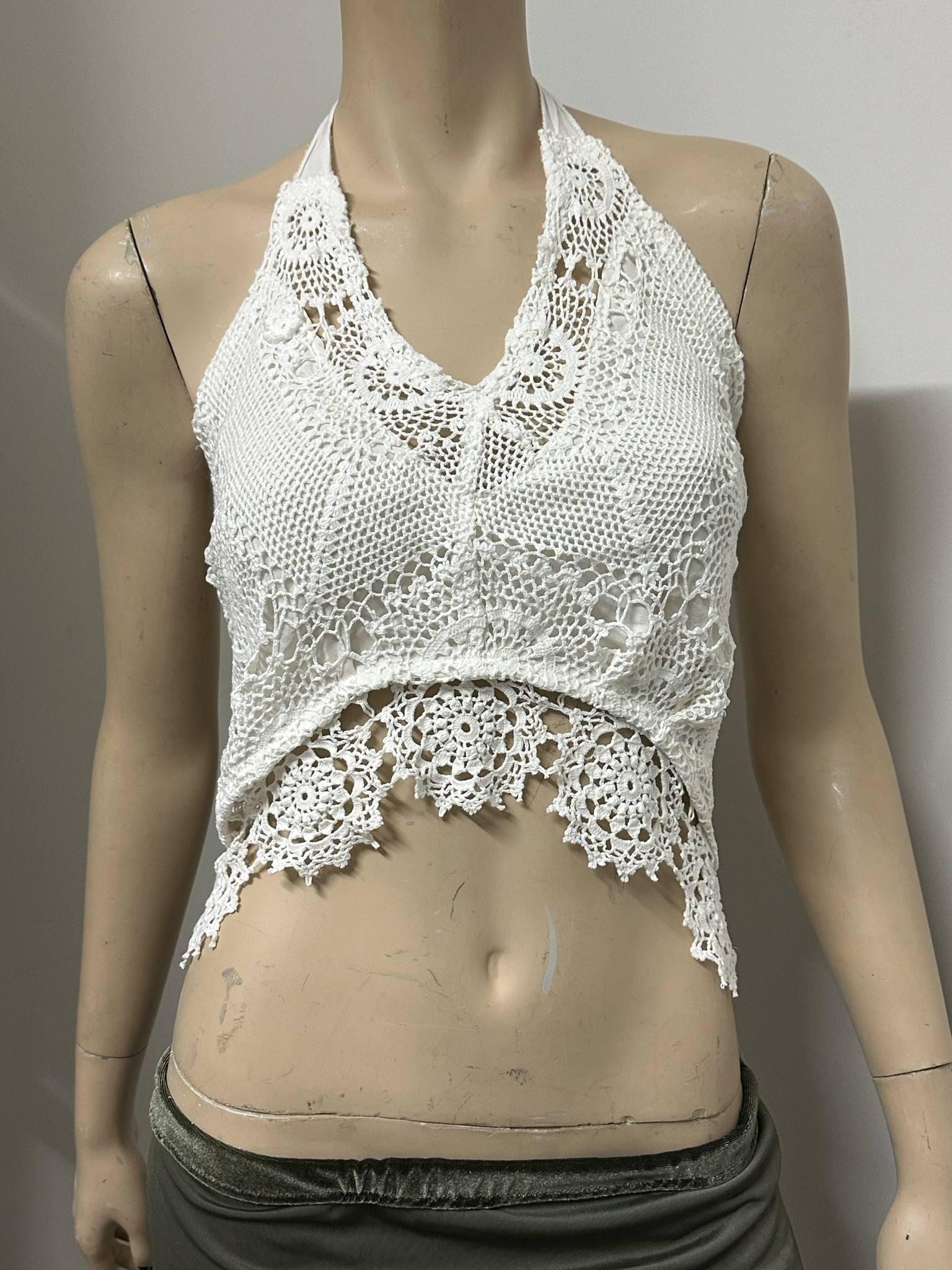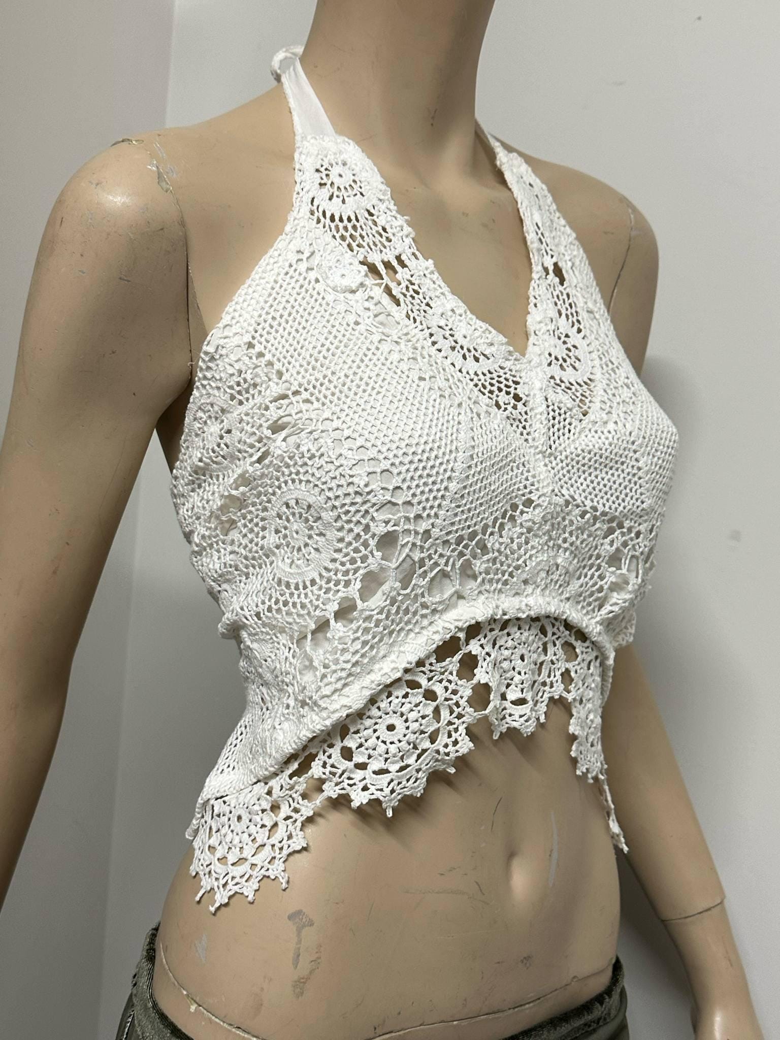 Carefully handcrafted from vintage white lace, lined halter top this halter crop top is a perfect piece to reflect your bohemian spirit! With its lightweight and breathable structure, it offers effortless elegance during summer days. The tie-back design allows it to fit different body types easily. Perfect for festival outfits, beach days, or casual wear. Each piece is produced with a sustainable fashion approach, using upcycled vintage lace. 🌿