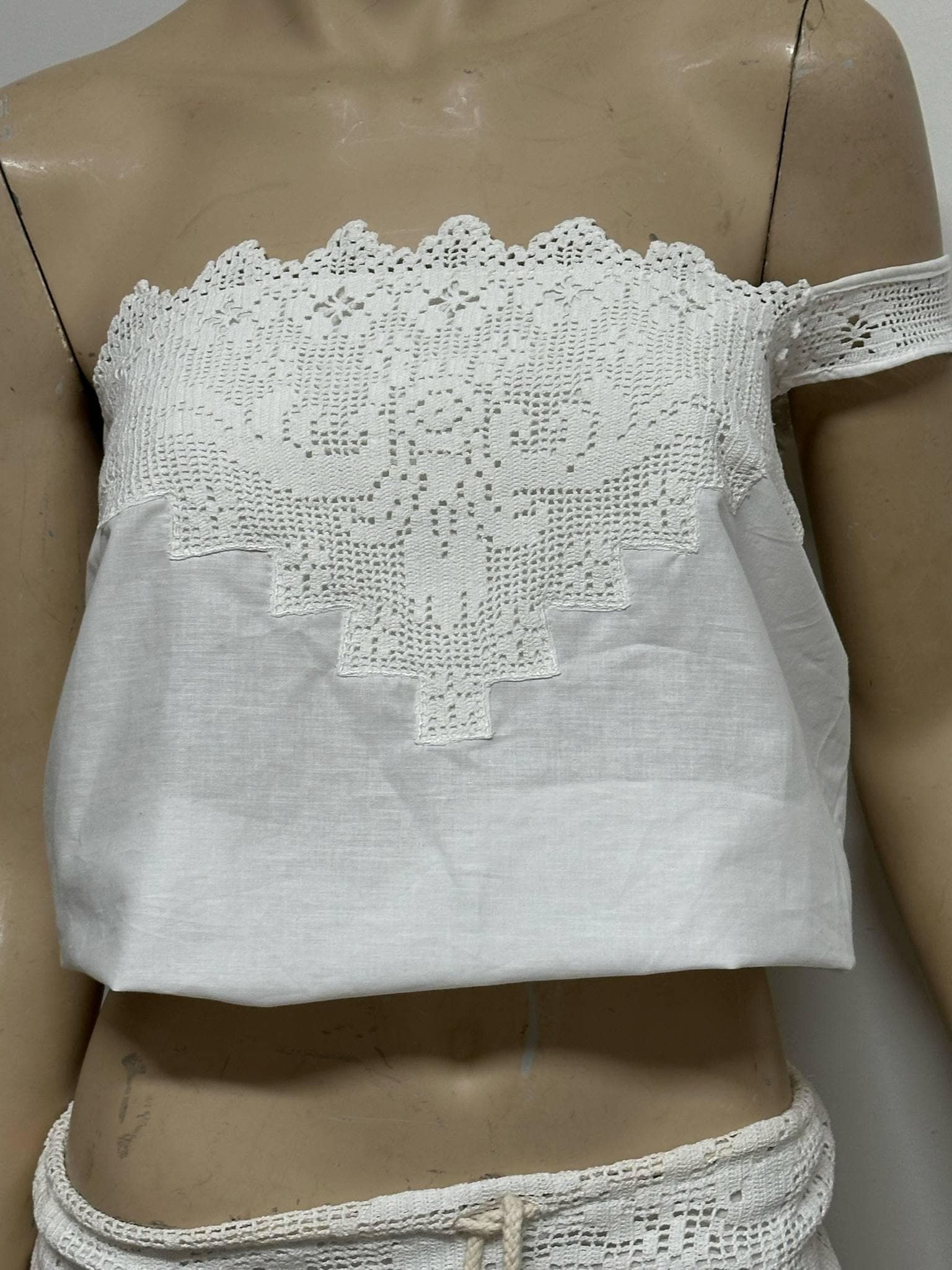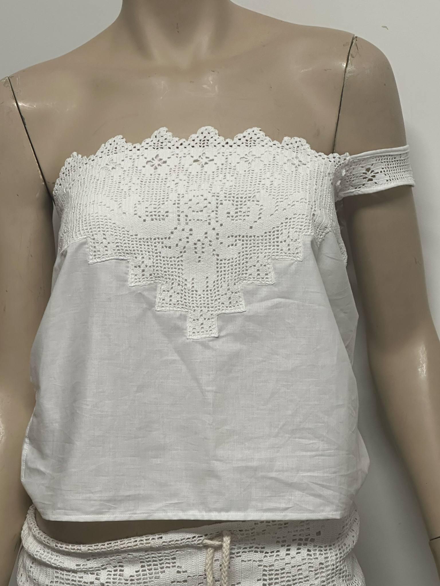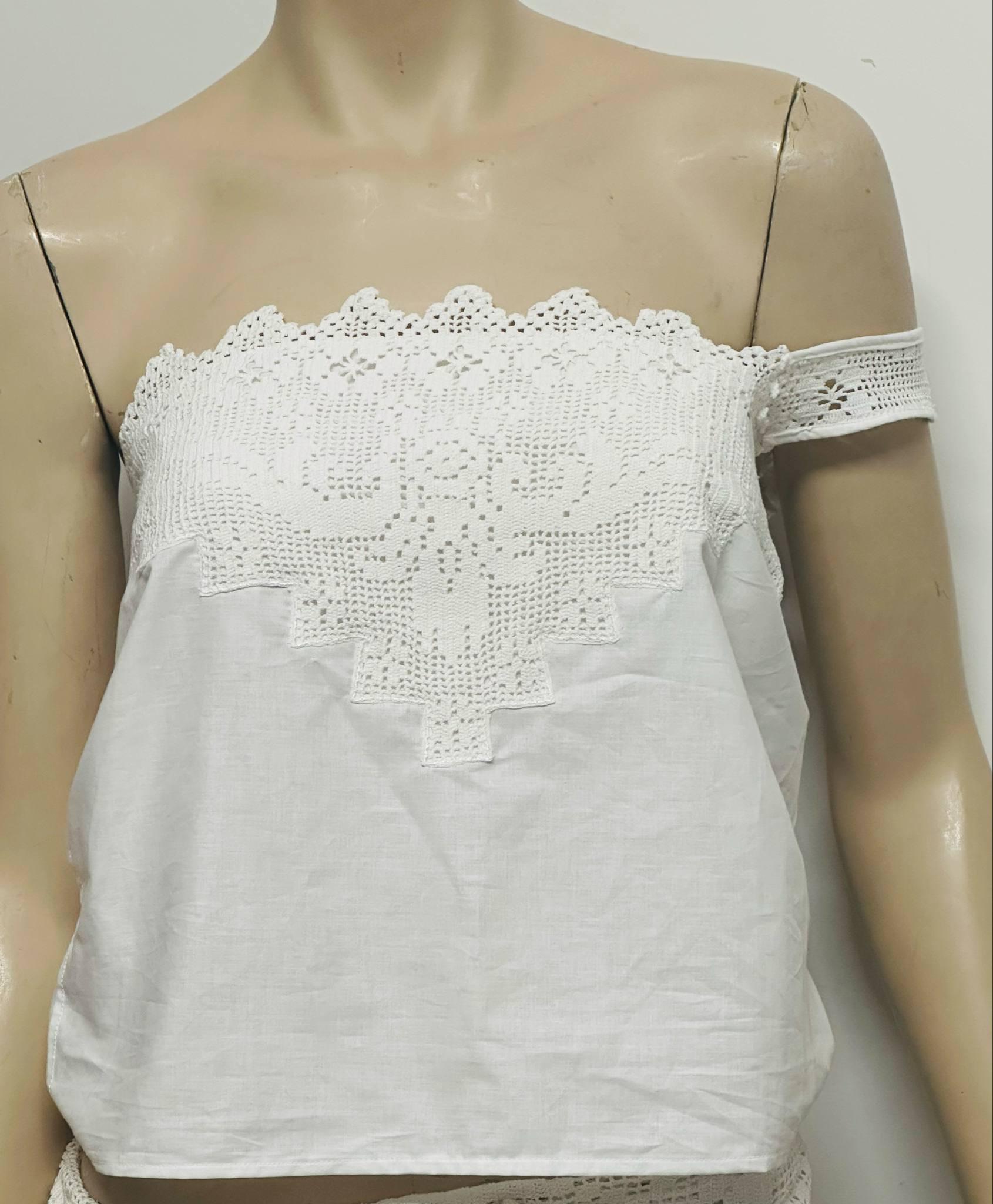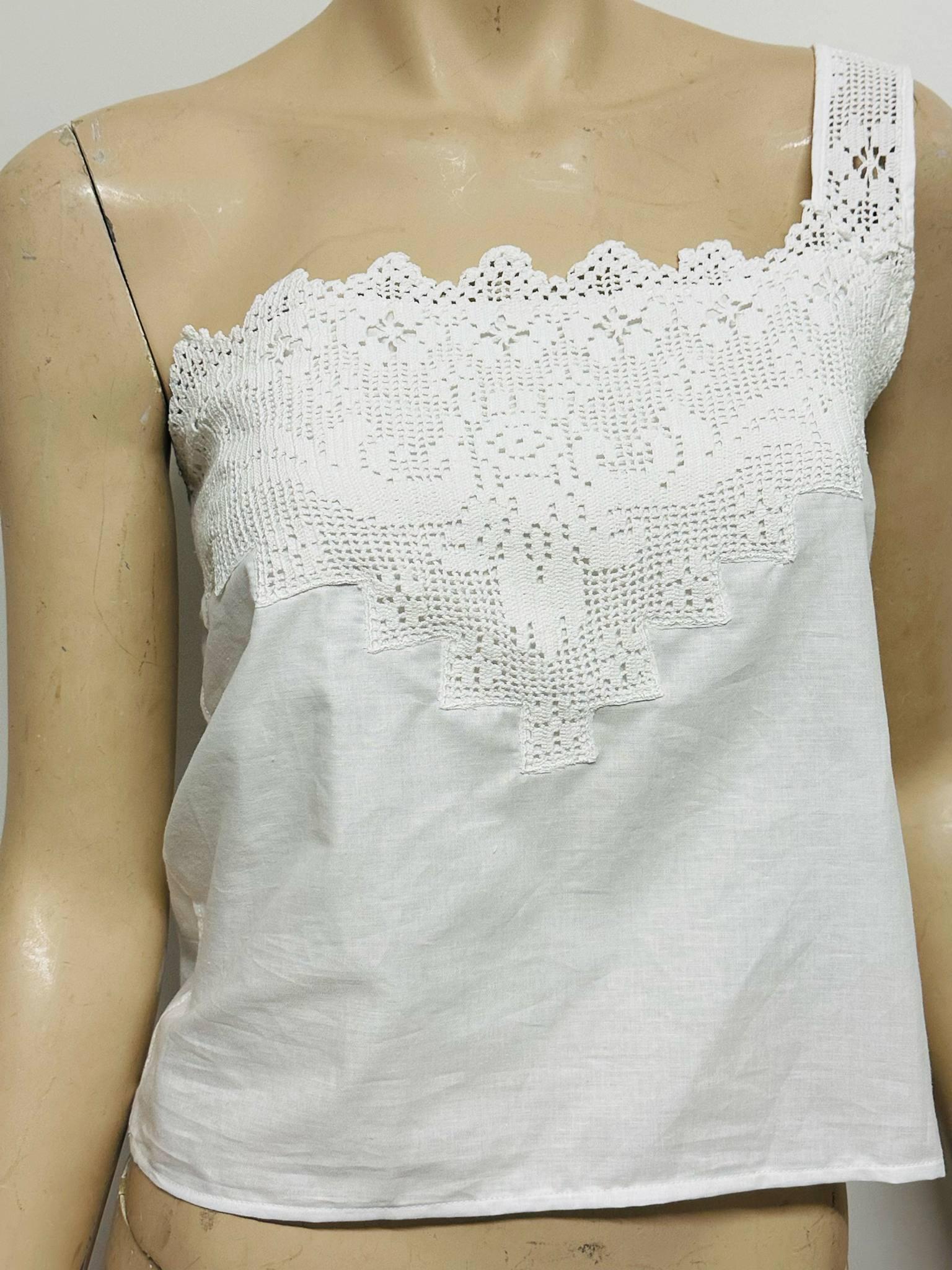 A romantic and fresh design made from unused, fine lace and 100% soft cotton fabric. I carefully purchase these clean, delicate laces and combine them with breathable cotton to create a unique one-shoulder crop top.