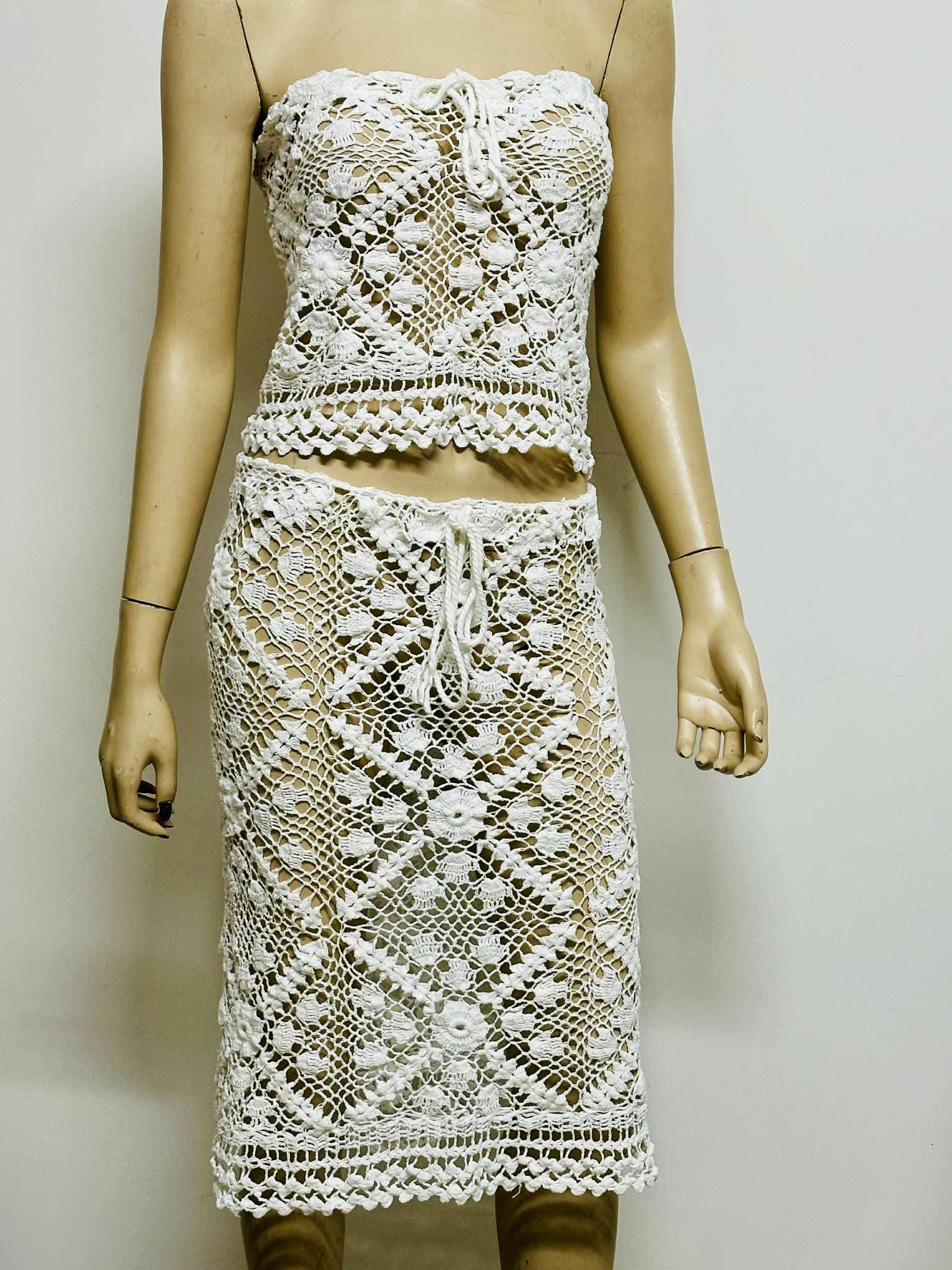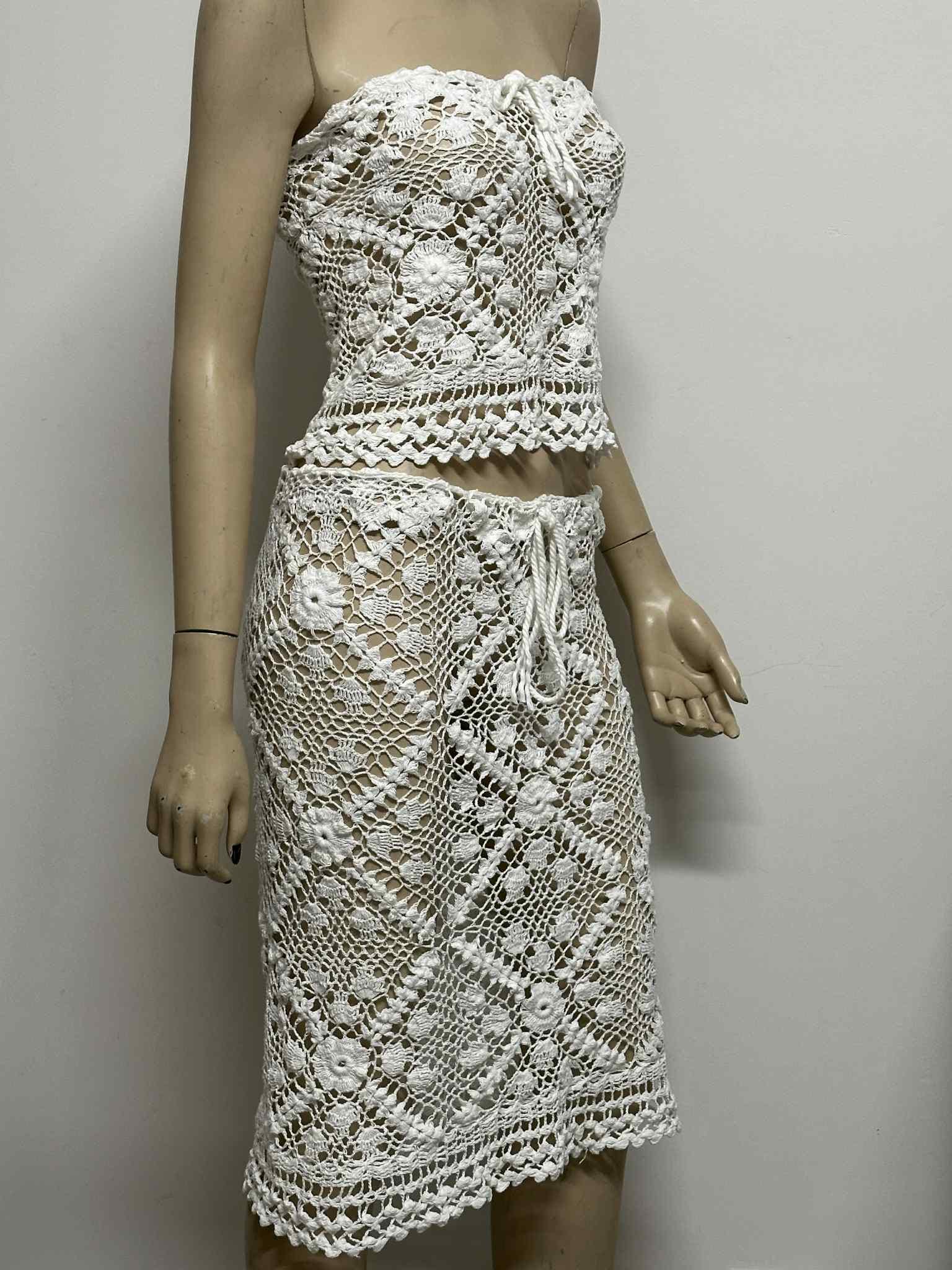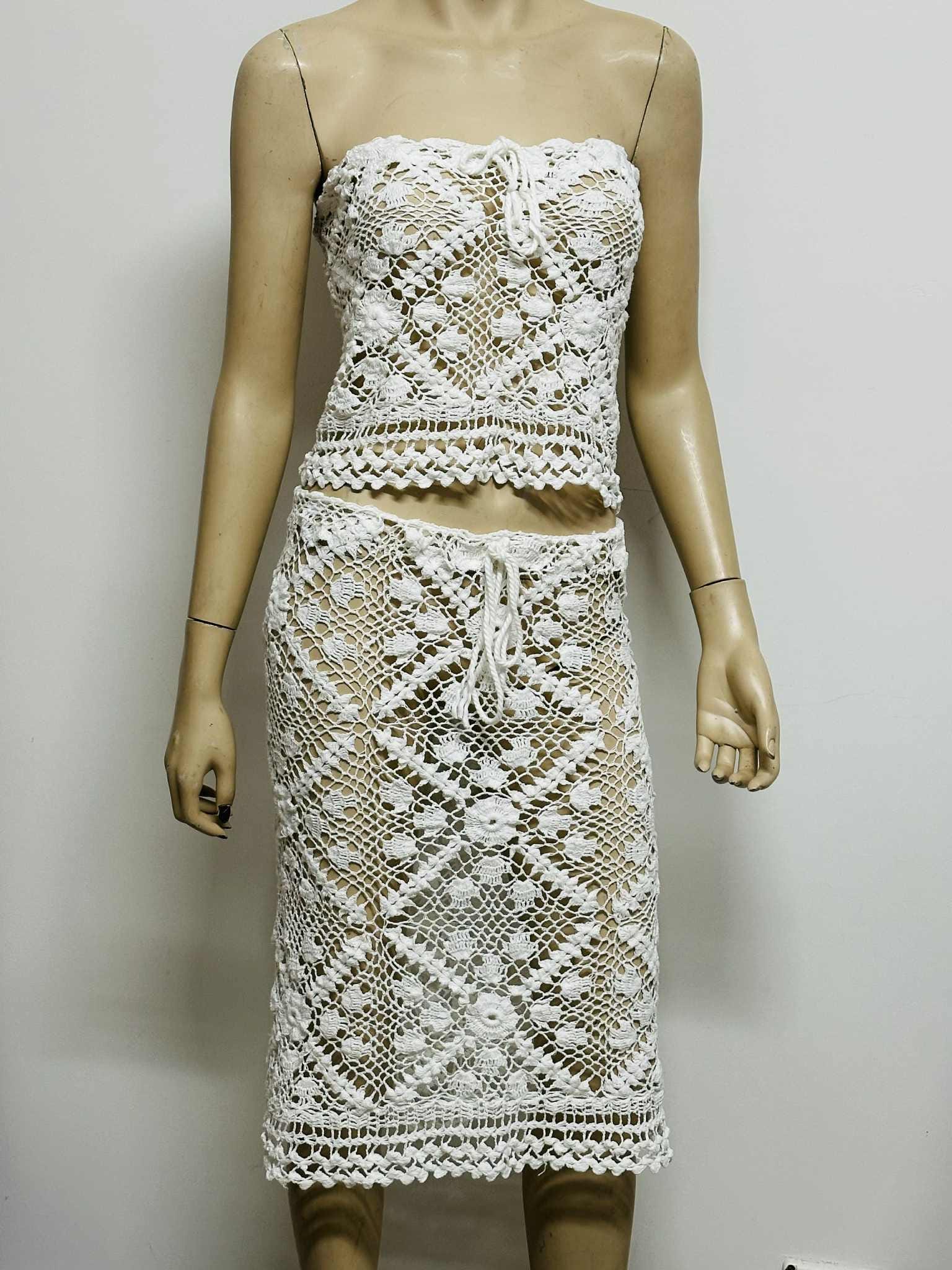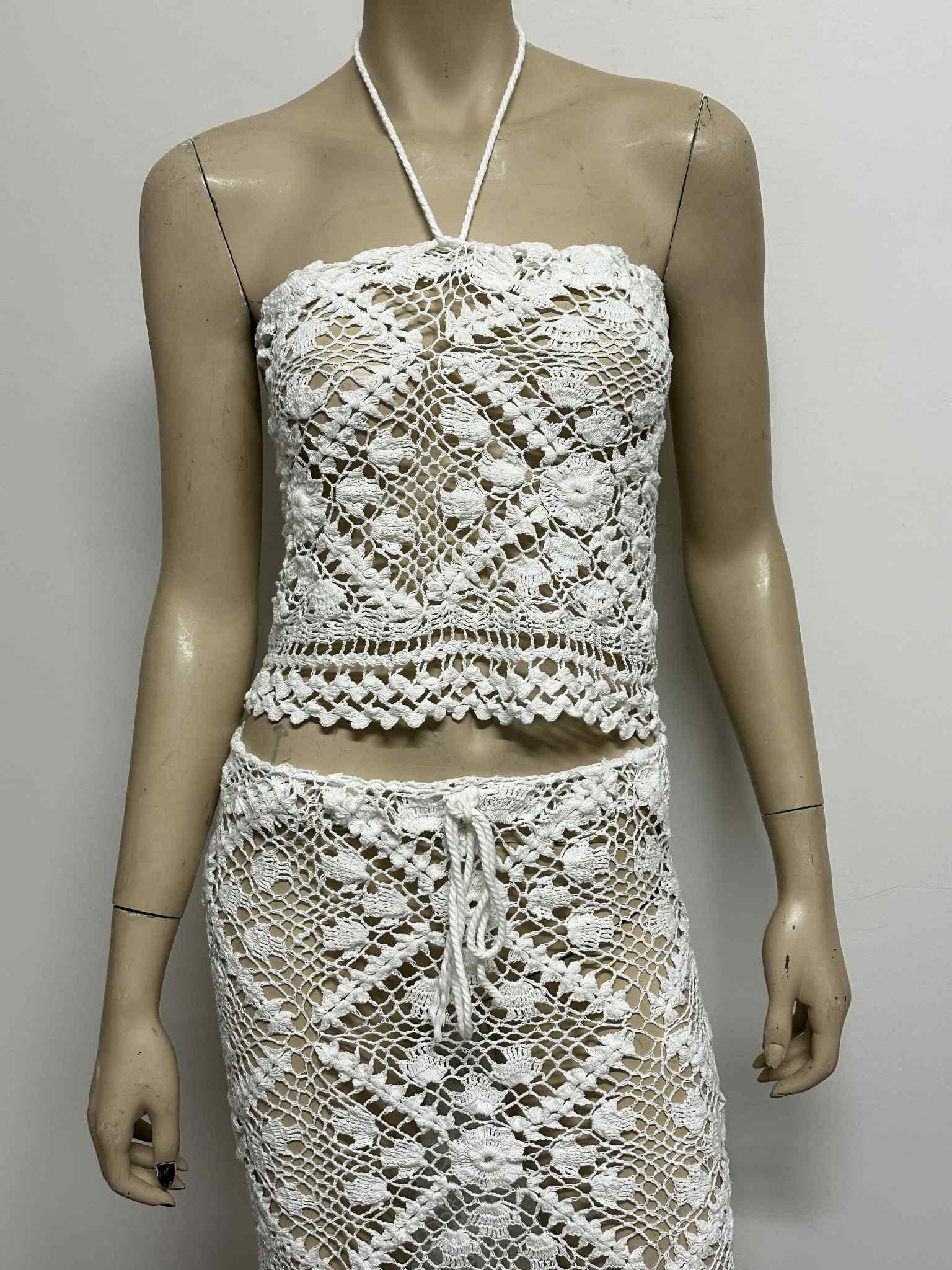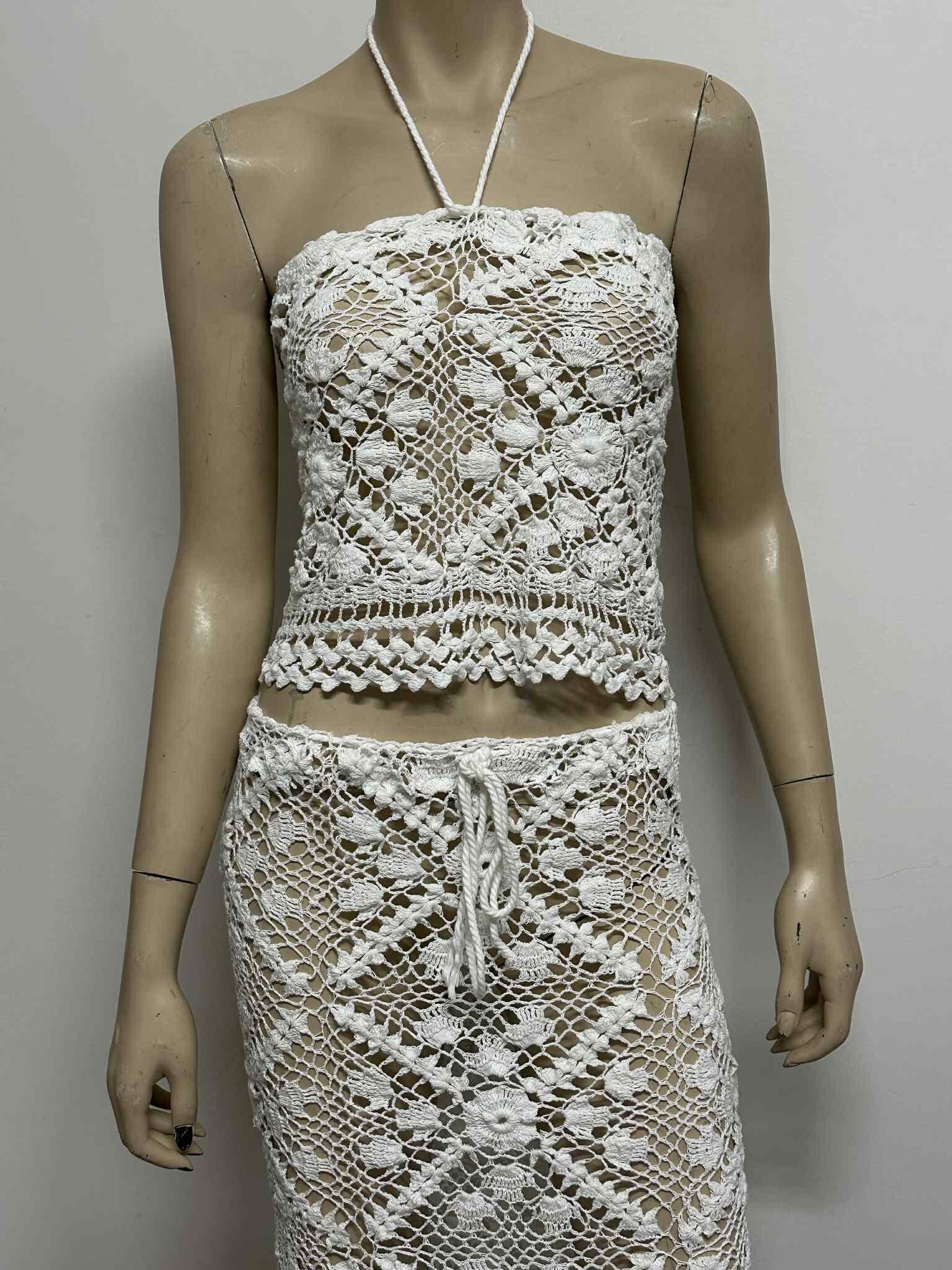 Favorite for Twenty Percent Off Dive into summer style with this handmade crochet two‐piece set, featuring a fitted halter crop top and a flowing maxi skirt—perfect as a pool party cover‐up or a boho beach ensemble. Crafted entirely from 100% cotton yarn in an openwork floral‐diamond crochet pattern, this set is naturally lightweight, airy, and irresistibly chic.