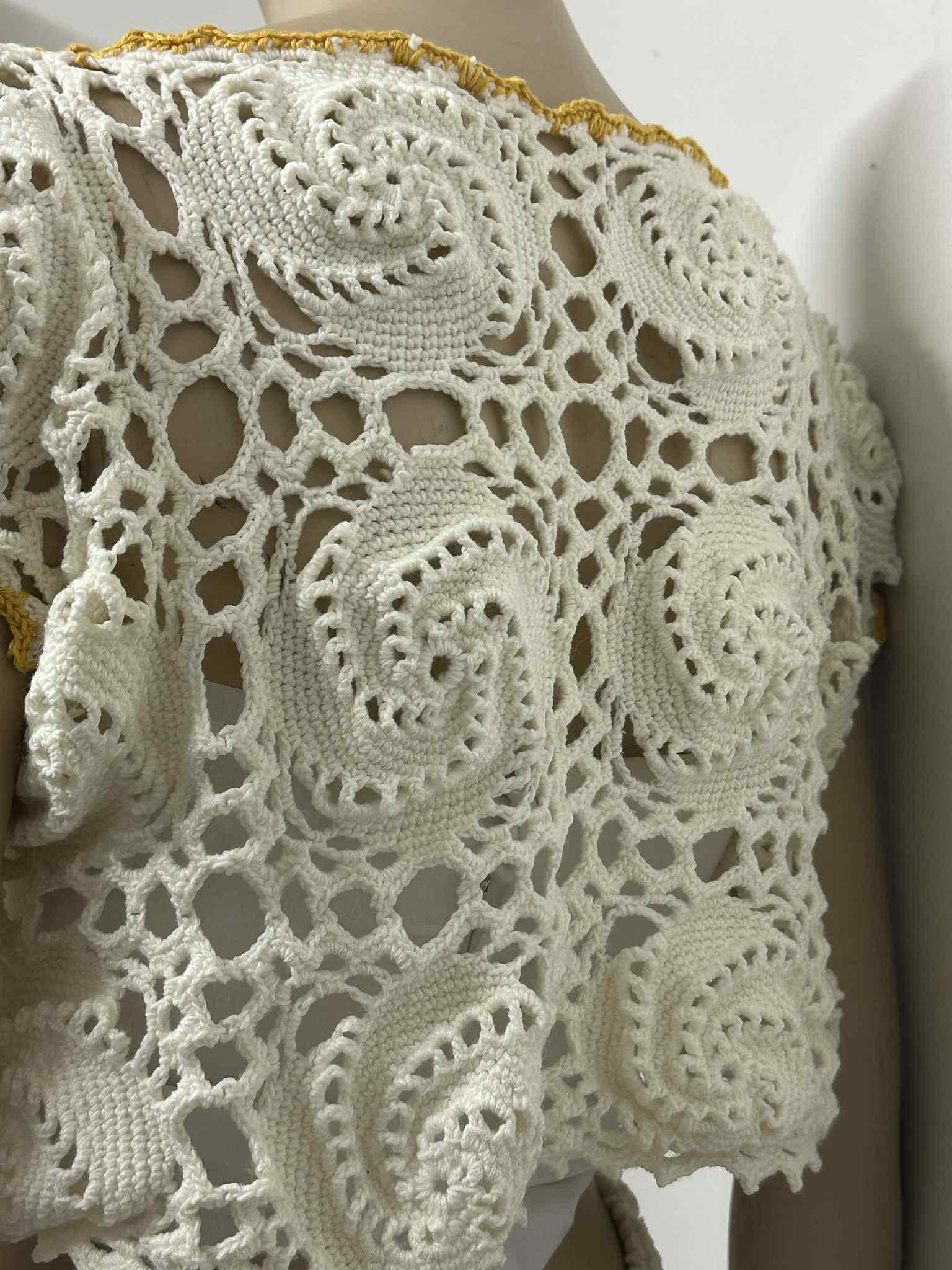 This unique handmade top combines comfort with craftsmanship. Crafted from a cotton-acrylic blend, it features delicately crocheted trims around the neckline, sleeves, and hem—perfect for layering or wearing solo. ✨ Edge Options: