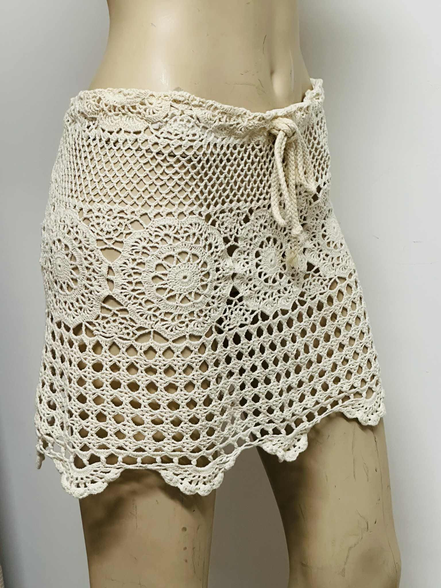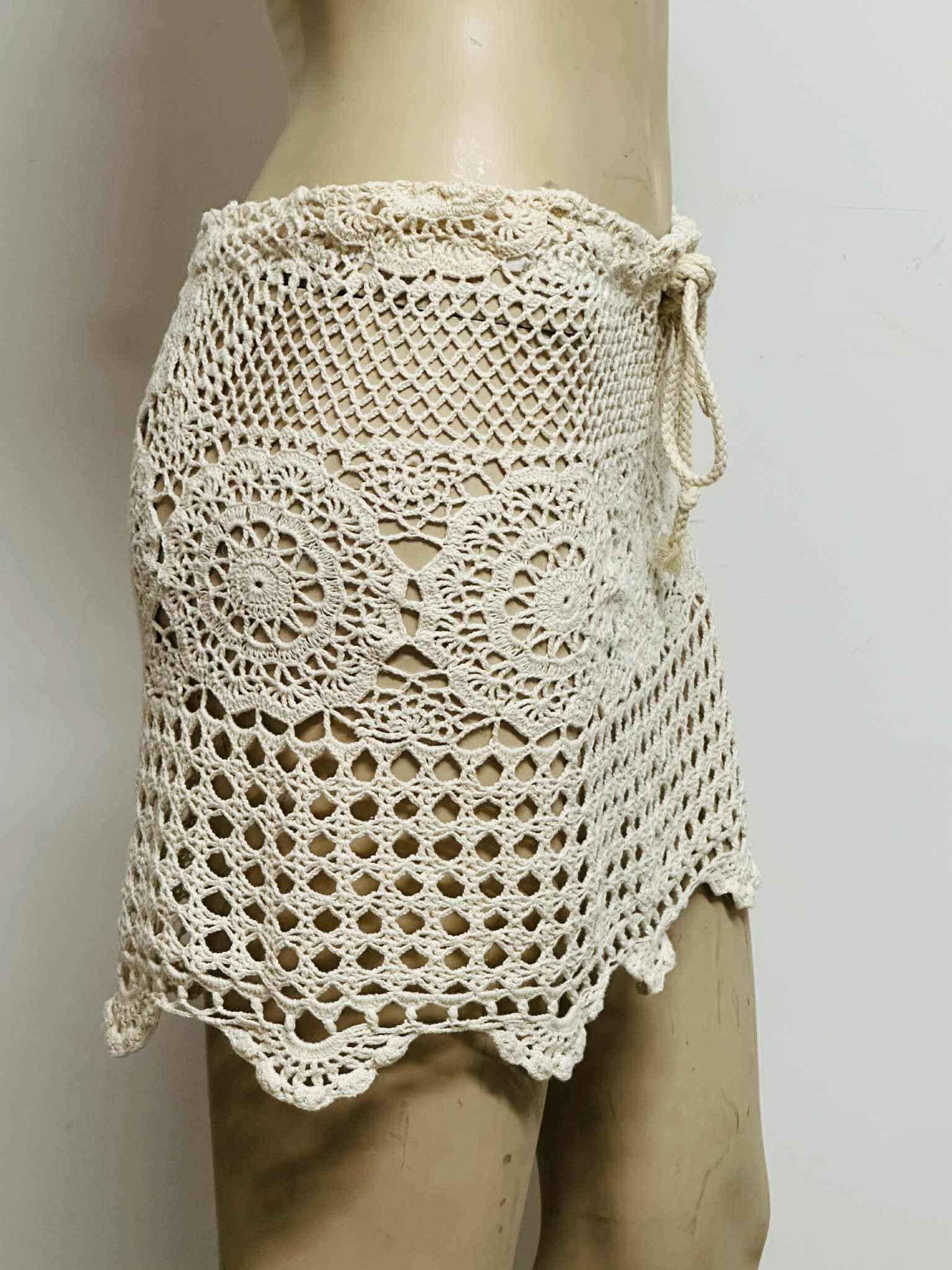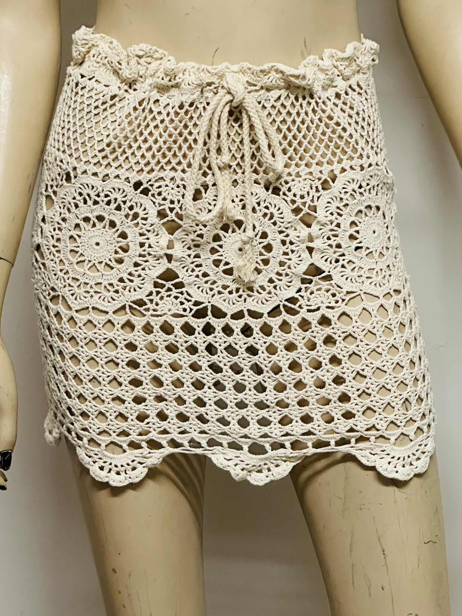 This beige color crochet mini skirt is a handmade beauty crafted with soft cotton yarn and detailed lace motifs. The waistband includes a soft, stretchy inner fabric that gently hugs your waist and adjusts to your shape.