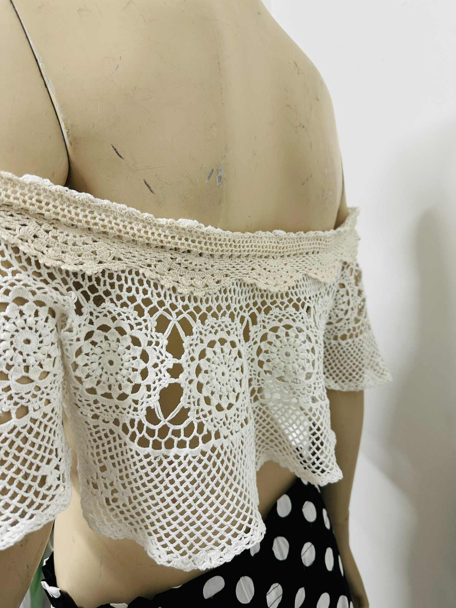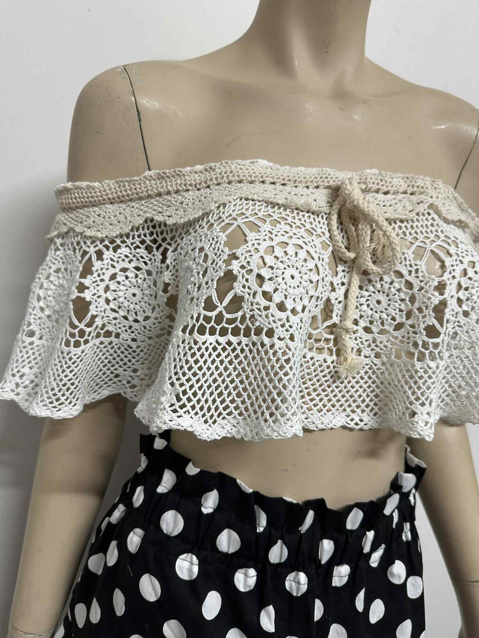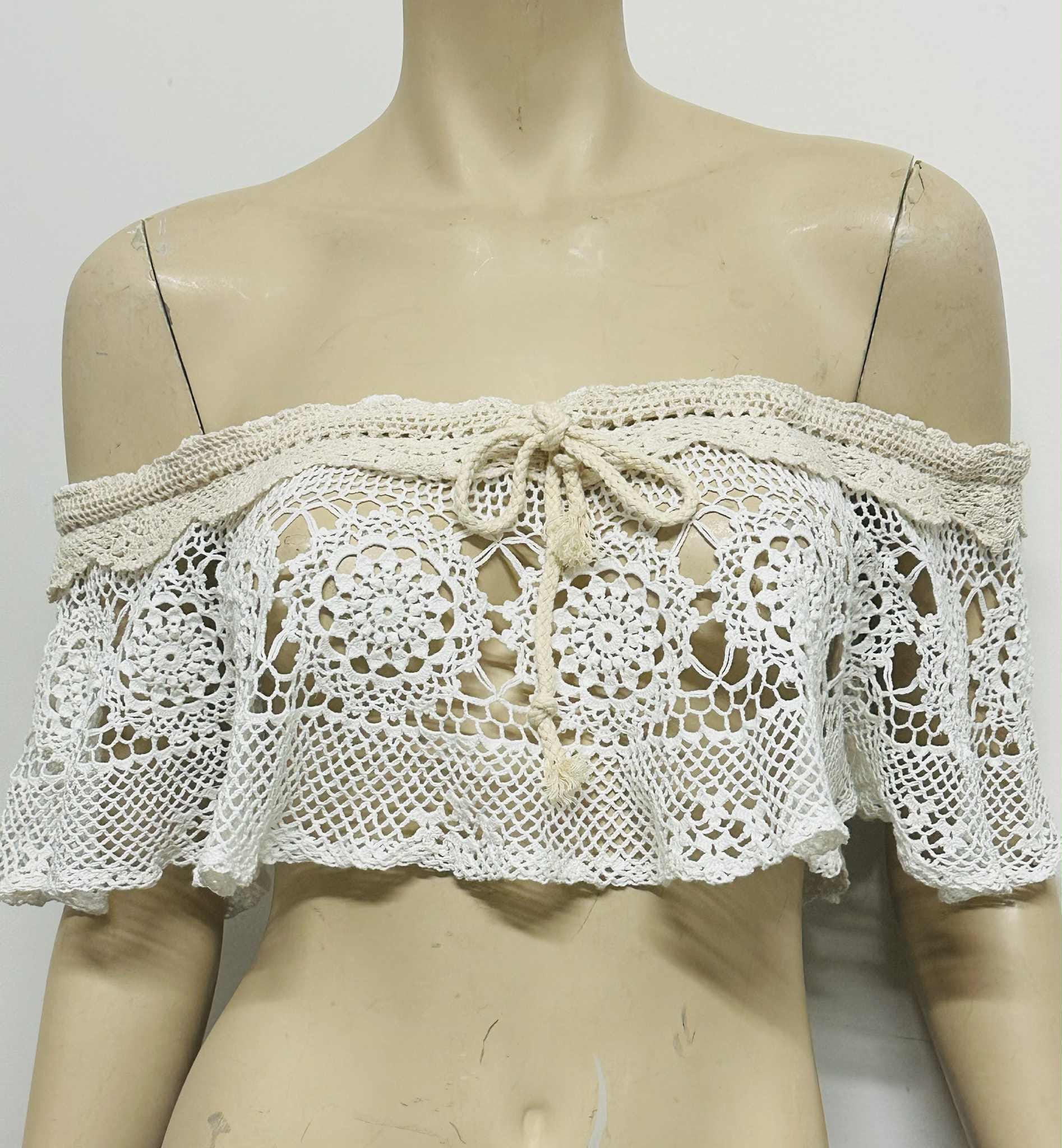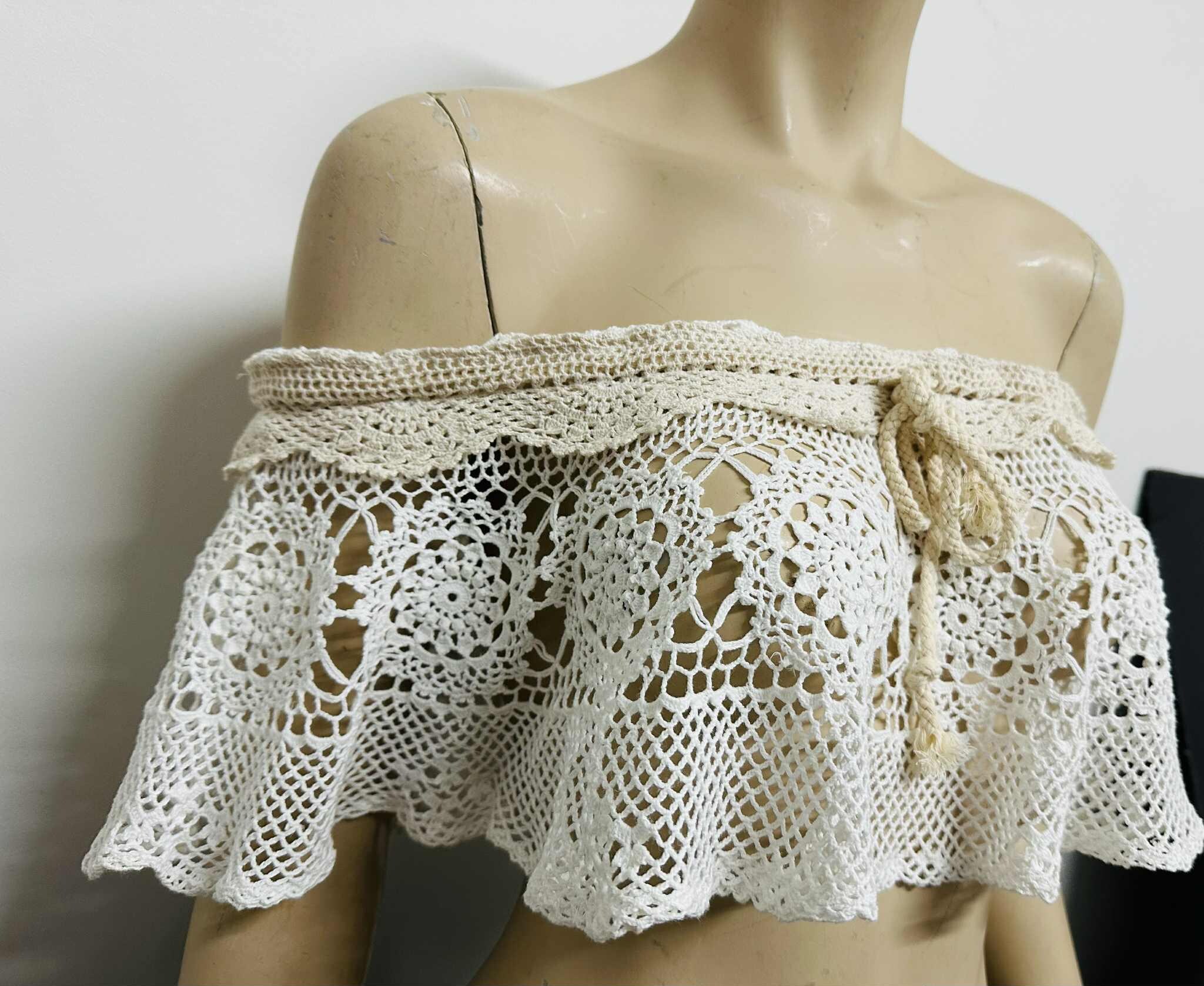 Handmade vintage-style off-shoulder crochet lace top, crafted with delicate floral patterns and soft beige trimming. This versatile piece can be worn in many stylish ways — layer it over a tube top, halter top, simple tank, or even a plain dress to instantly elevate your look.