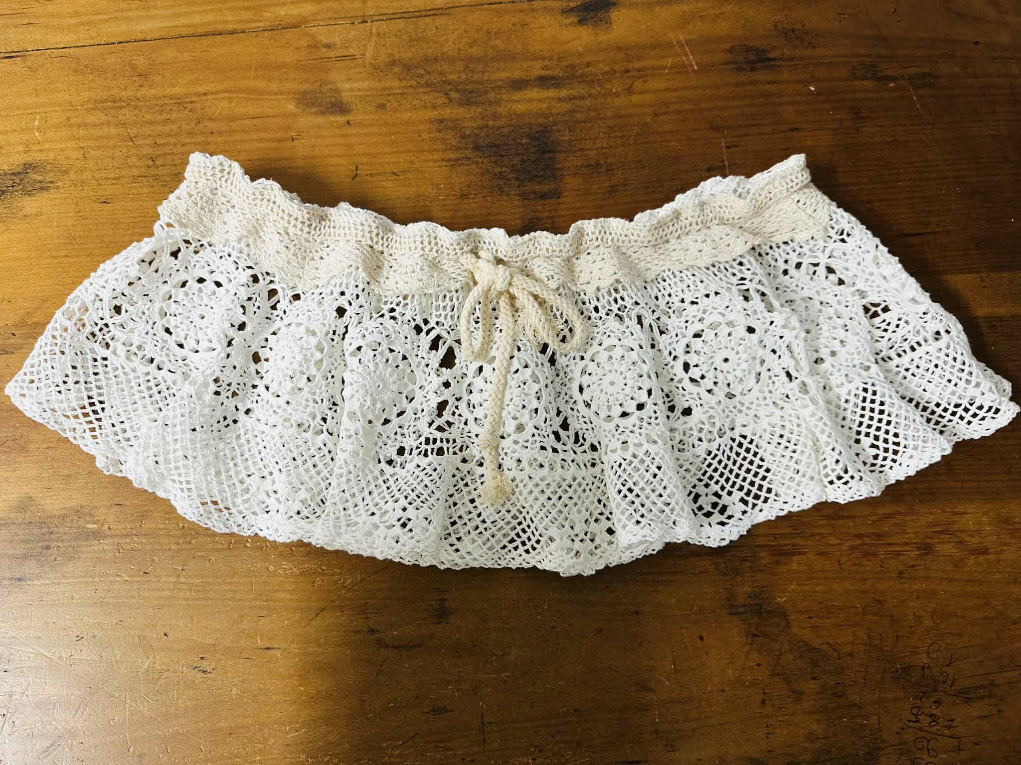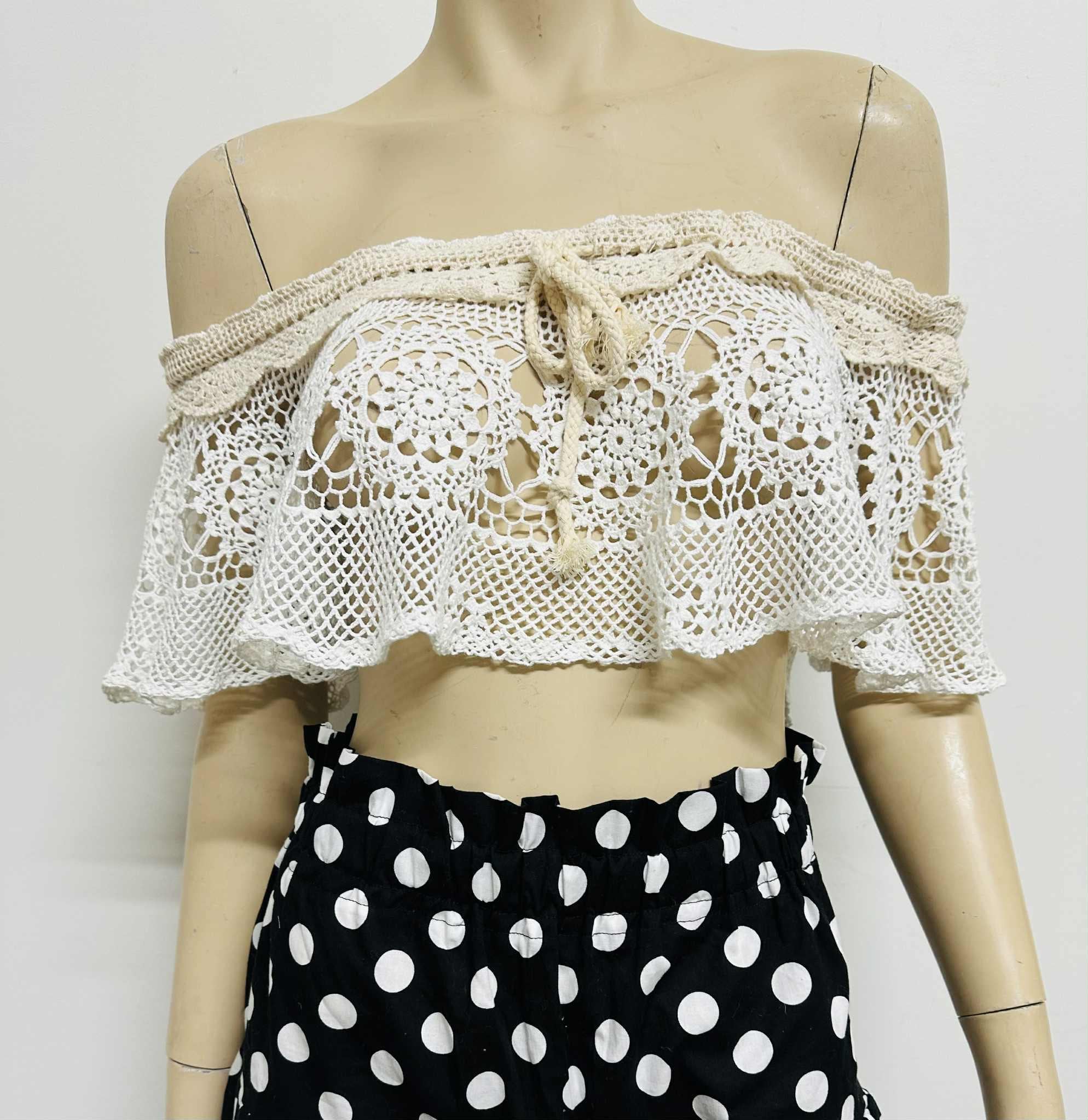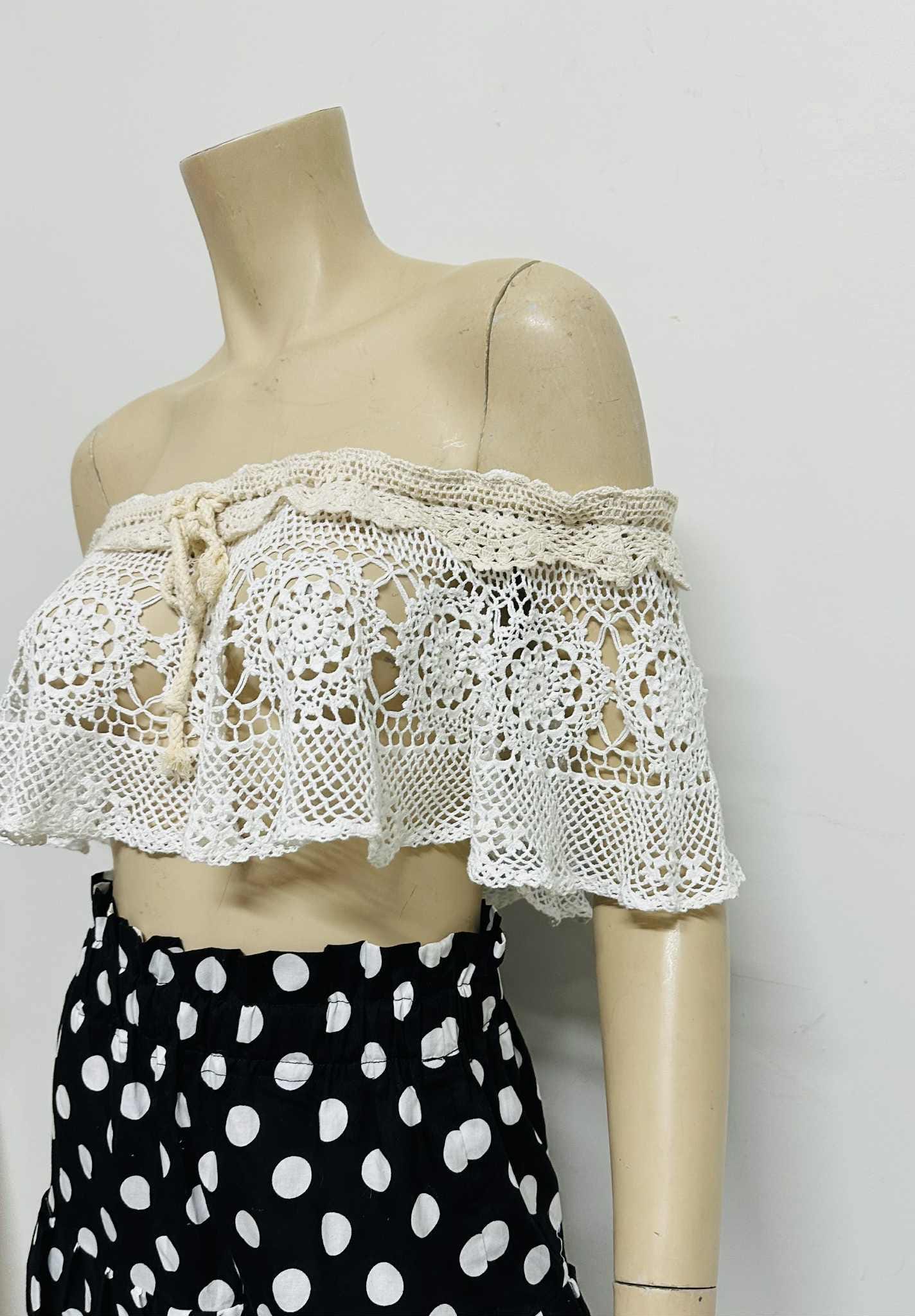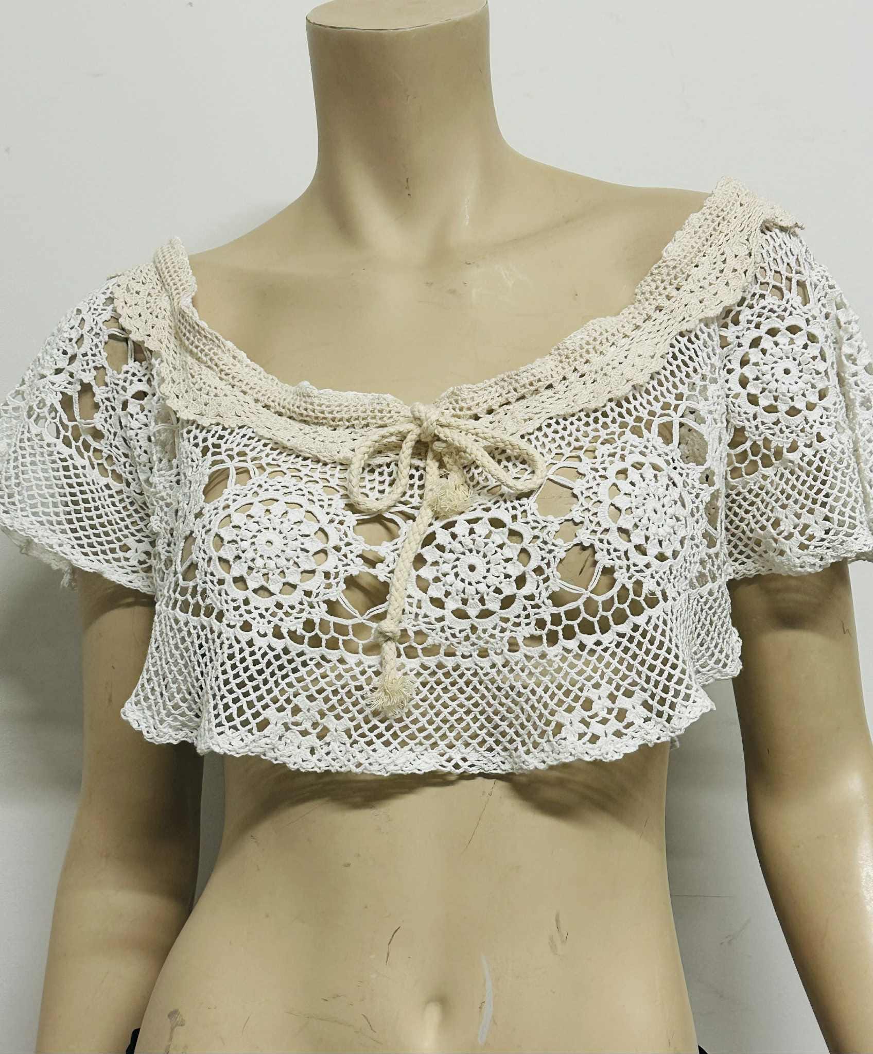 Handmade vintage-style off-shoulder crochet lace top, crafted with delicate floral patterns and soft beige trimming. This versatile piece can be worn in many stylish ways — layer it over a tube top, halter top, simple tank, or even a plain dress to instantly elevate your look.