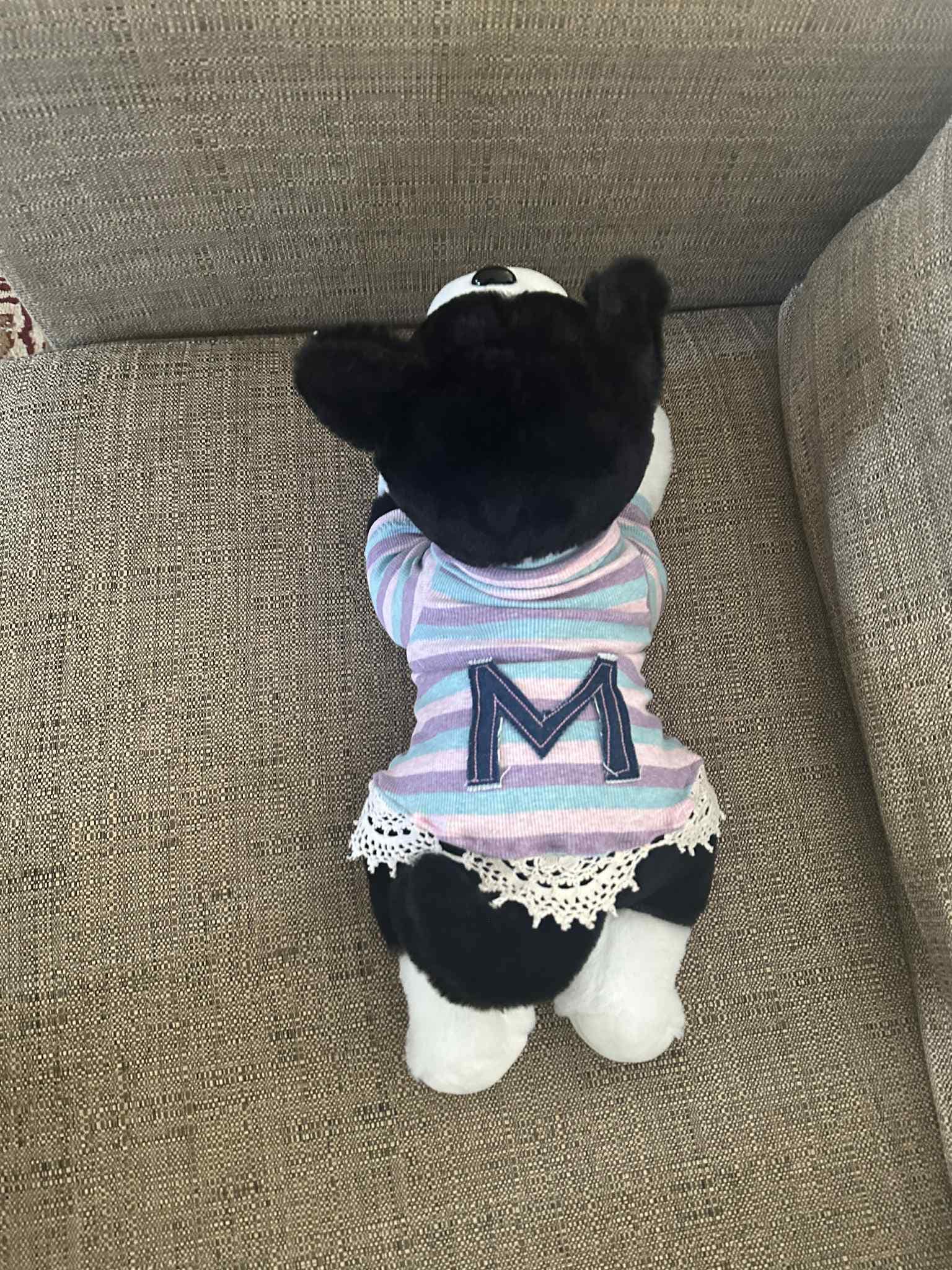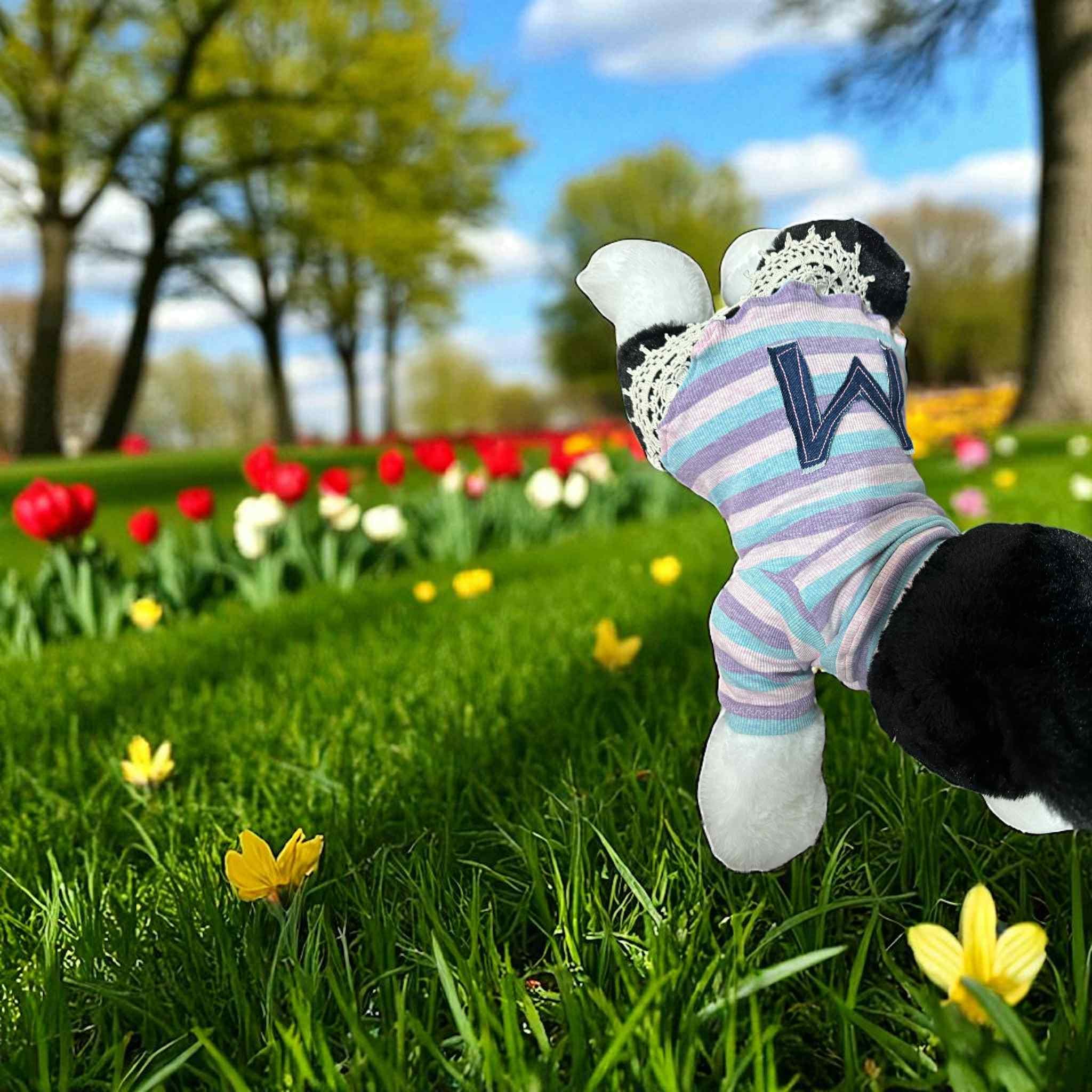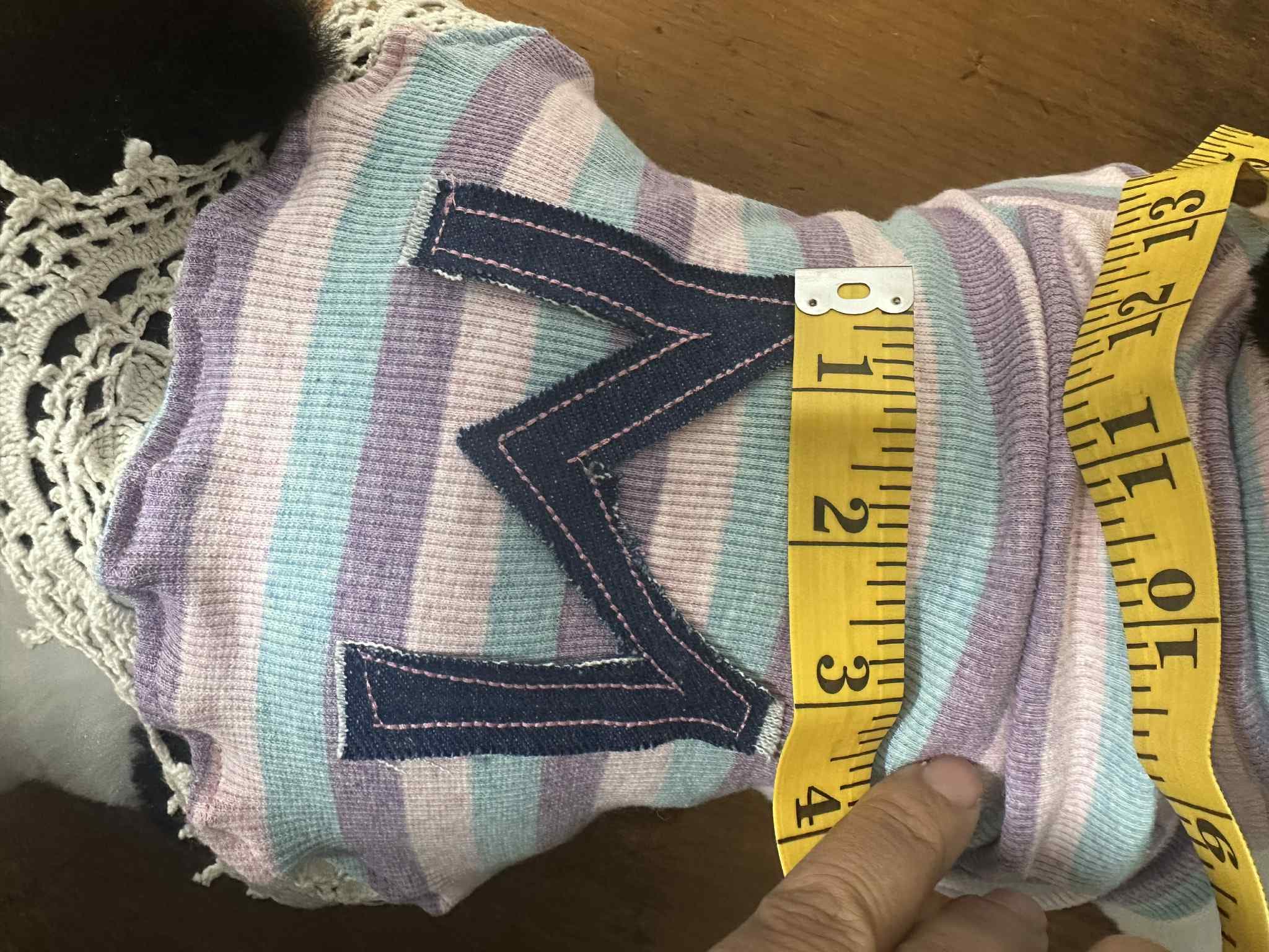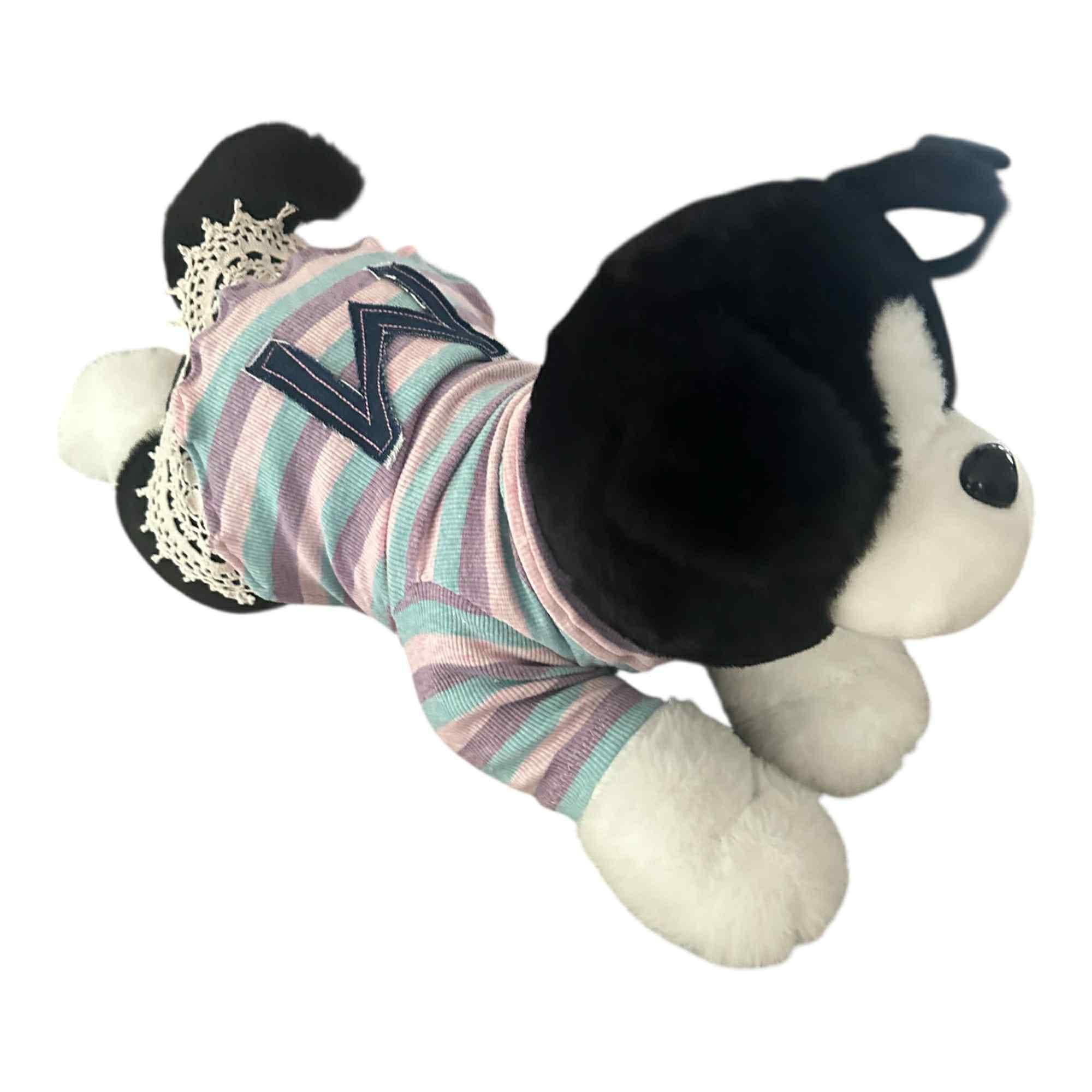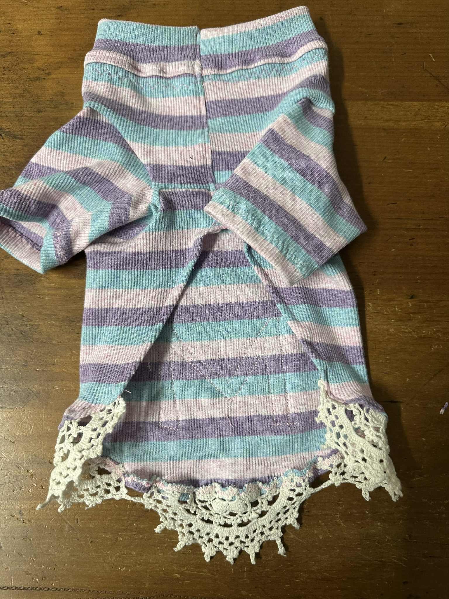 Handmade Personalized Dog Outfit This unique striped dog shirt is handmade with love and care, featuring delicate lace detail and a custom initial patch. Perfect for everyday wear, special occasions, or as a thoughtful gift for pet lovers.