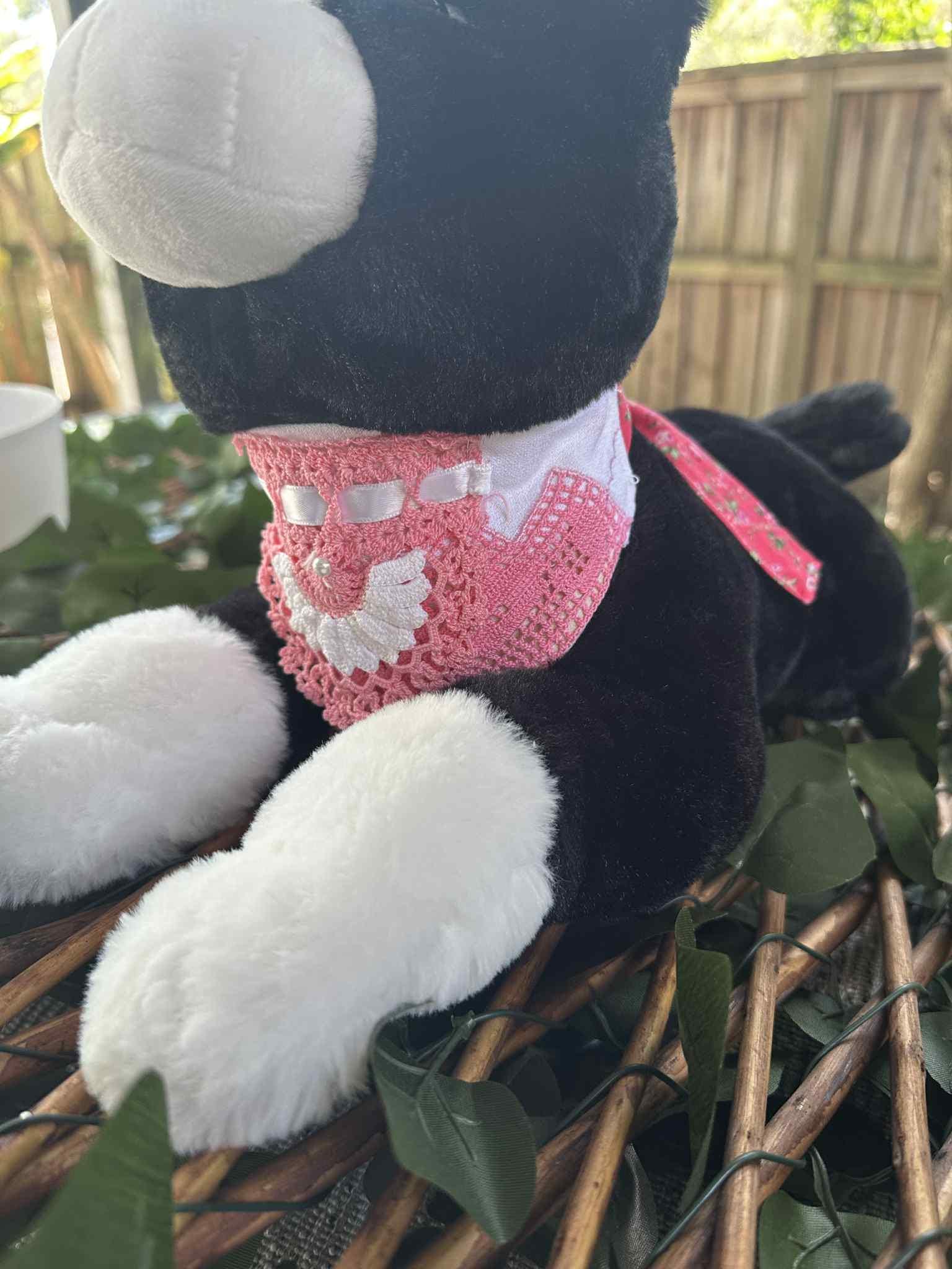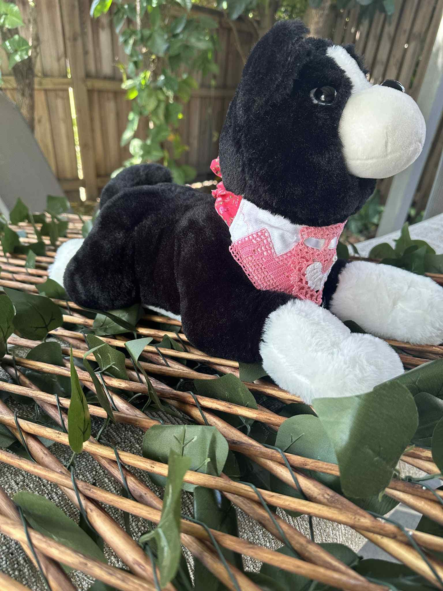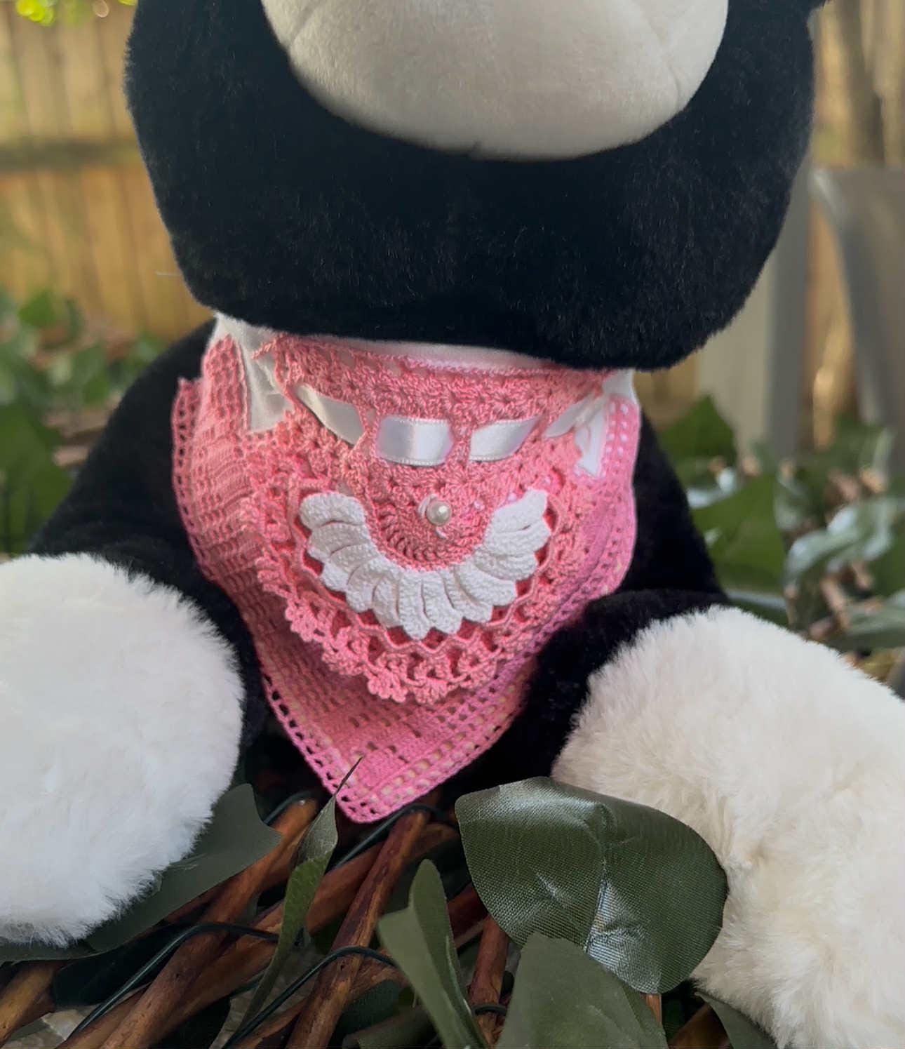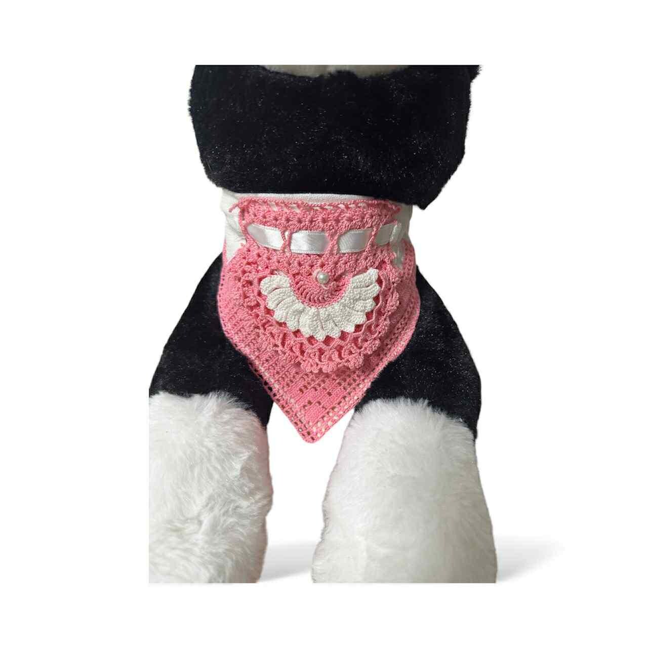 Add a touch of elegance to your furry friend’s look with this handmade crochet lace dog bandana. Crafted from soft pink and white cotton, this piece features a delicate satin ribbon and pearl bead for a festive, elegant touch.