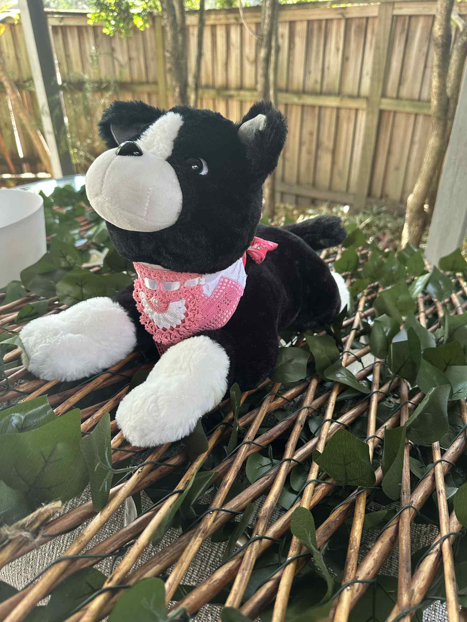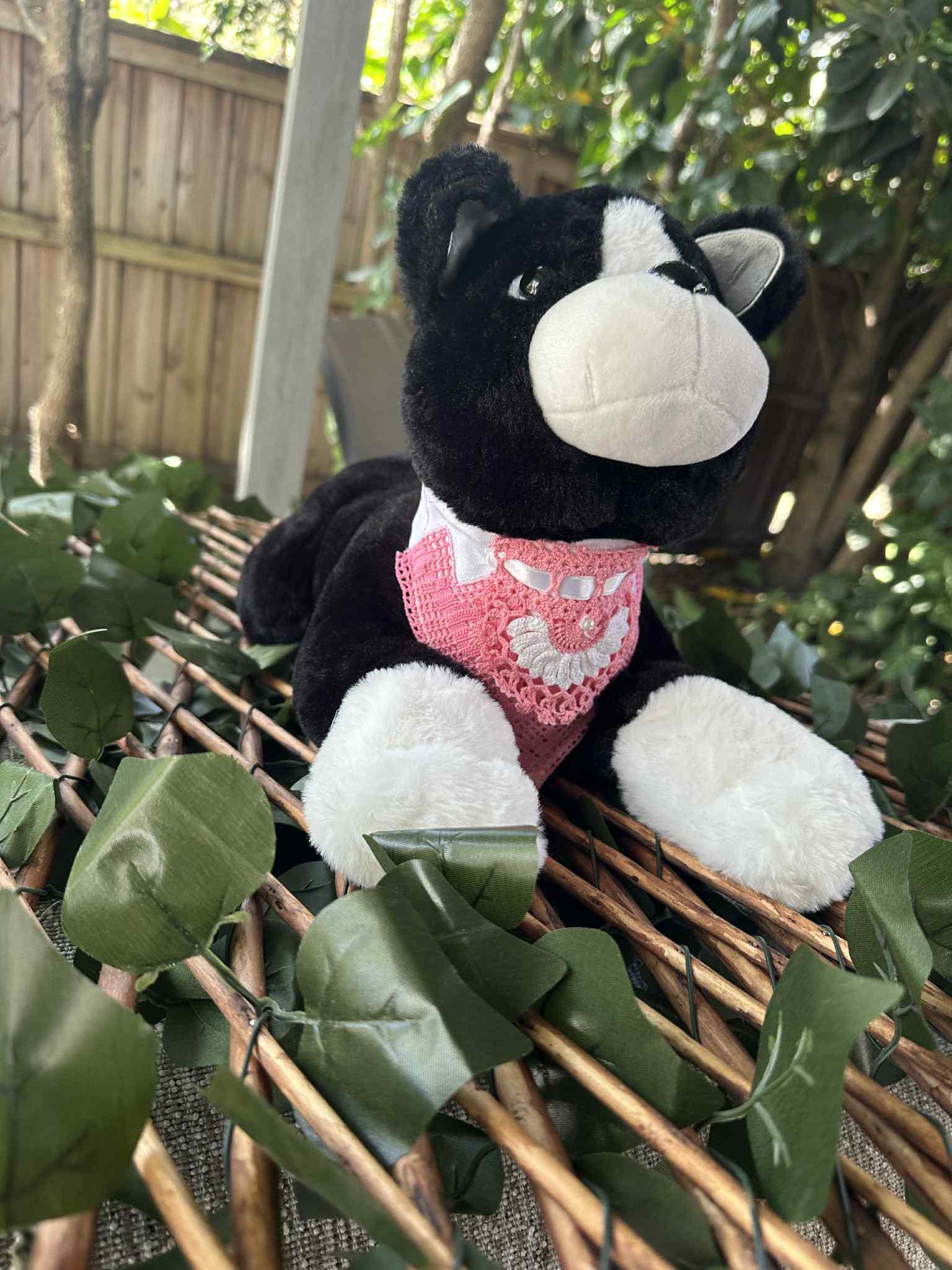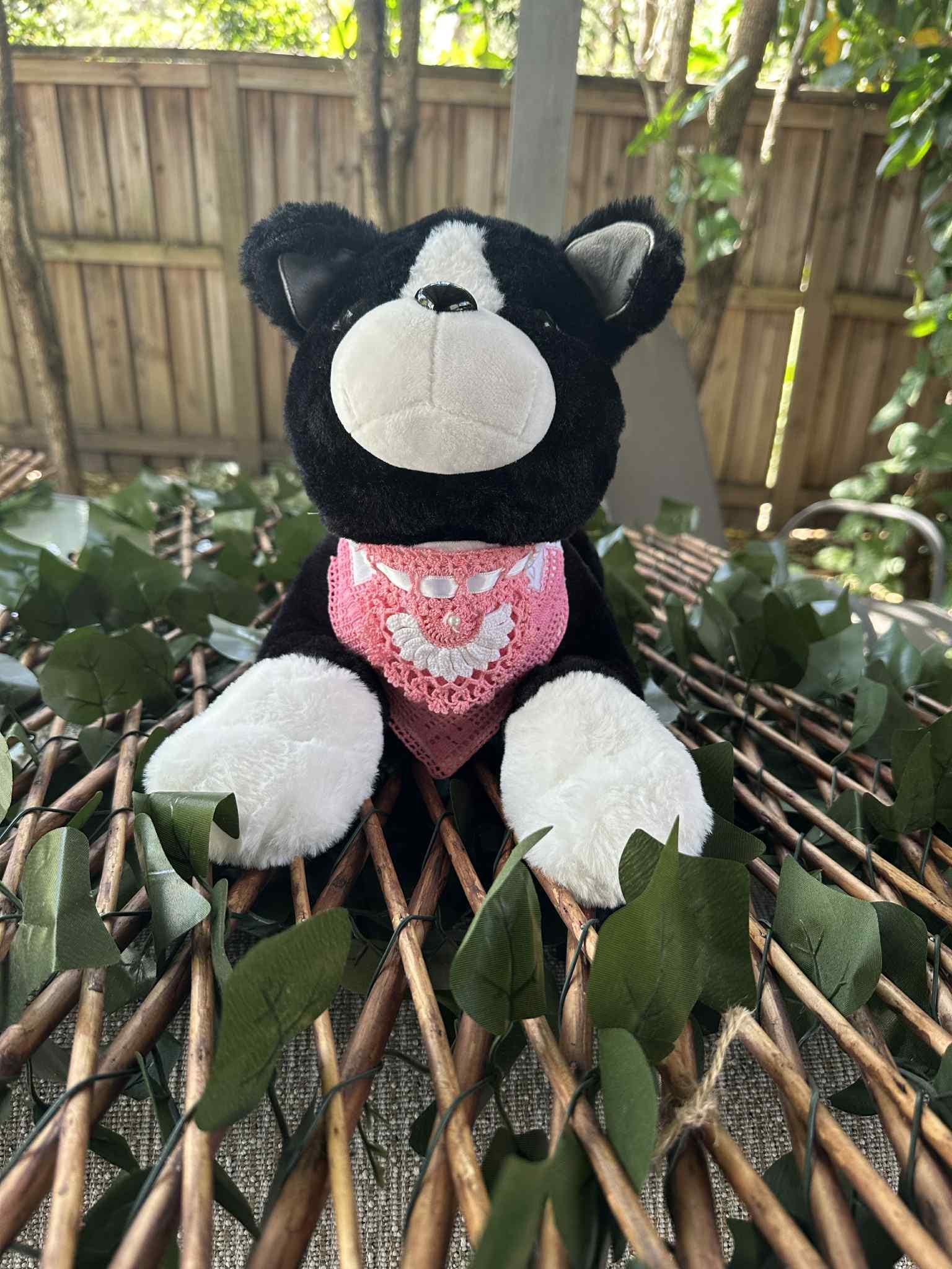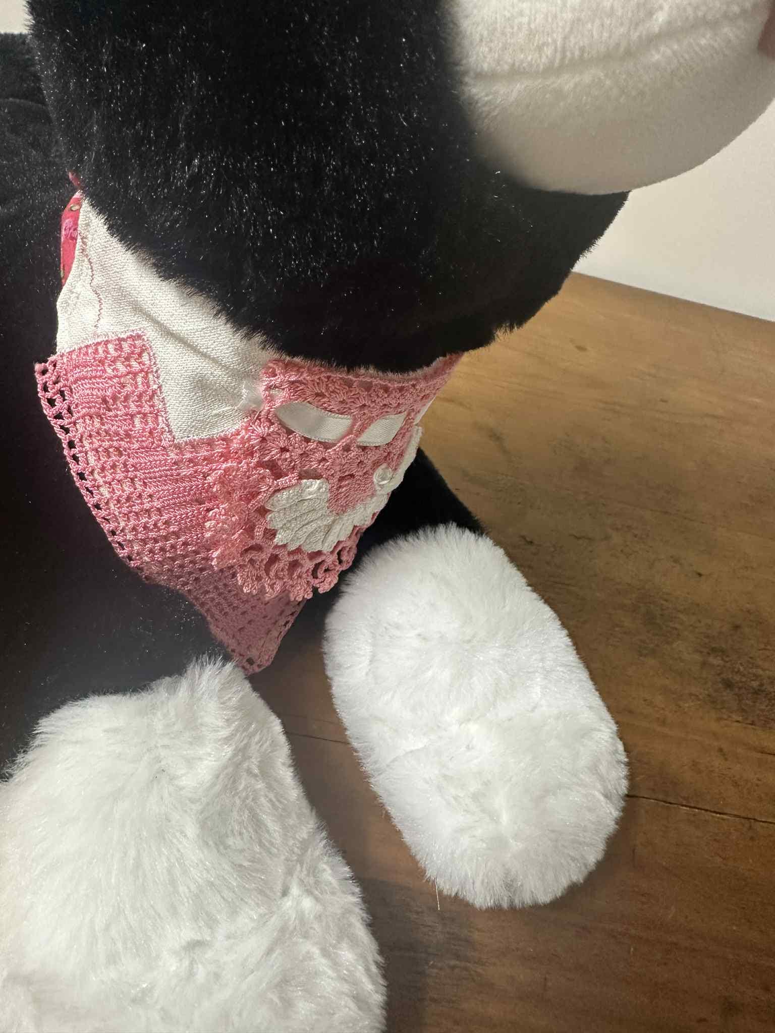 Add a touch of elegance to your furry friend’s look with this handmade crochet lace dog bandana. Crafted from soft pink and white cotton, this piece features a delicate satin ribbon and pearl bead for a festive, elegant touch.