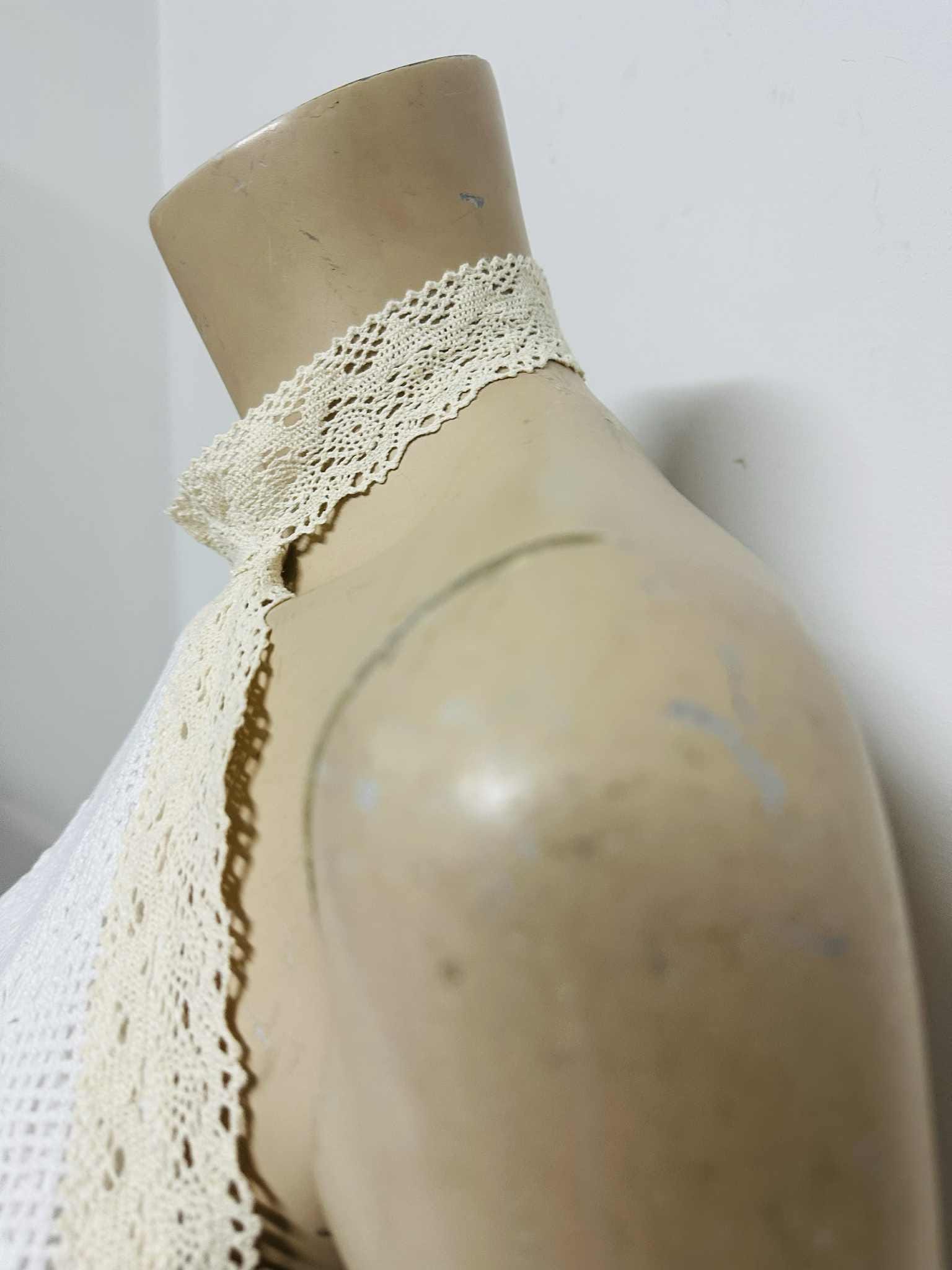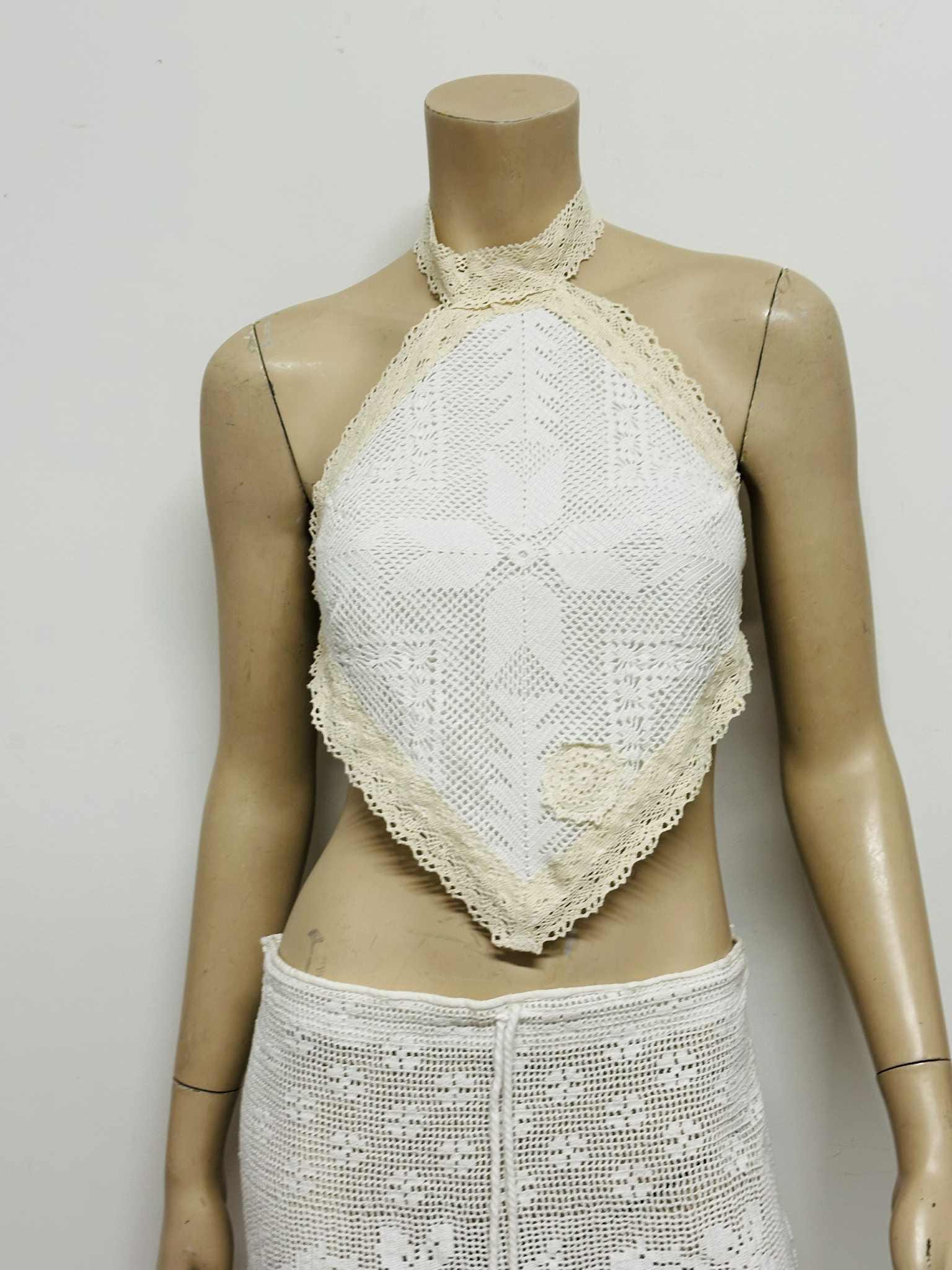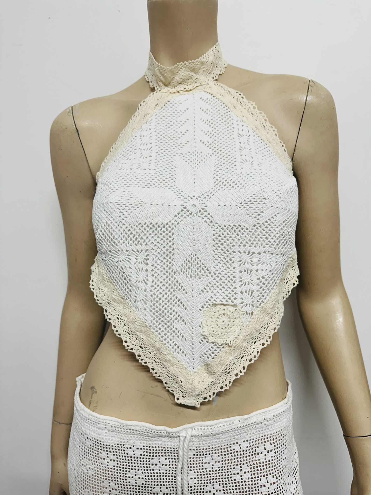 A stunning handmade halter top made from vintage crochet lace, fully lined with soft cotton fabric for comfort and breathability. Each piece is uniquely upcycled, giving it a sustainable charm and timeless beauty — perfect for summer festivals, beachwear, or boho weddings. 🌿🤍