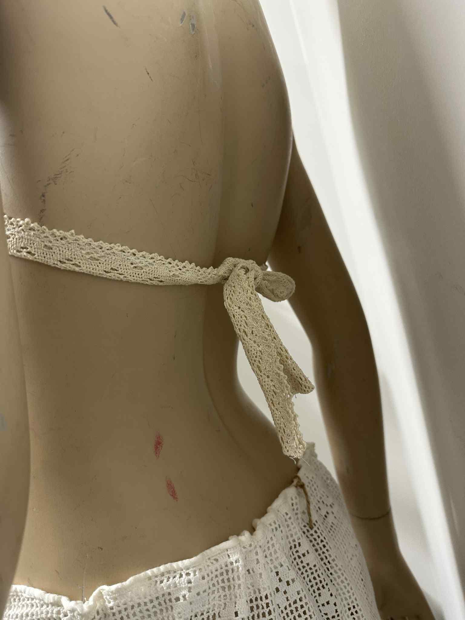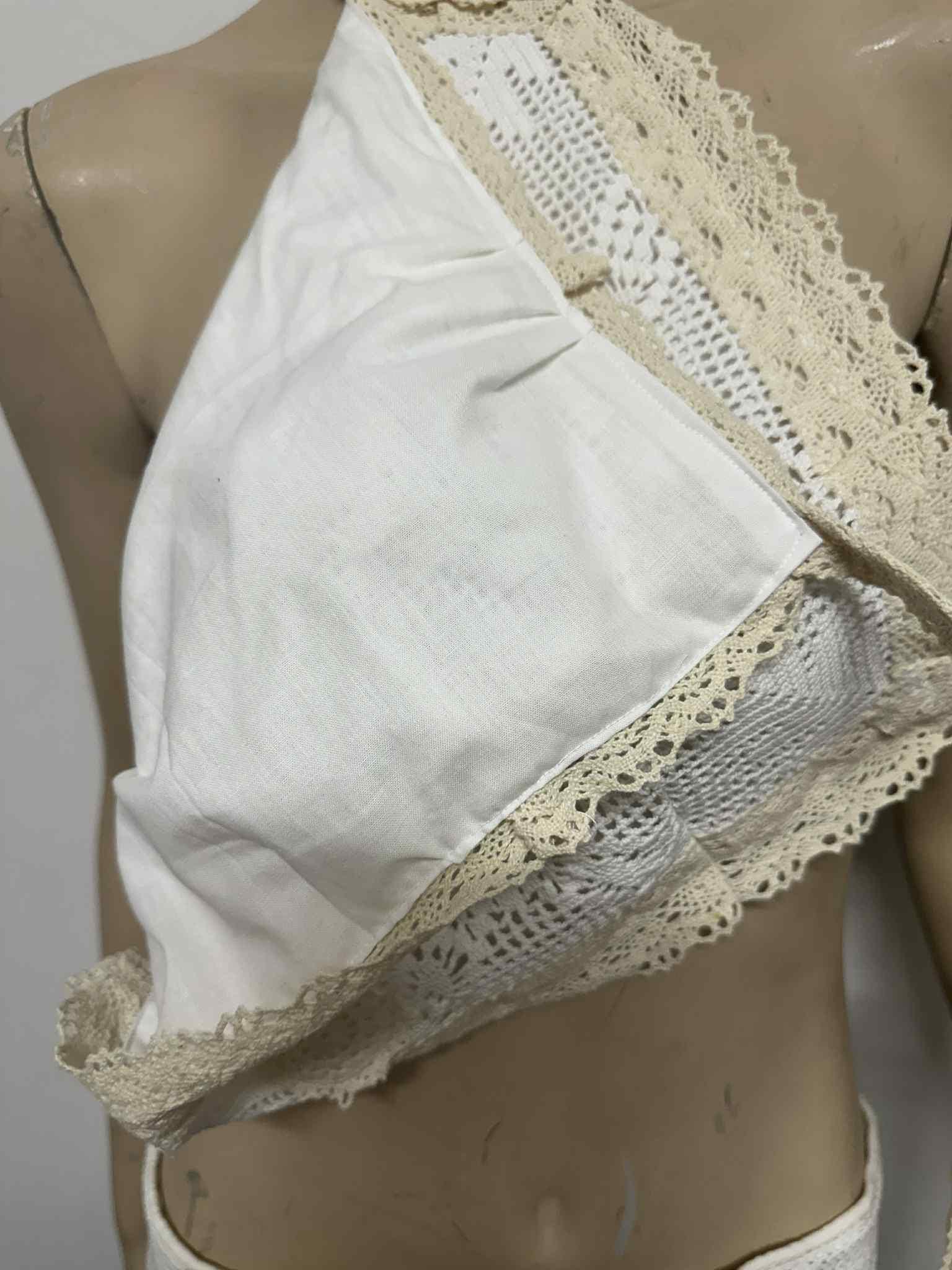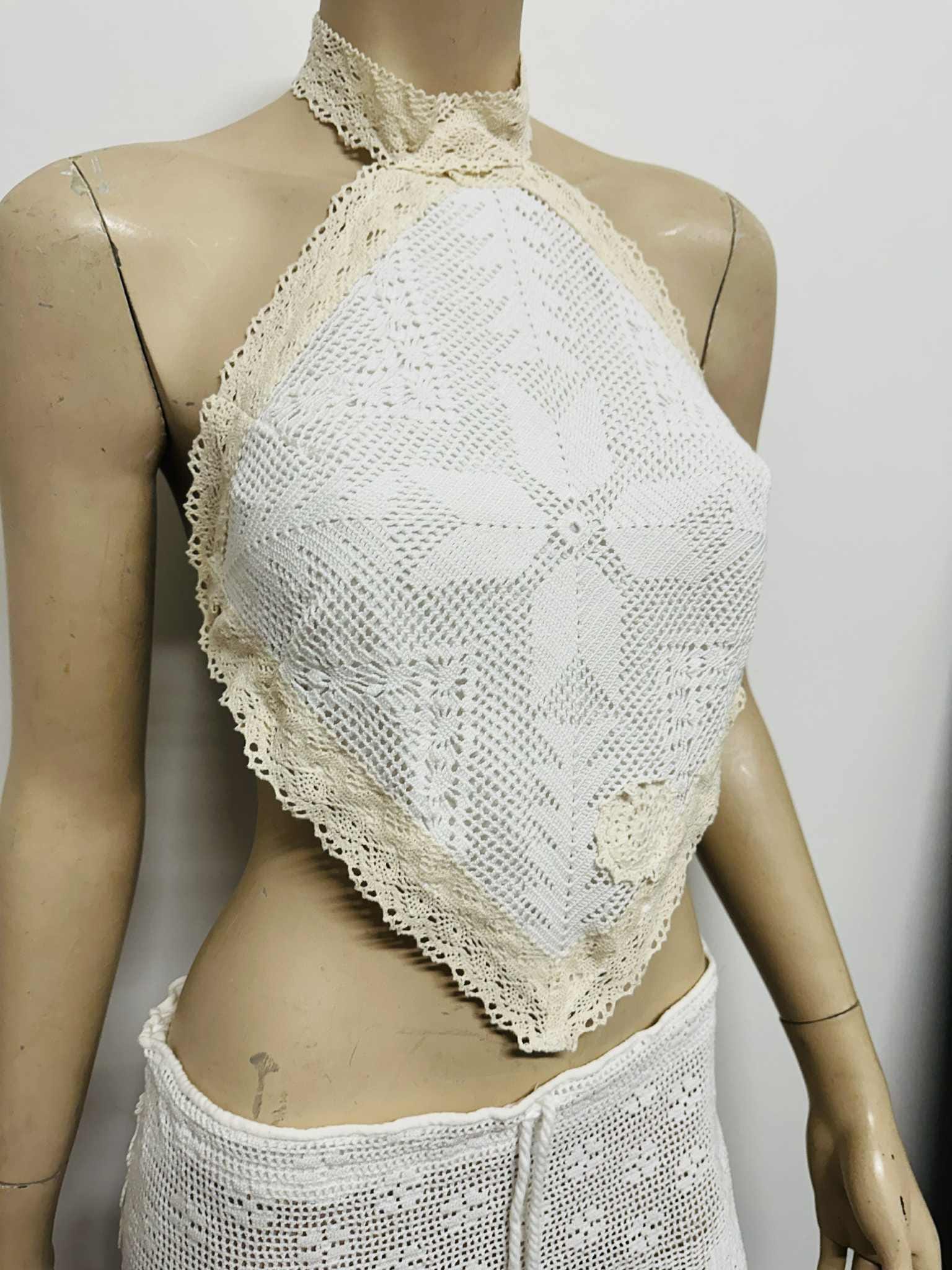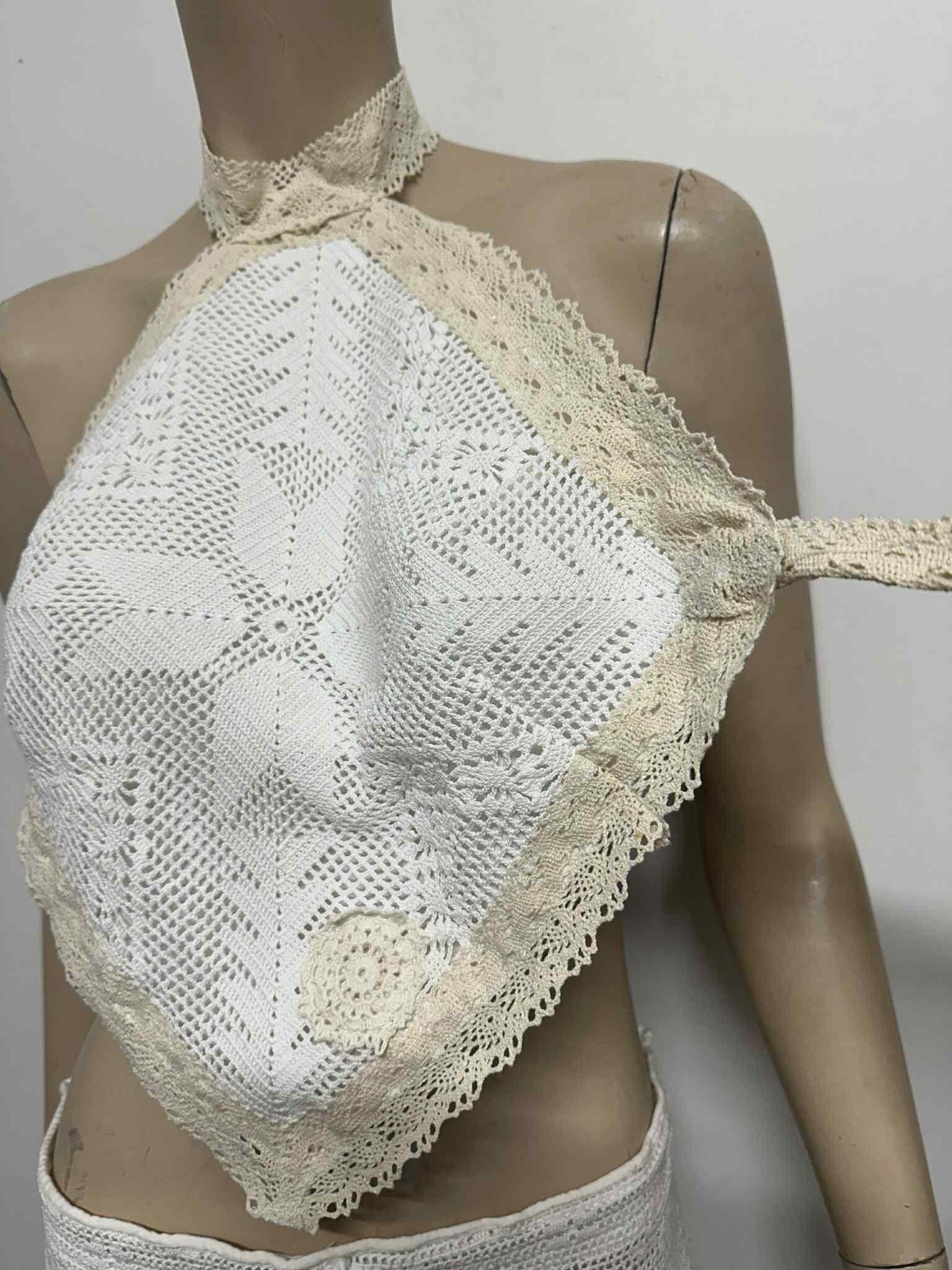 A stunning handmade halter top made from vintage crochet lace, fully lined with soft cotton fabric for comfort and breathability. Each piece is uniquely upcycled, giving it a sustainable charm and timeless beauty — perfect for summer festivals, beachwear, or boho weddings. 🌿🤍