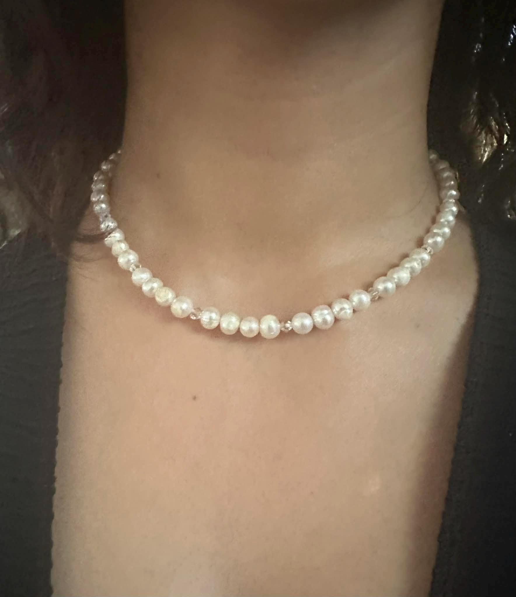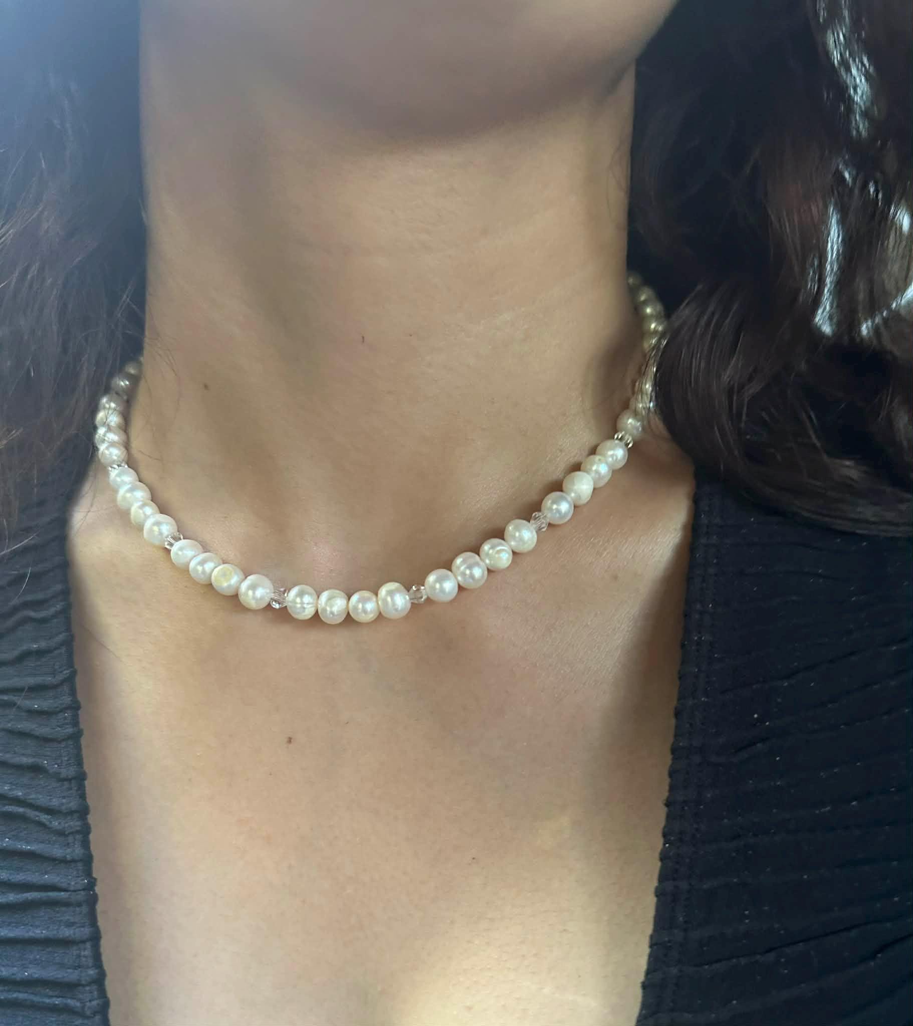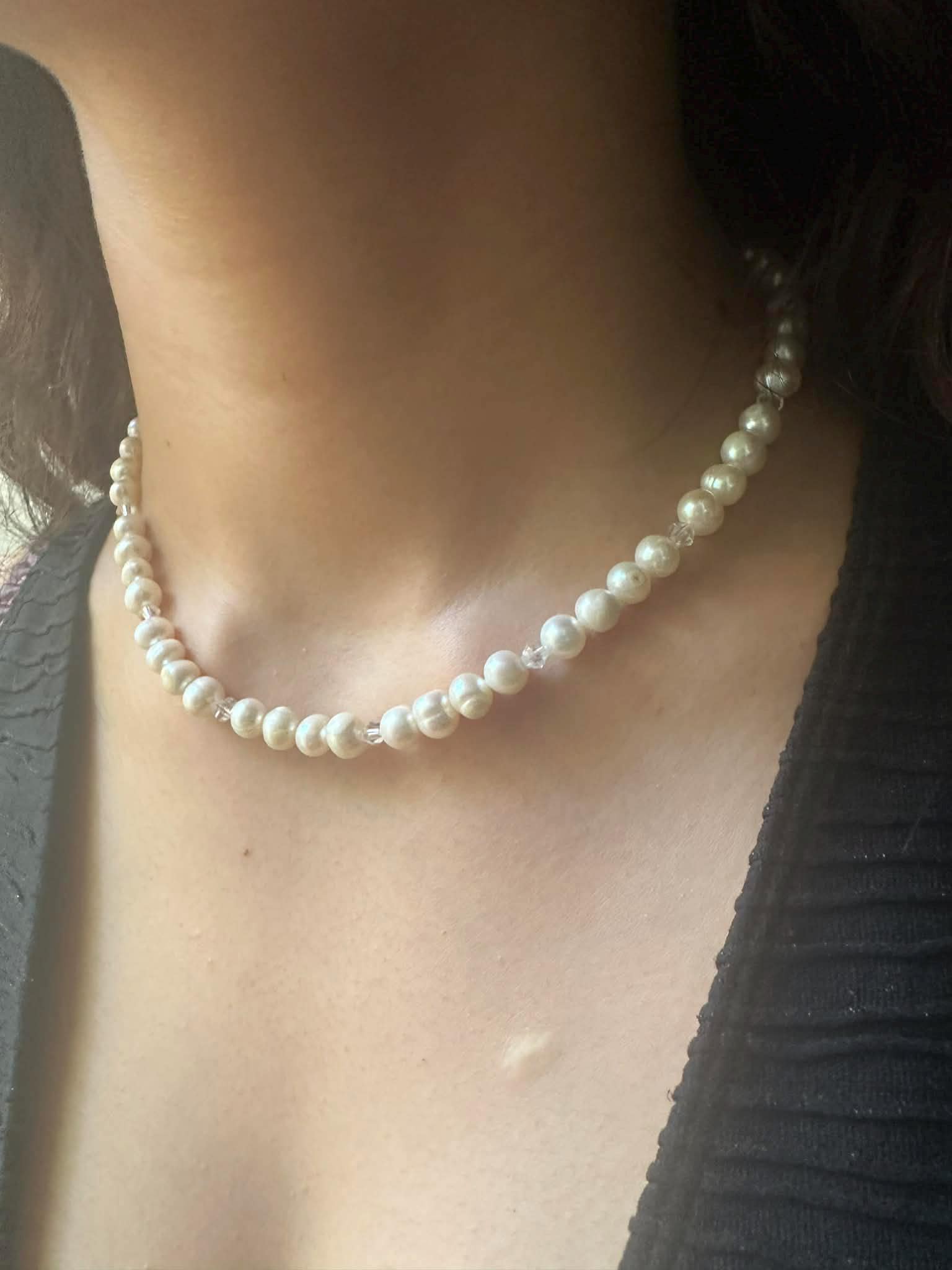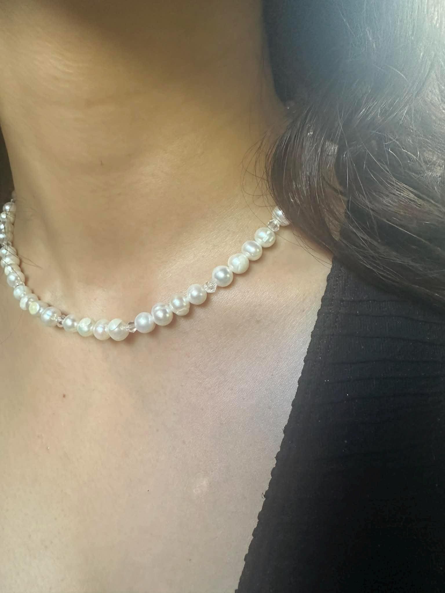 Handmade natural freshwater pearl choker designed with sparkling crystal beads and strung on strong white polyester beading thread specially made for pearl jewelry. Each pearl has its own natural shape and shine, giving the necklace a soft, elegant glow.