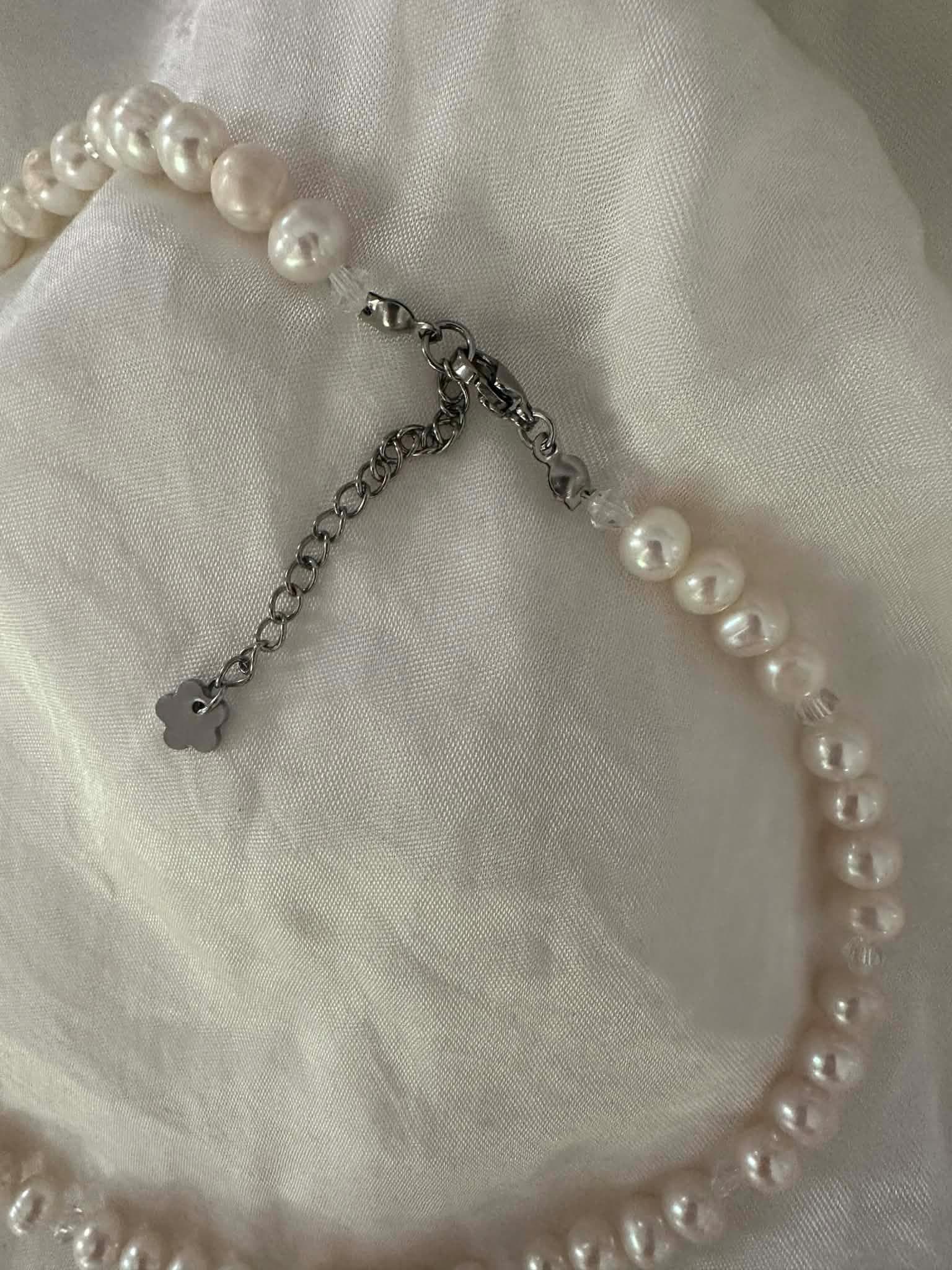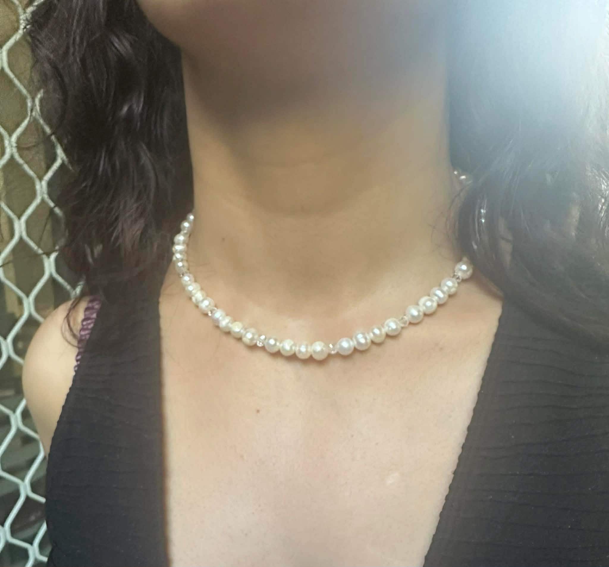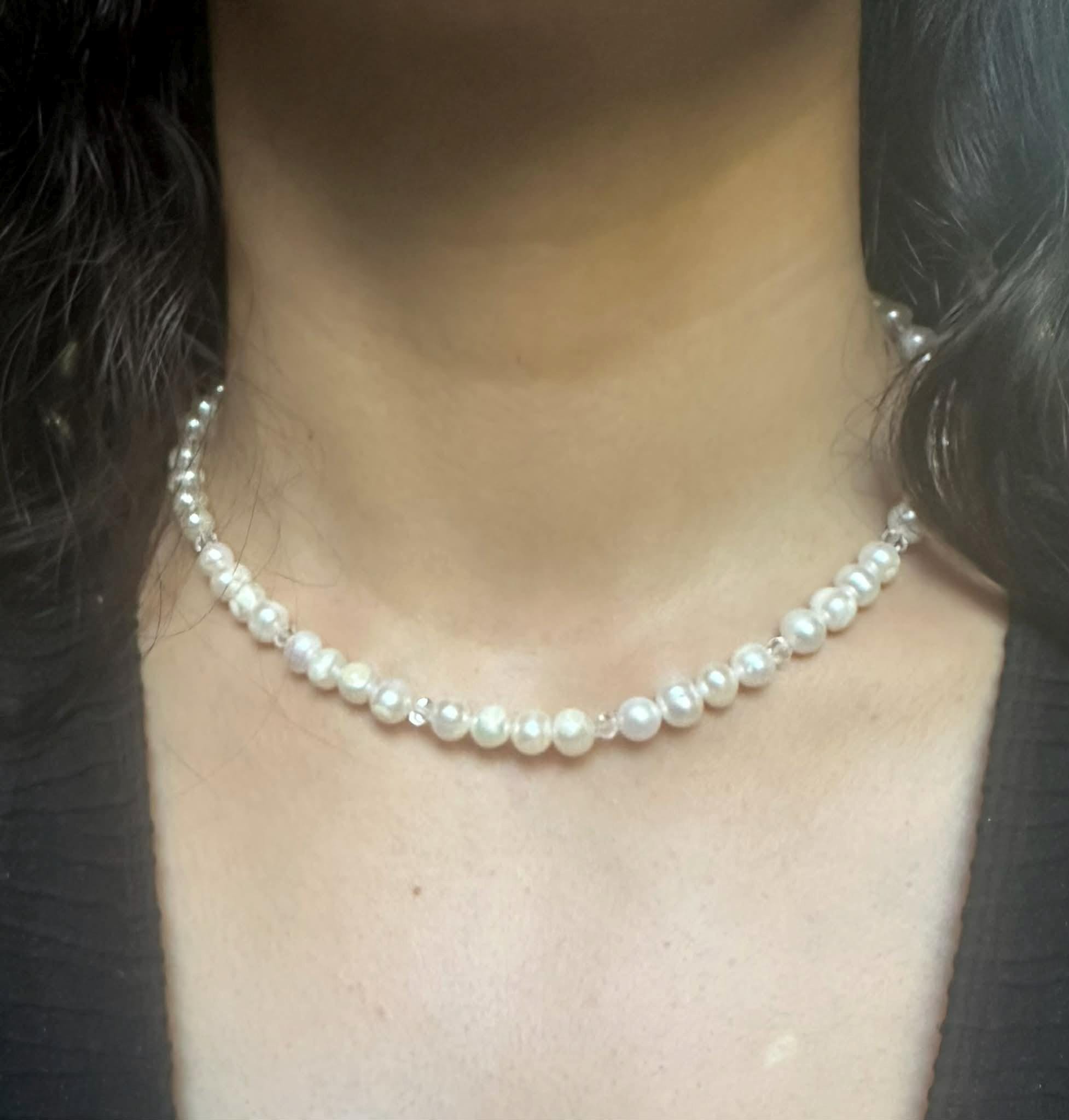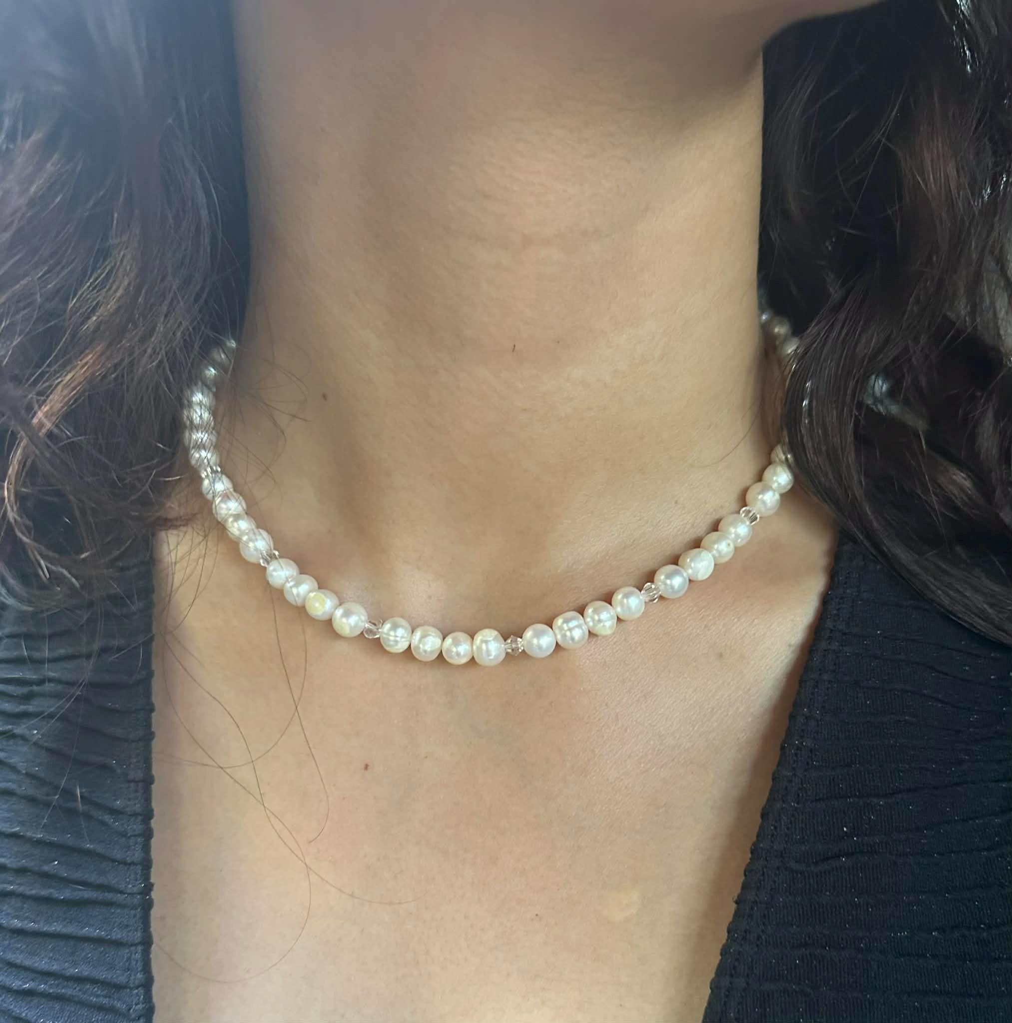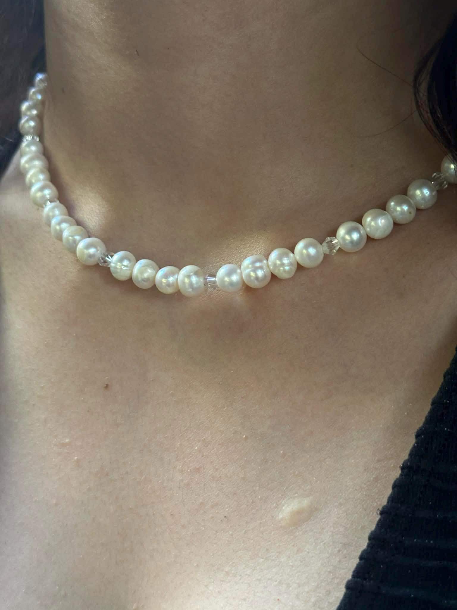 Handmade natural freshwater pearl choker designed with sparkling crystal beads and strung on strong white polyester beading thread specially made for pearl jewelry. Each pearl has its own natural shape and shine, giving the necklace a soft, elegant glow.