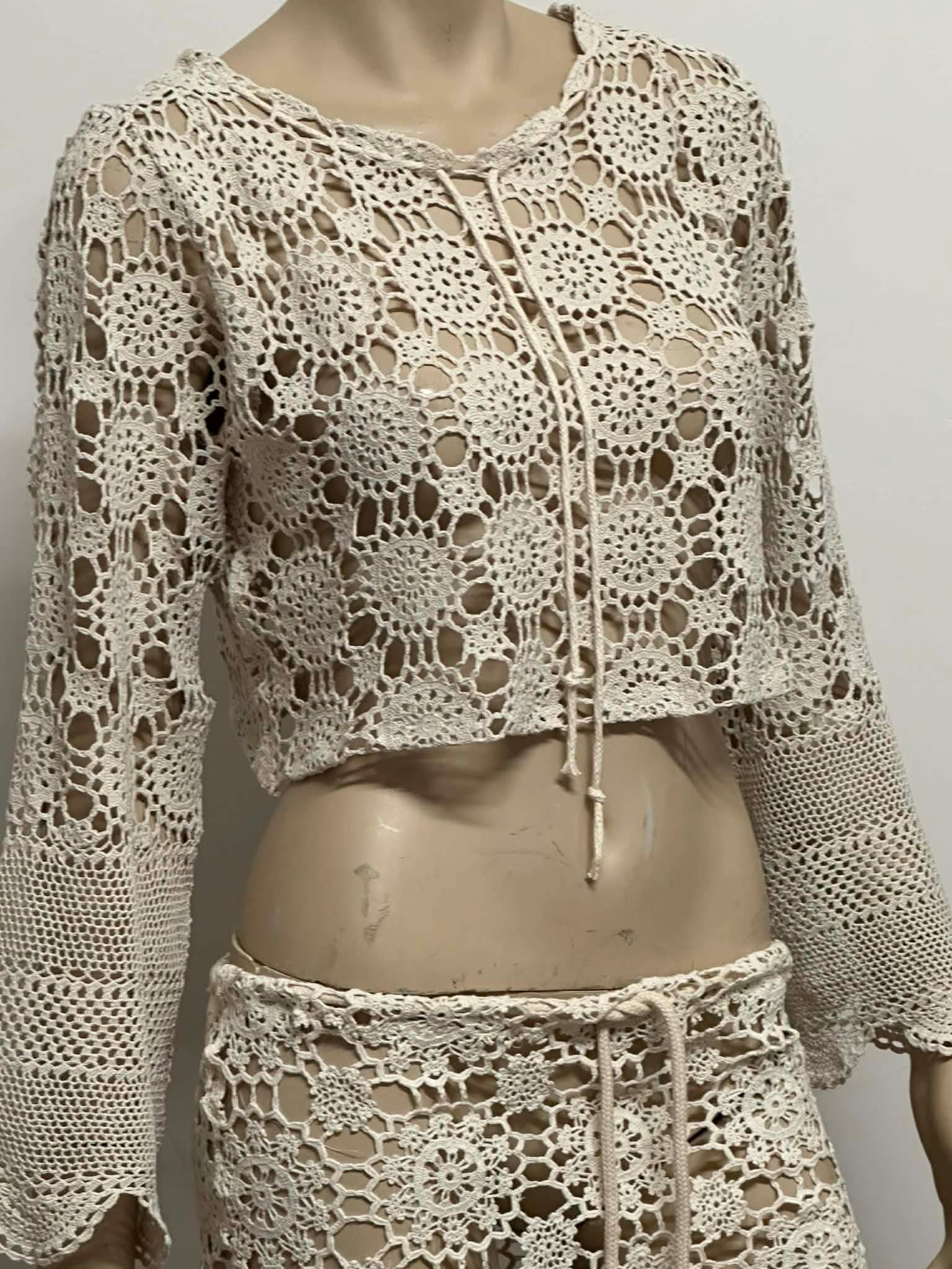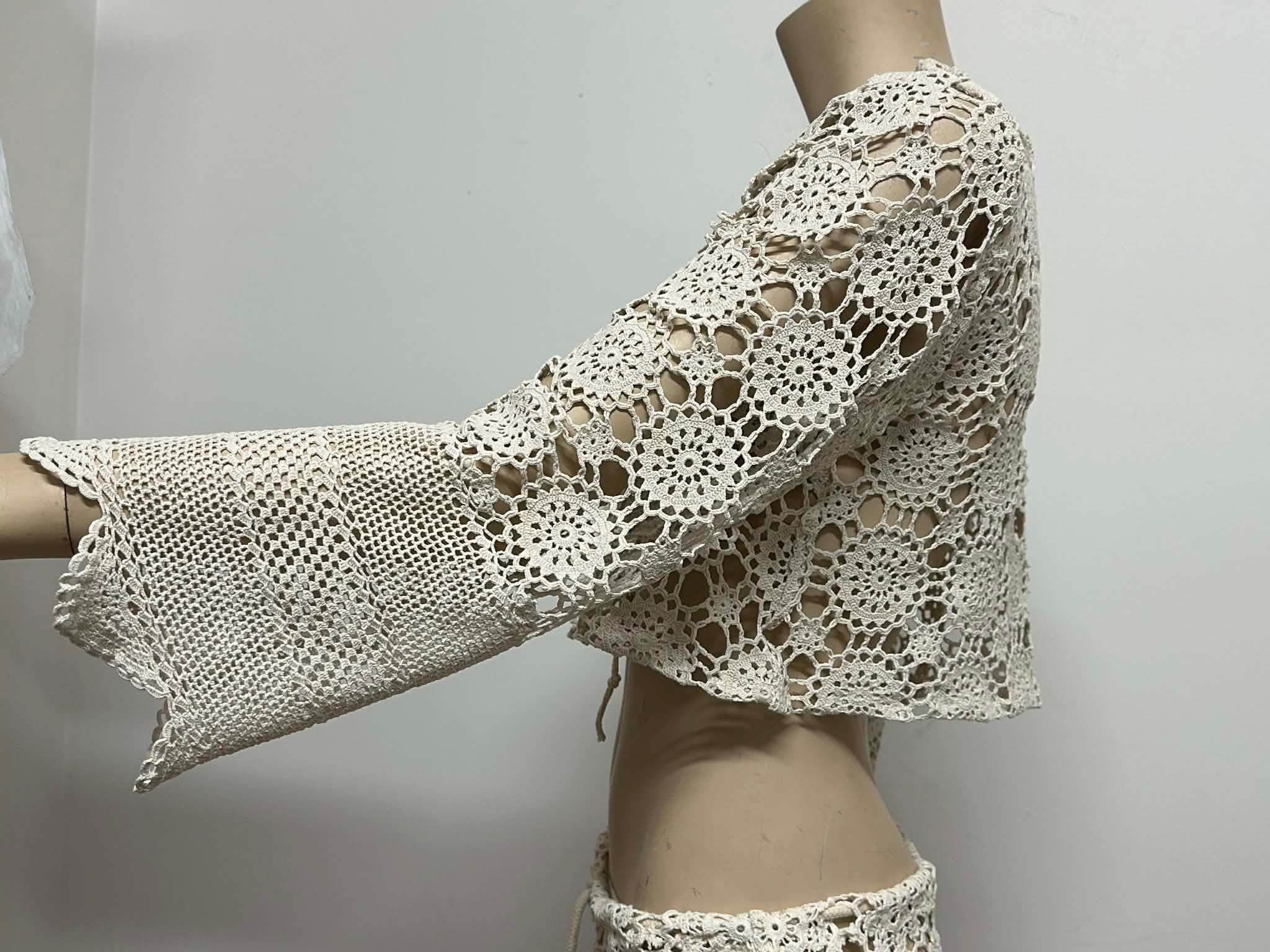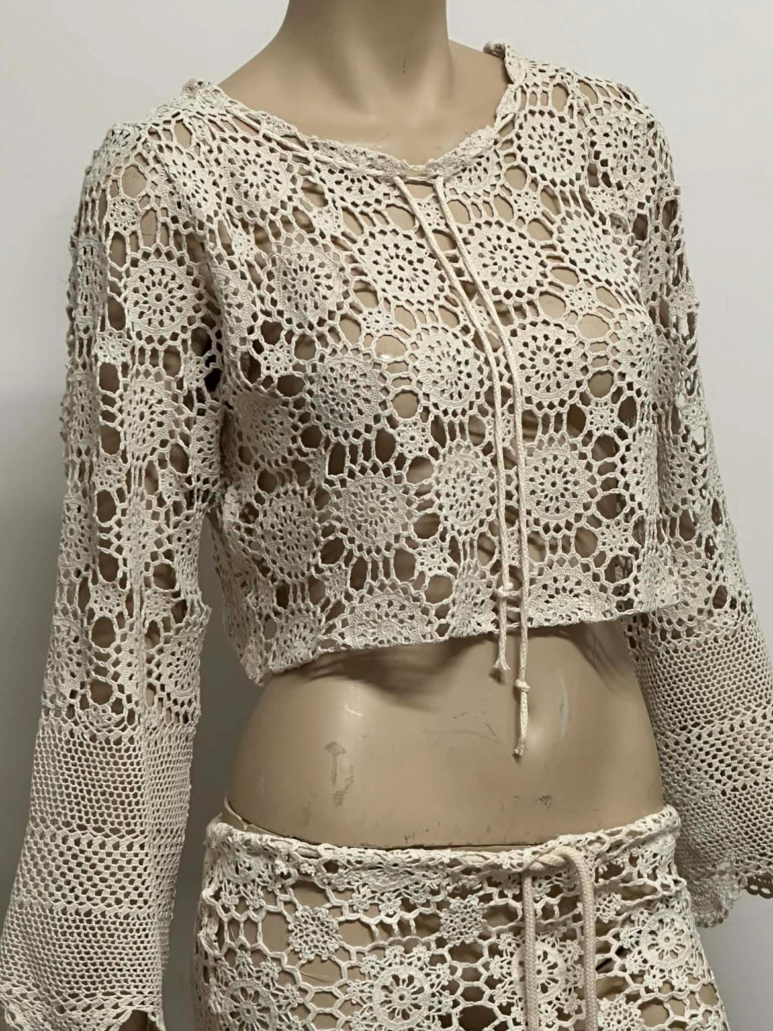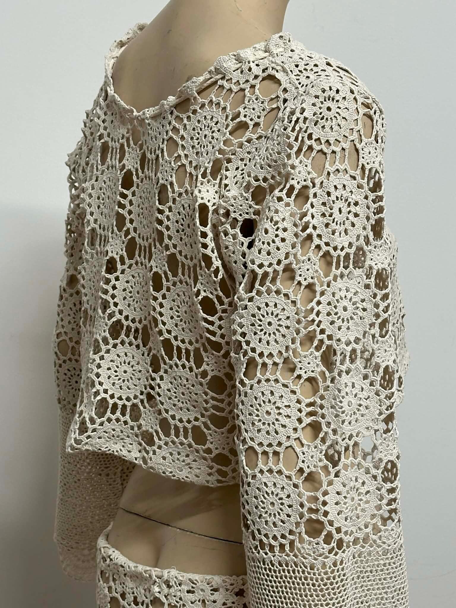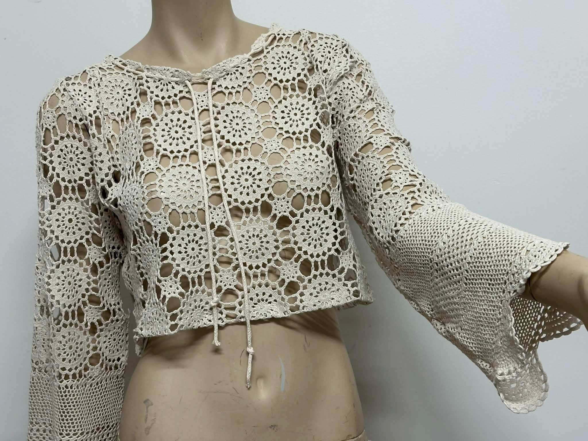 This beige crochet bell-sleeve top is handmade from beautifully preserved vintage lace motifs, giving it a unique boho and romantic beach vibe. The floral lace pattern, airy texture, and wide sleeves create a soft, feminine silhouette perfect for festivals, summer holidays, and beachwear styling.