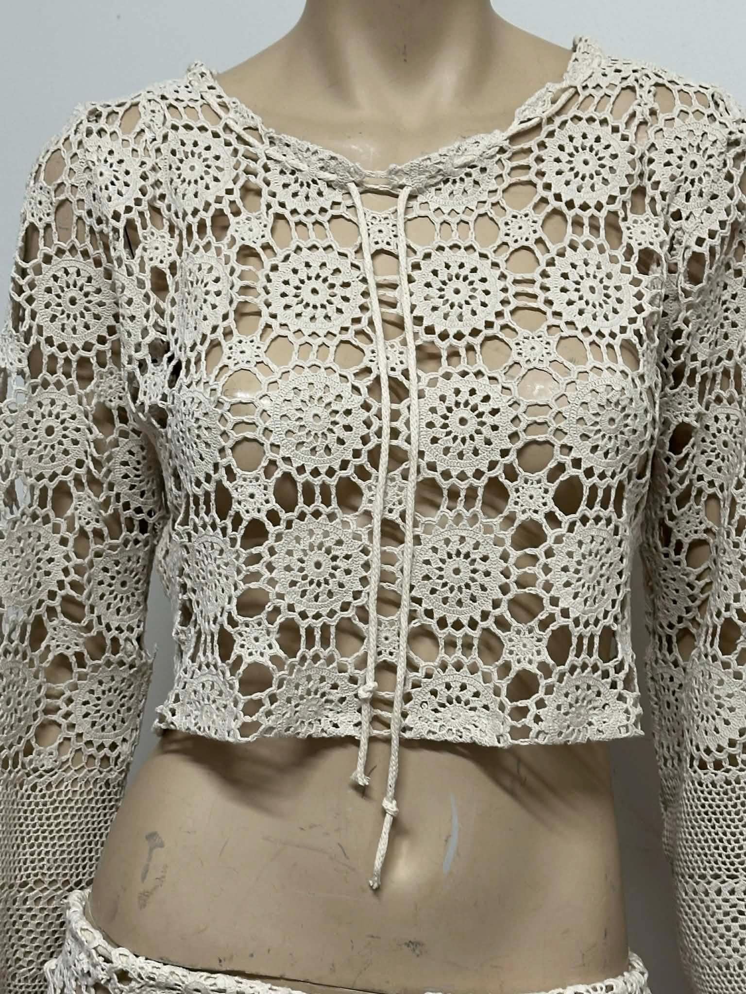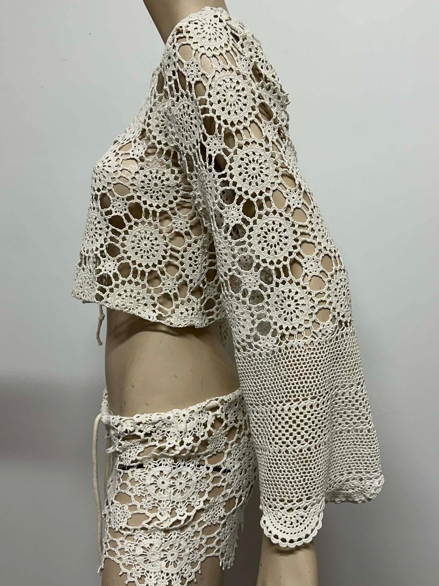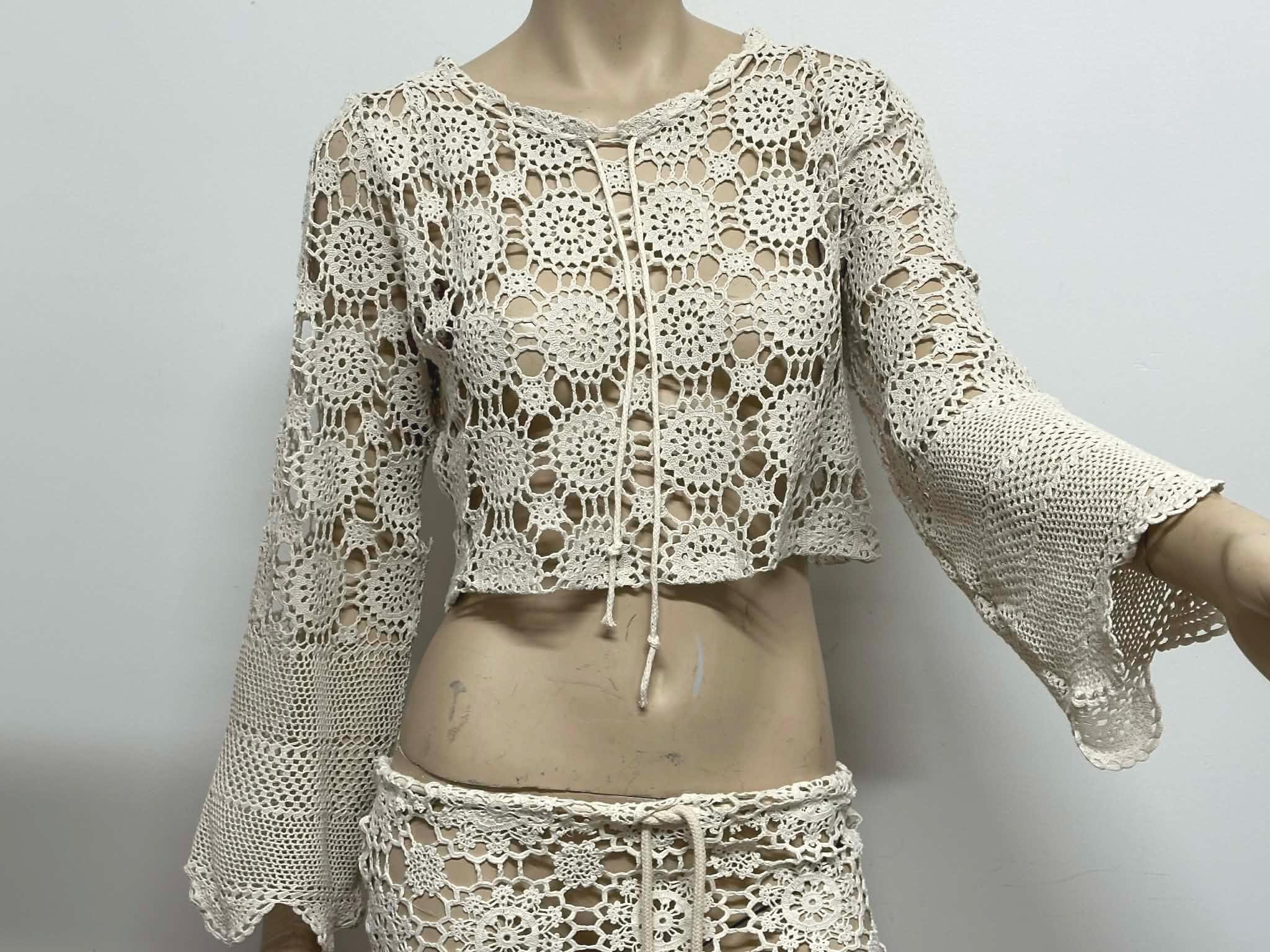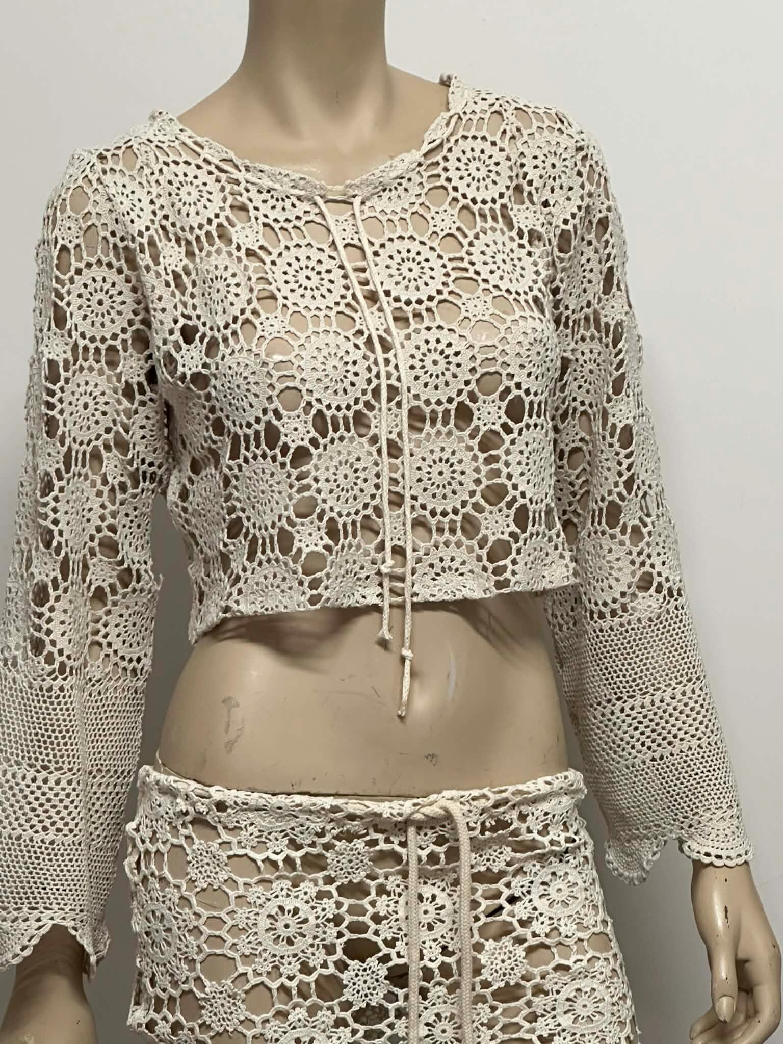 This beige crochet bell-sleeve top is handmade from beautifully preserved vintage lace motifs, giving it a unique boho and romantic beach vibe. The floral lace pattern, airy texture, and wide sleeves create a soft, feminine silhouette perfect for festivals, summer holidays, and beachwear styling.
