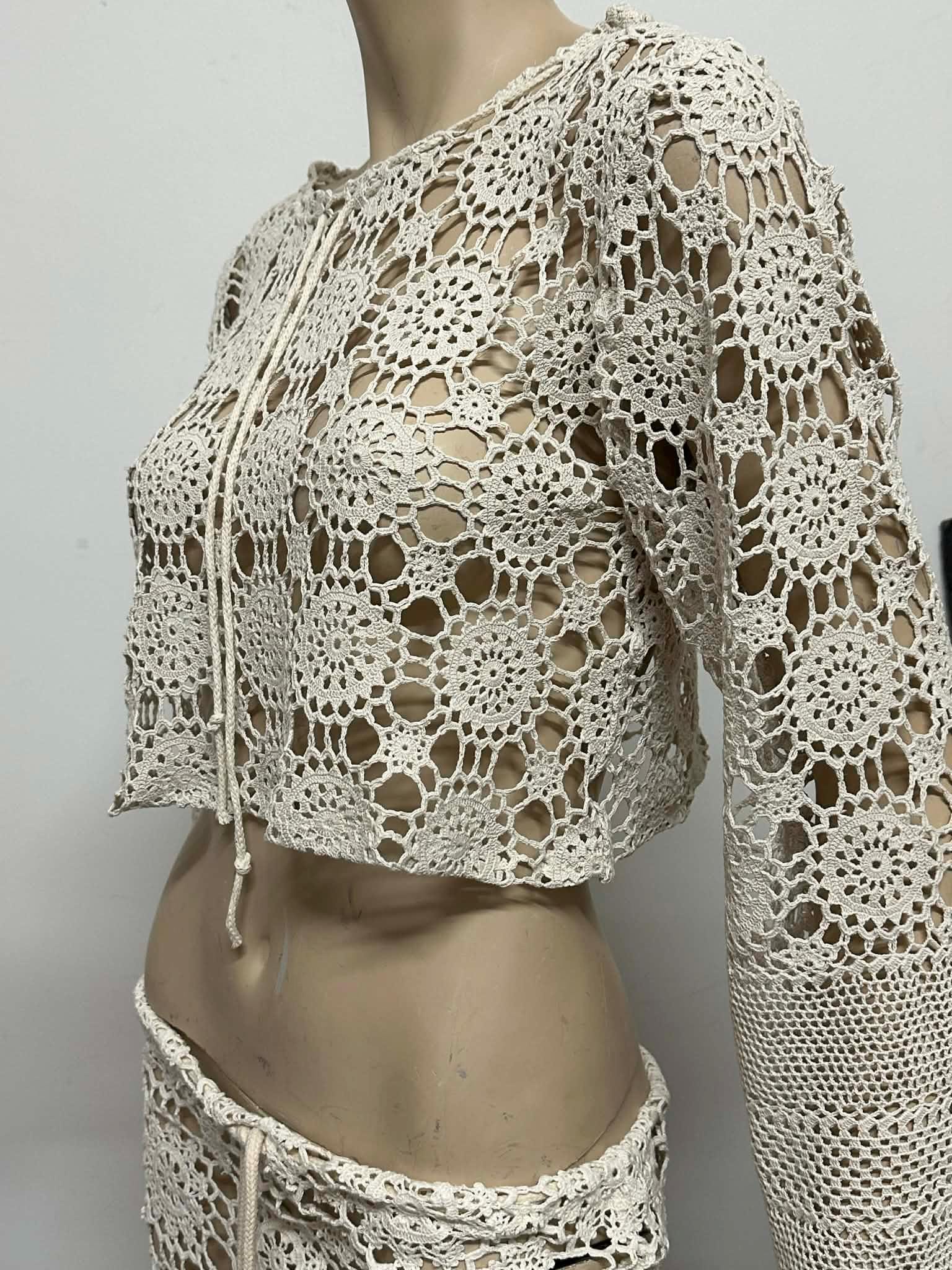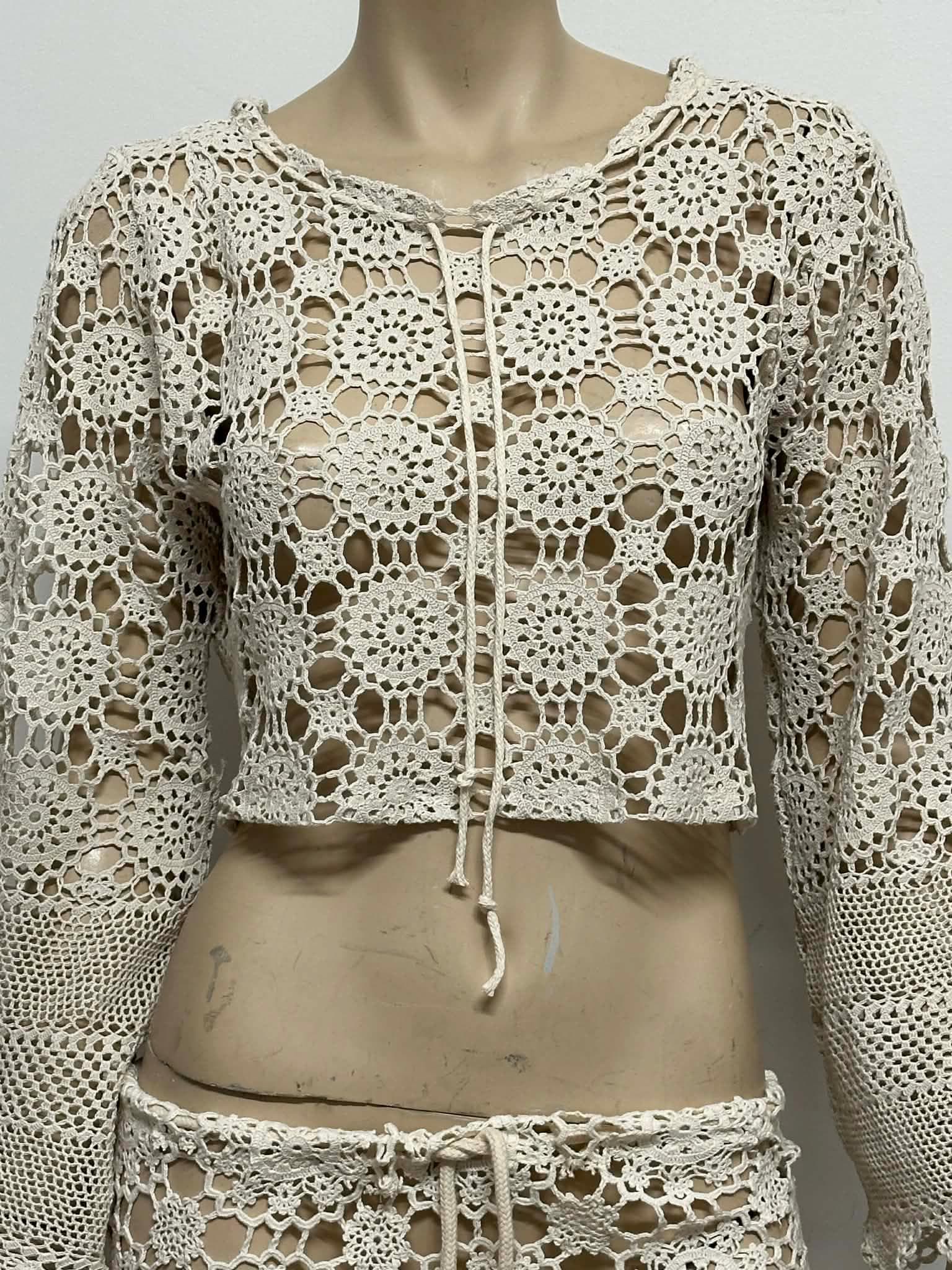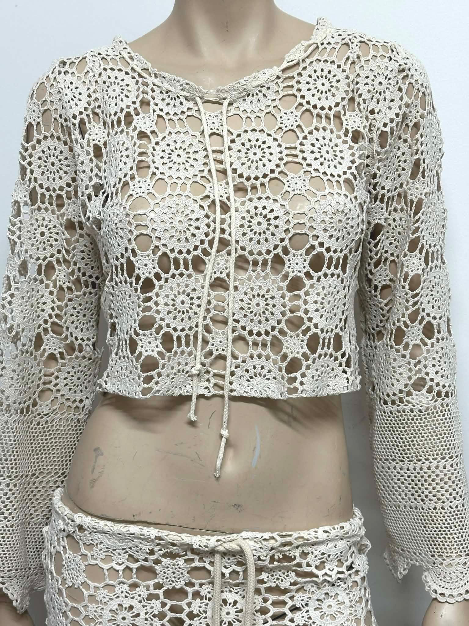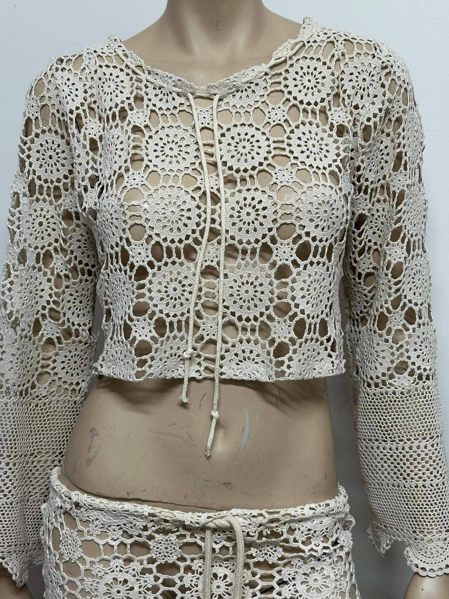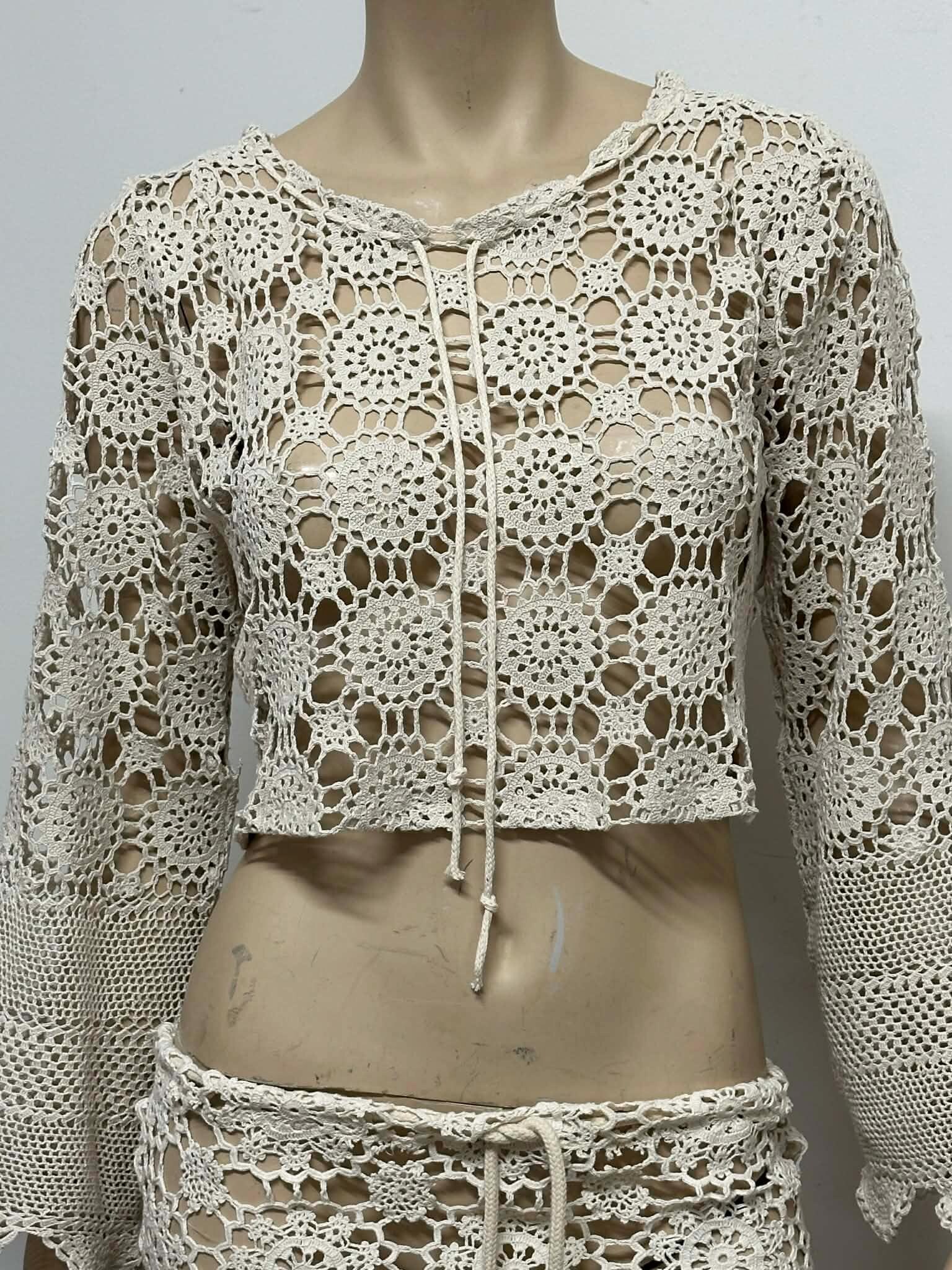 This beige crochet bell-sleeve top is handmade from beautifully preserved vintage lace motifs, giving it a unique boho and romantic beach vibe. The floral lace pattern, airy texture, and wide sleeves create a soft, feminine silhouette perfect for festivals, summer holidays, and beachwear styling.