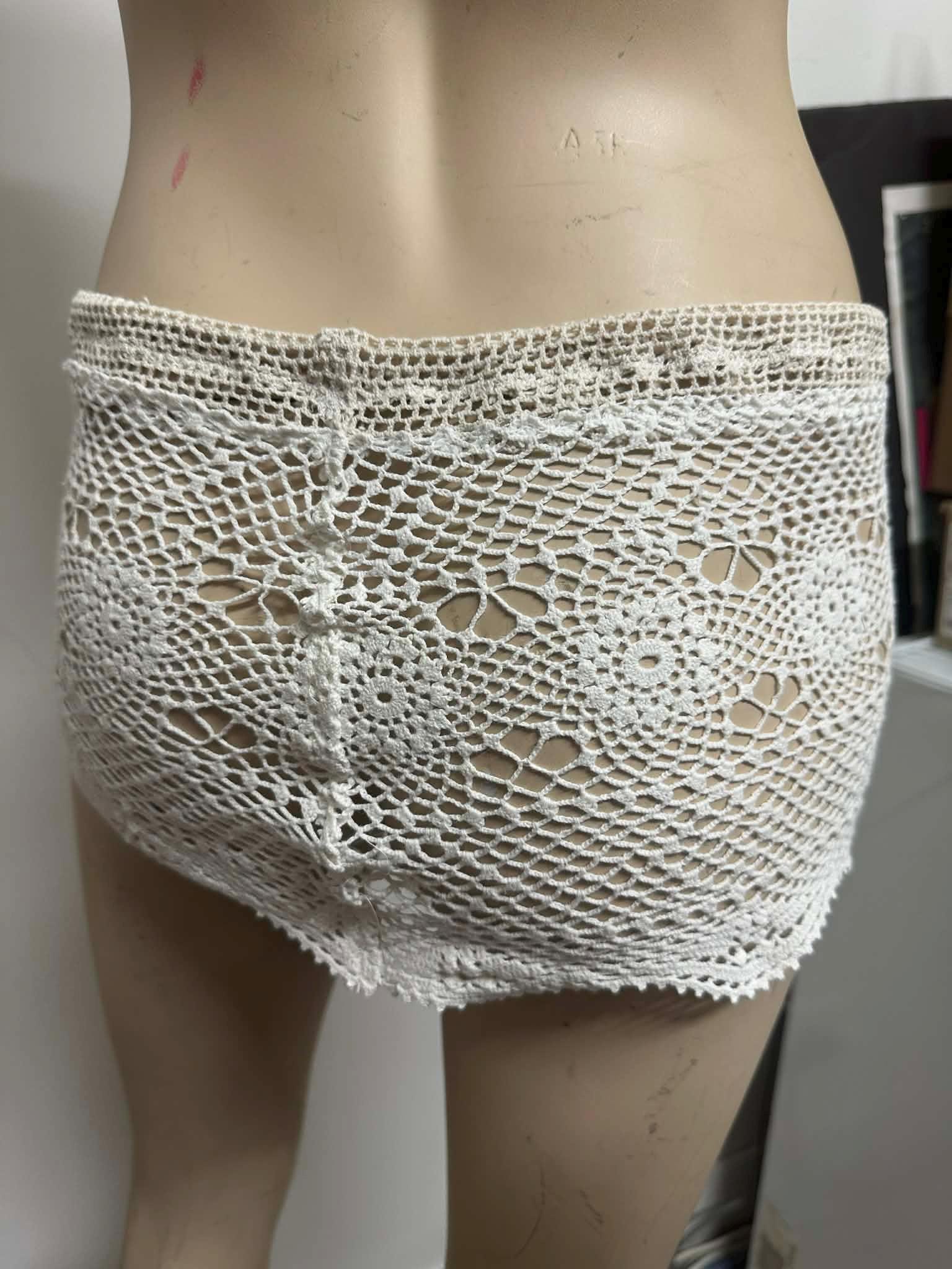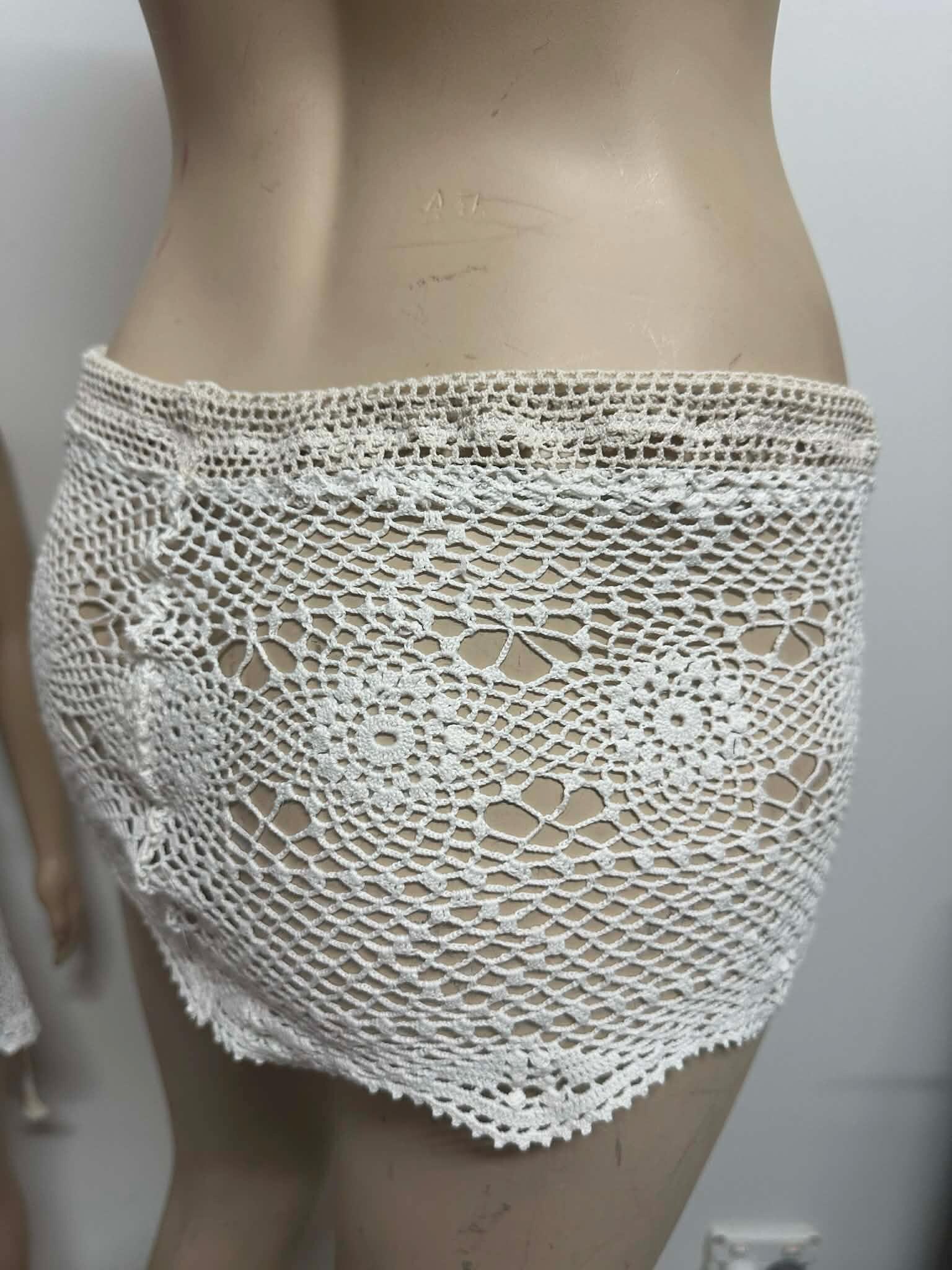 This beautiful handmade mini skirt is crafted from two-tone vintage crochet lace — a soft blend of off-white and beige lace pieces carefully combined to create a unique beach-ready look.